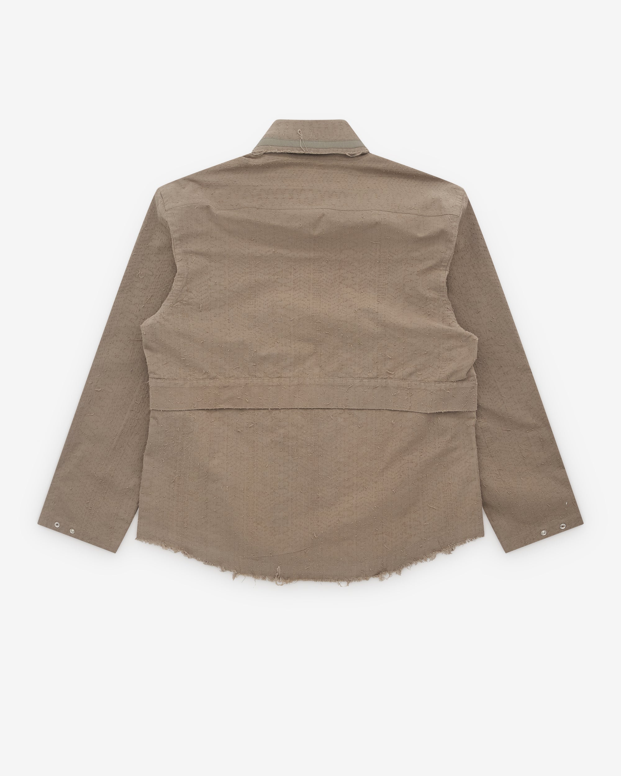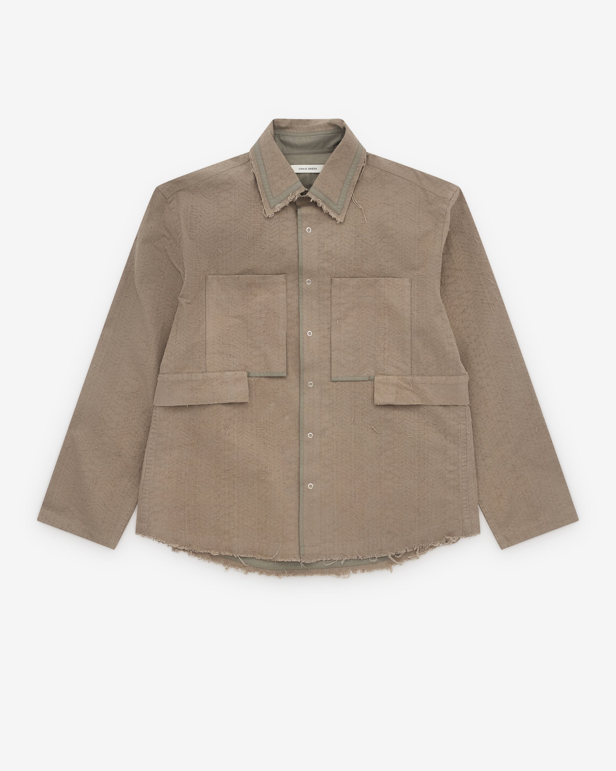 Classic shirting collarChest pocketsFront button closureCurved hemTextured fabric