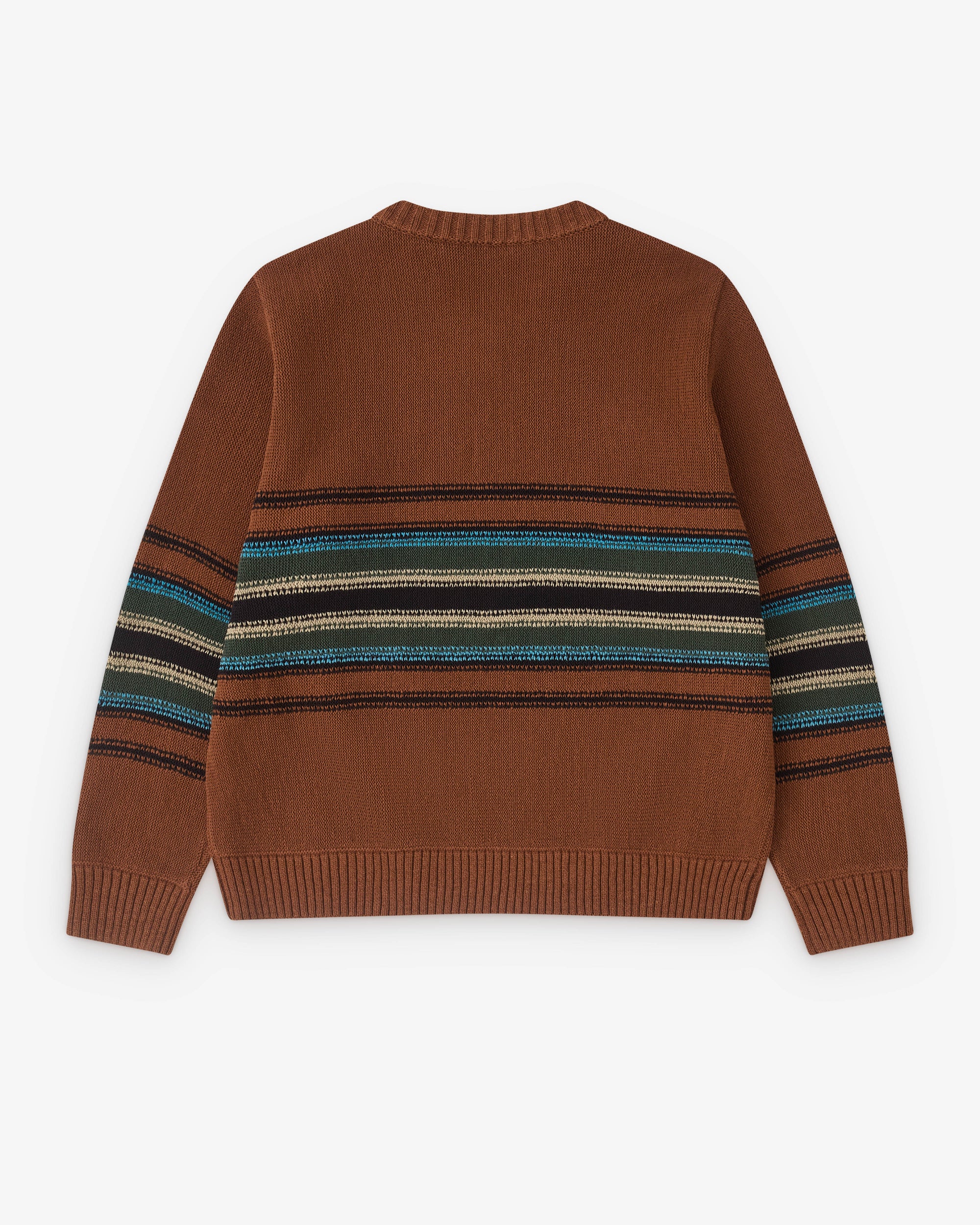 Ribbed v-neck lineRibbed cuffs and hemStriped taping knit across garmentLong sleeves