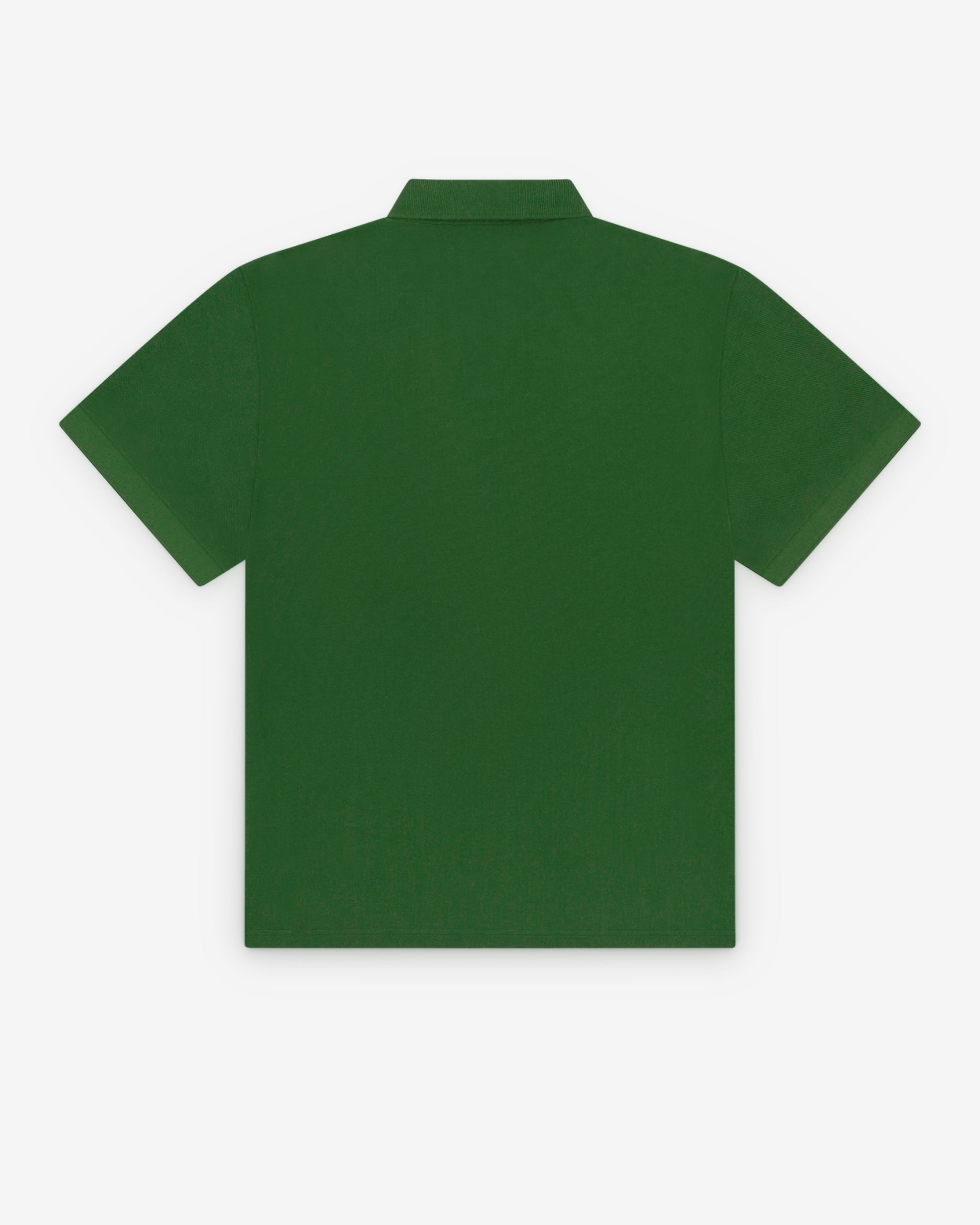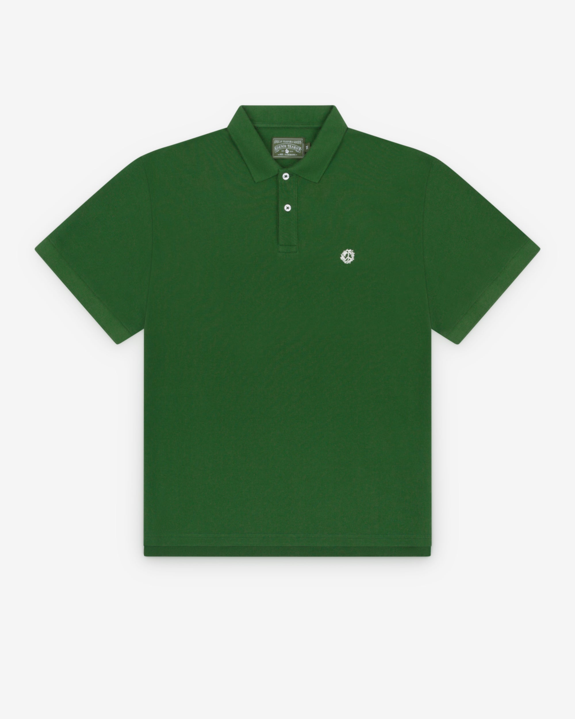 Classic polo collarButton placket closureShort sleevesEmbroidered peace wreath at chestStraight hem