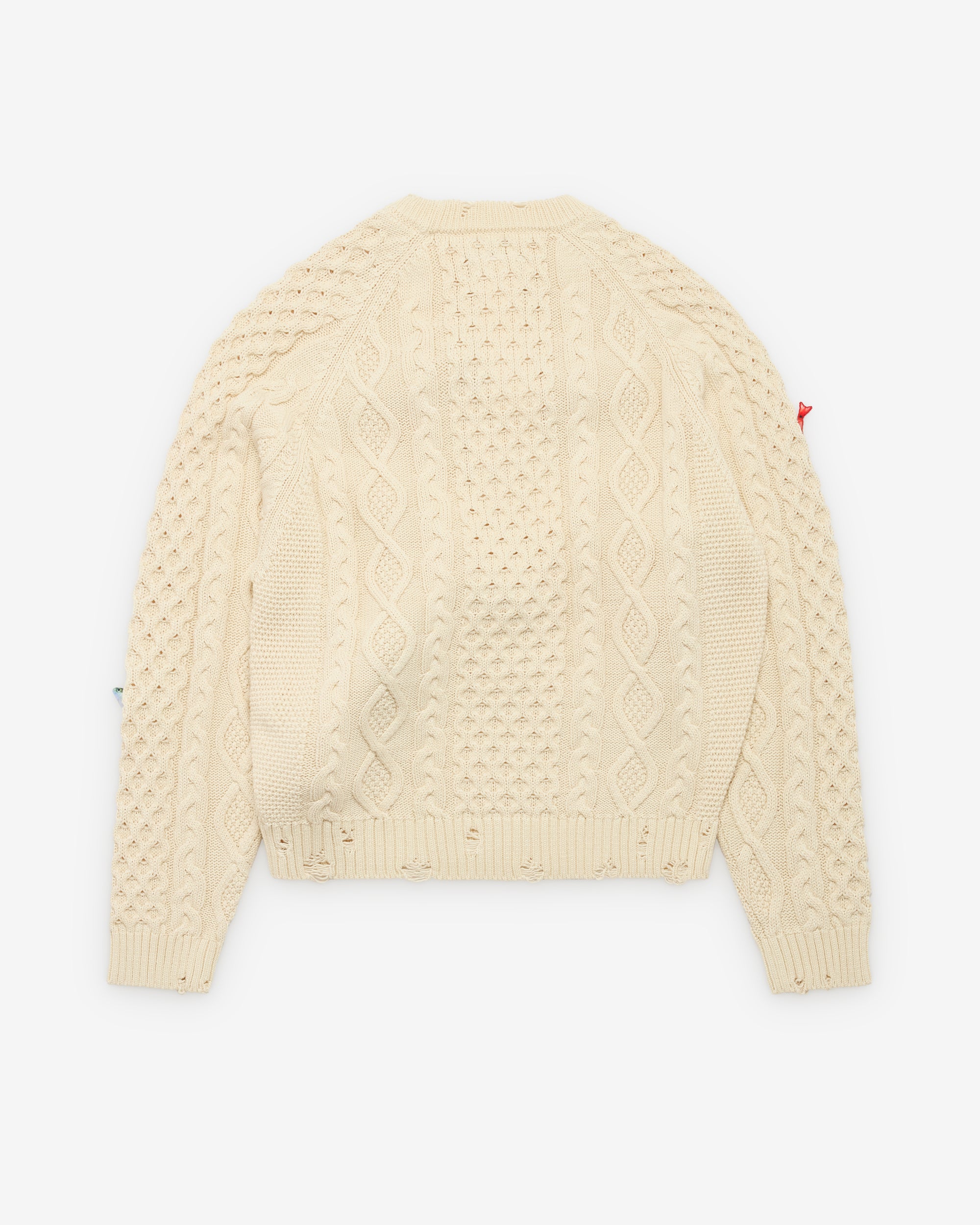 Crew necklineDistressed fabric throughoutAttached fish charms Cable knit Drop shoulders