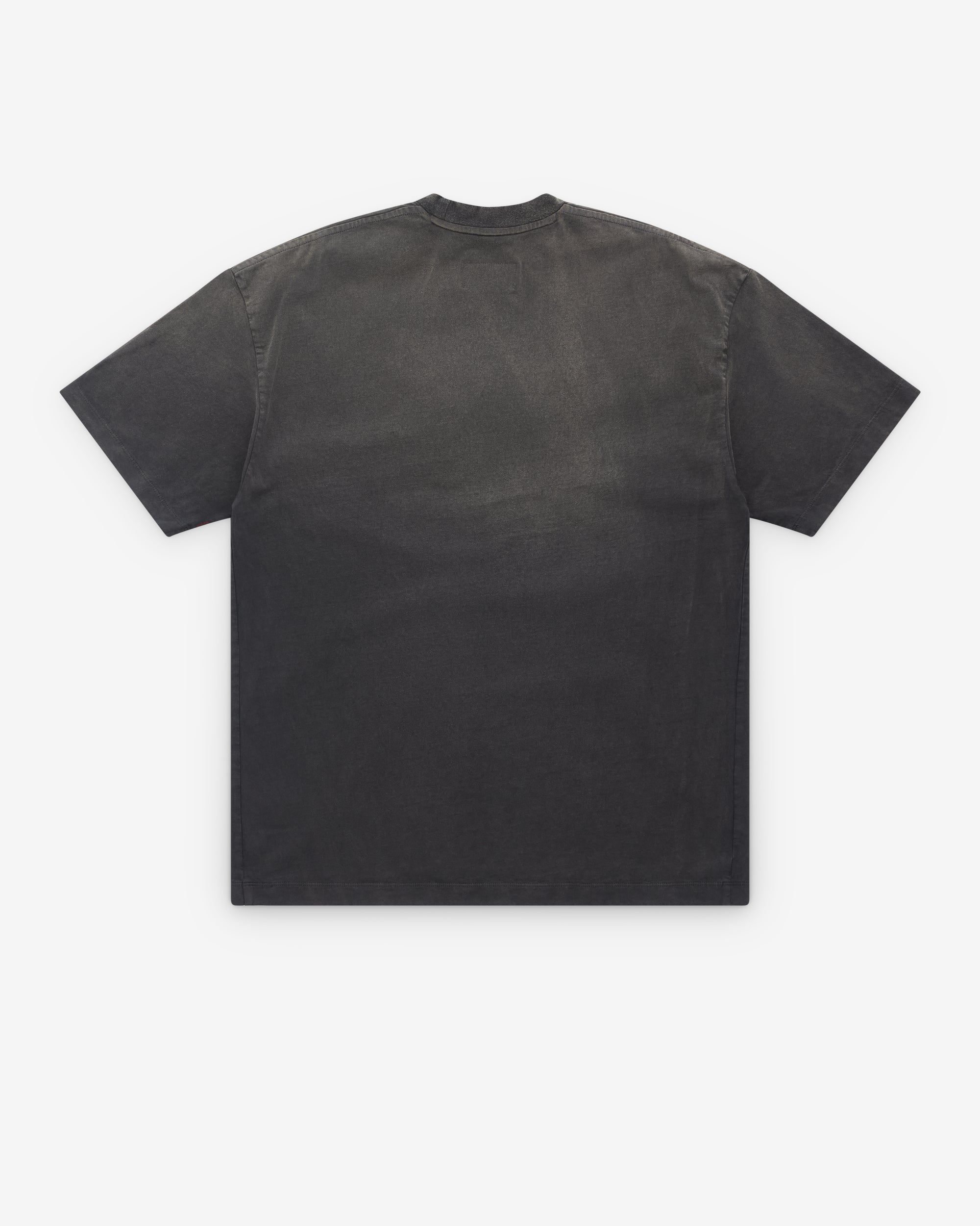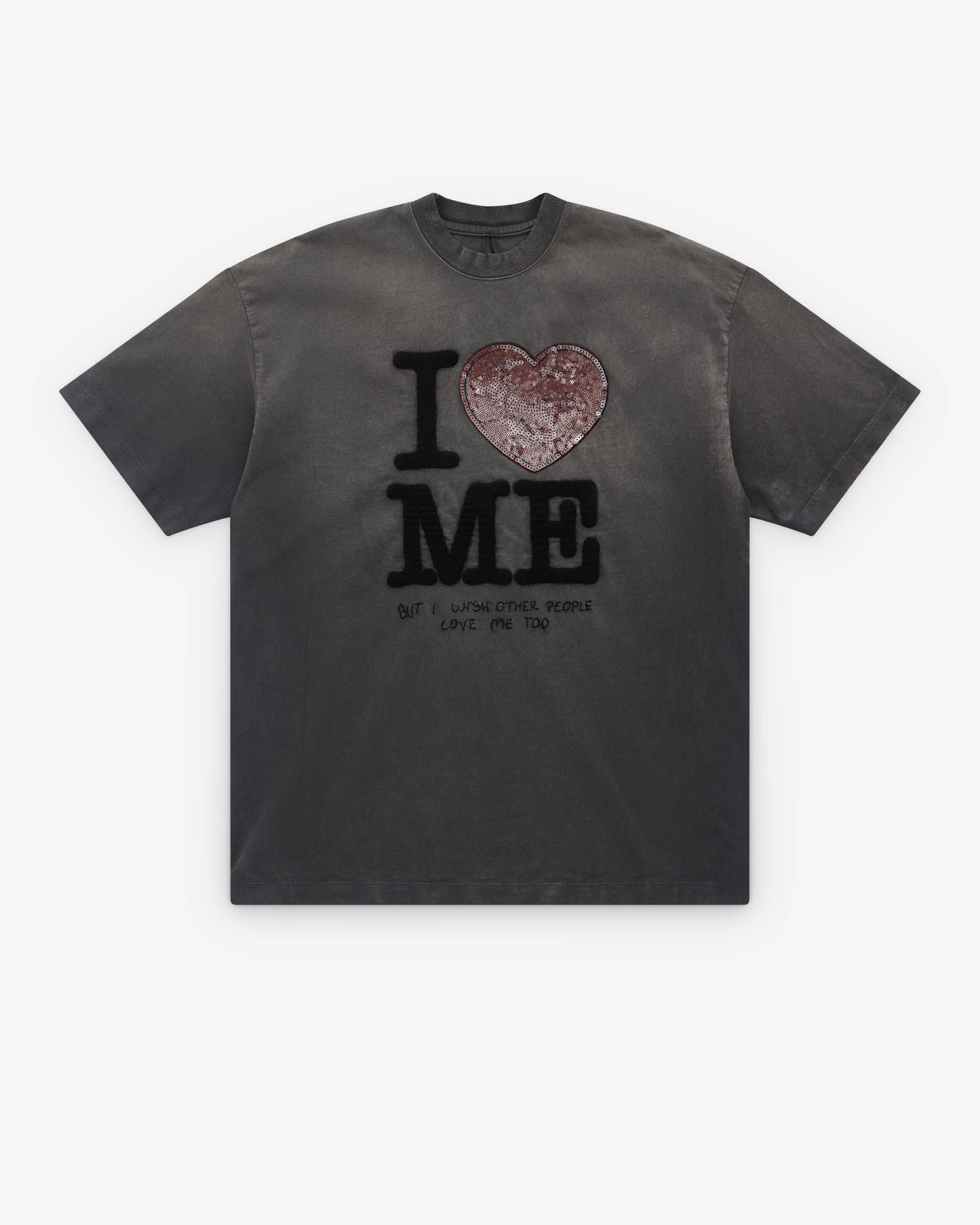 Round neckShort sleevesPrinted graphicsFaded fabricationMatte sequin detail at heart