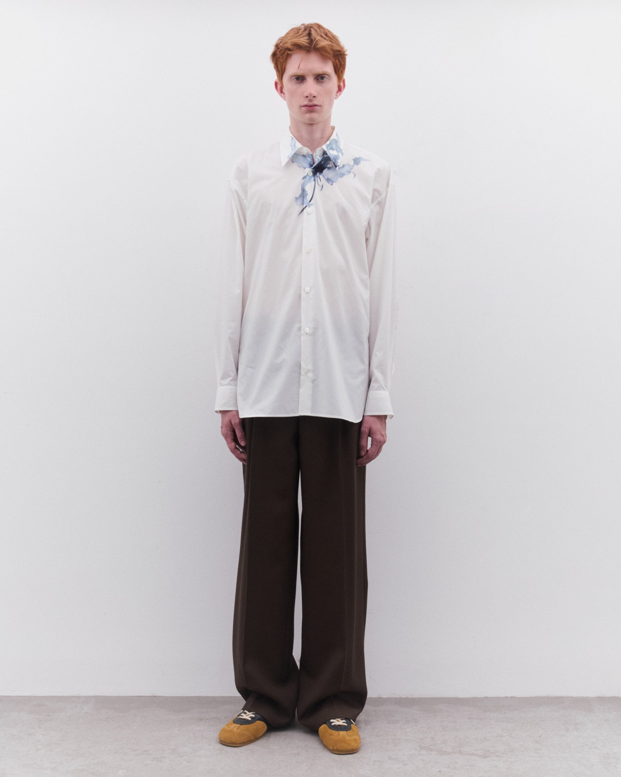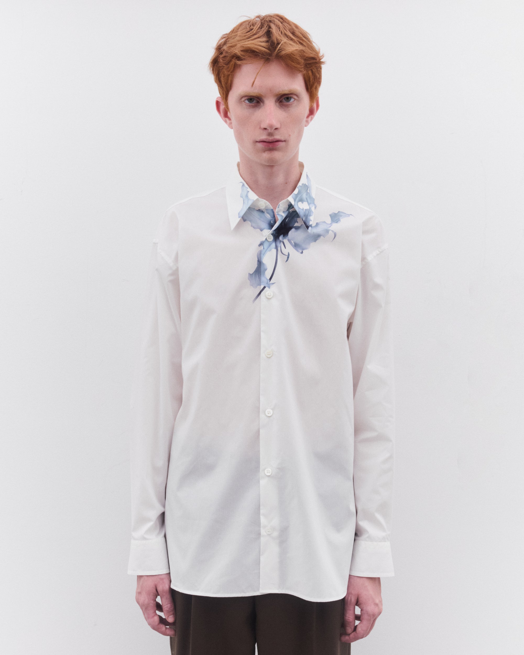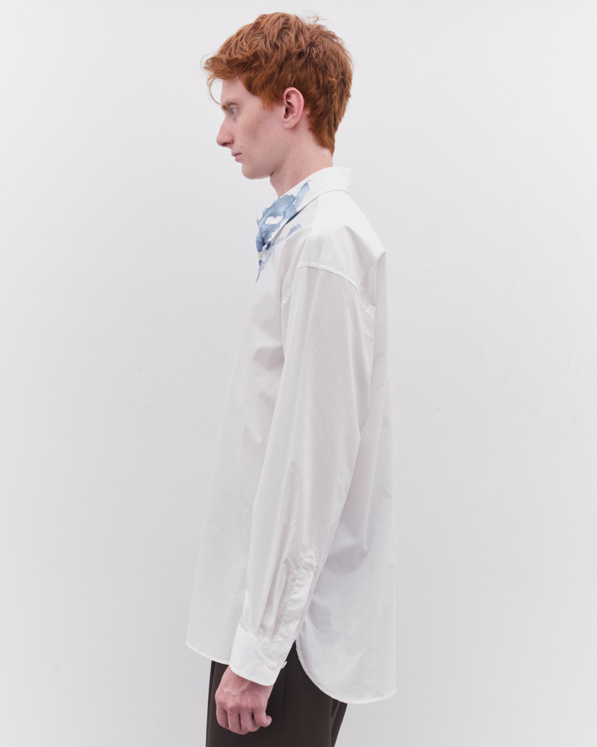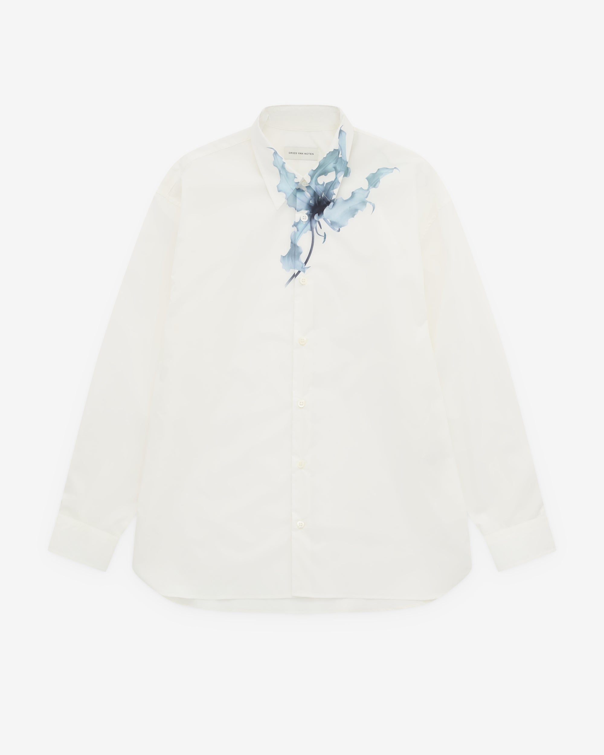 Point collarFloral over print at collarCurved hemButton fasteningButton cuffs