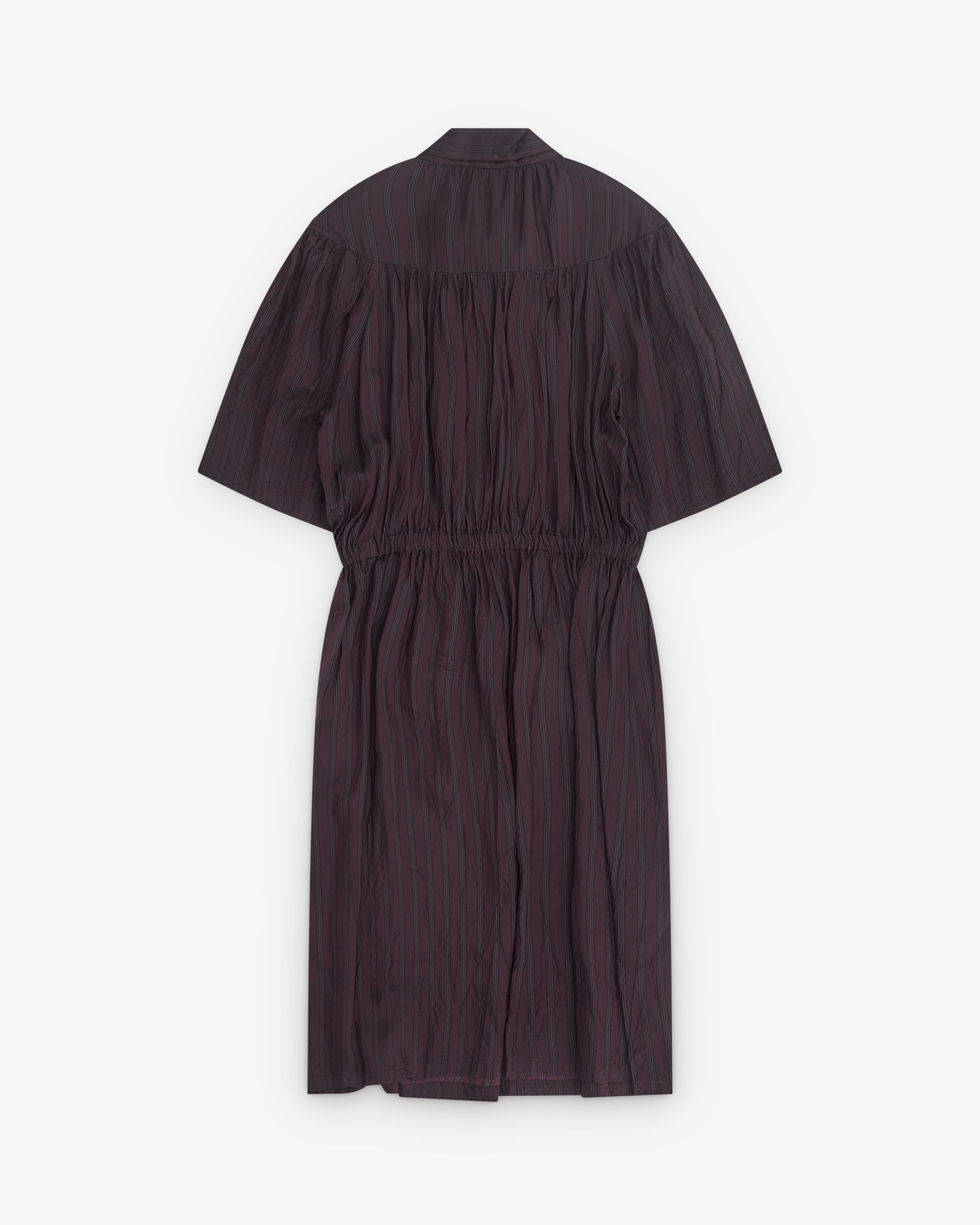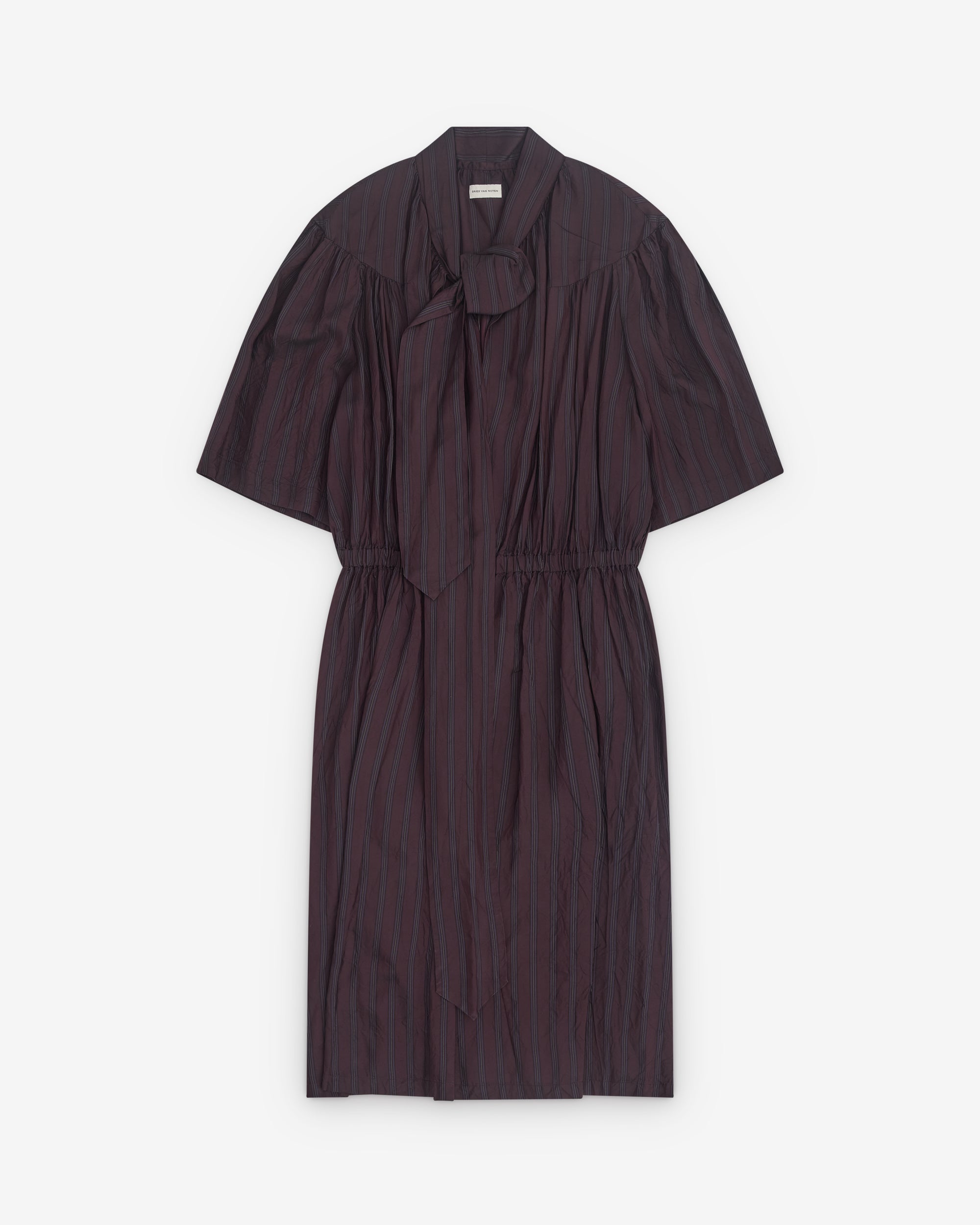 Tie necklineShort puff sleevesChest pleatsElasticated waist band
