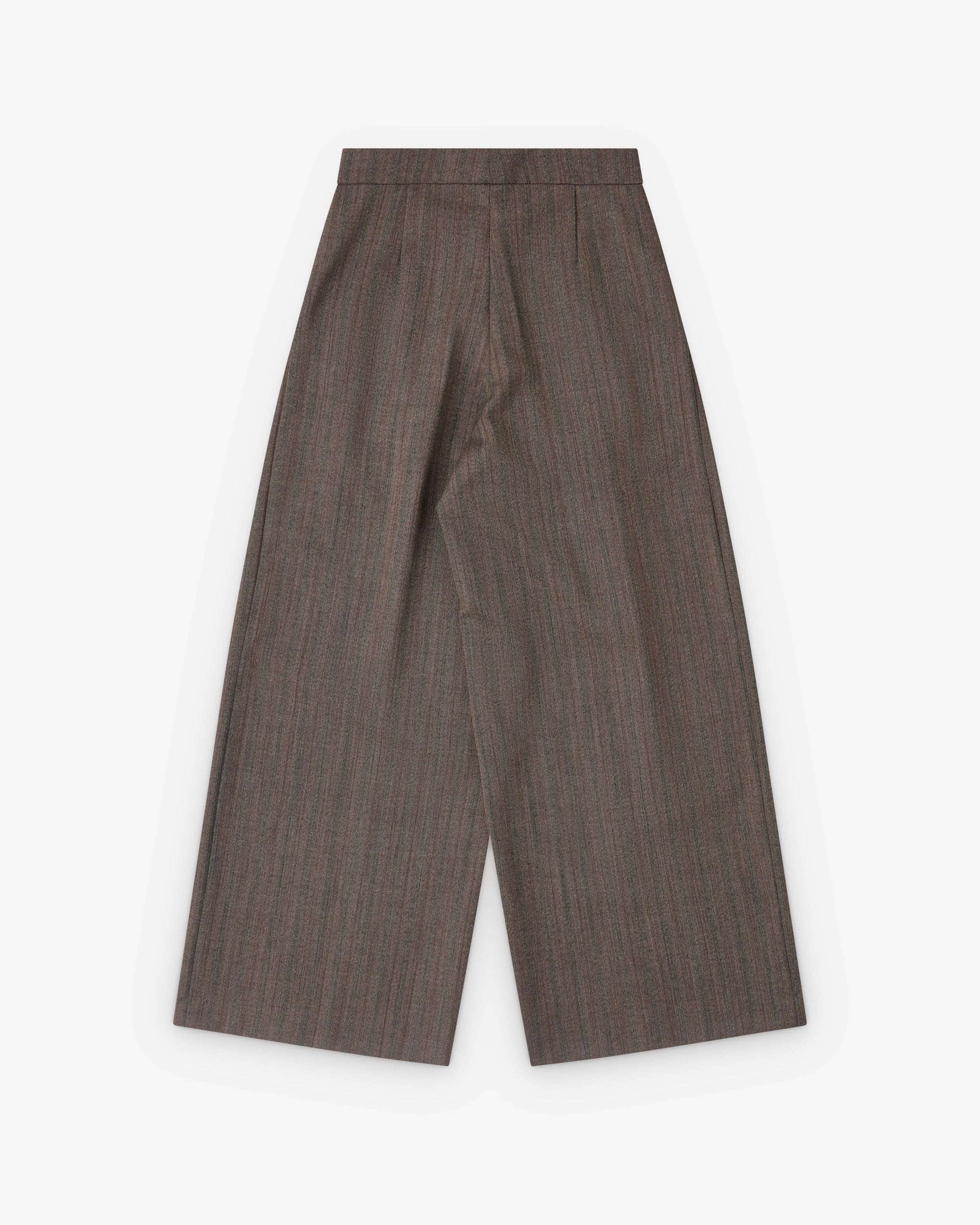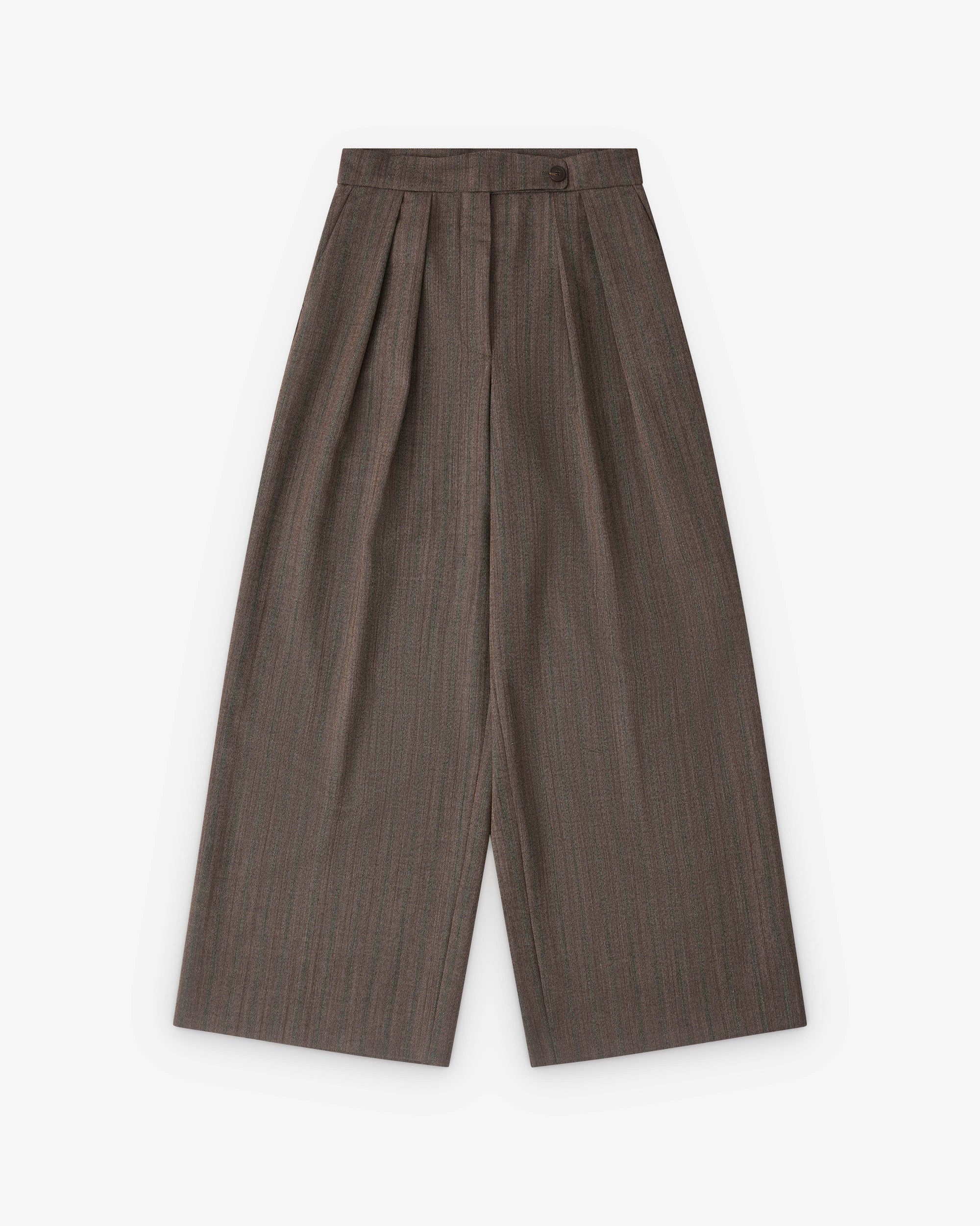 High waistDouble pleat at frontButton and zip flySide seam pocketsWide leg