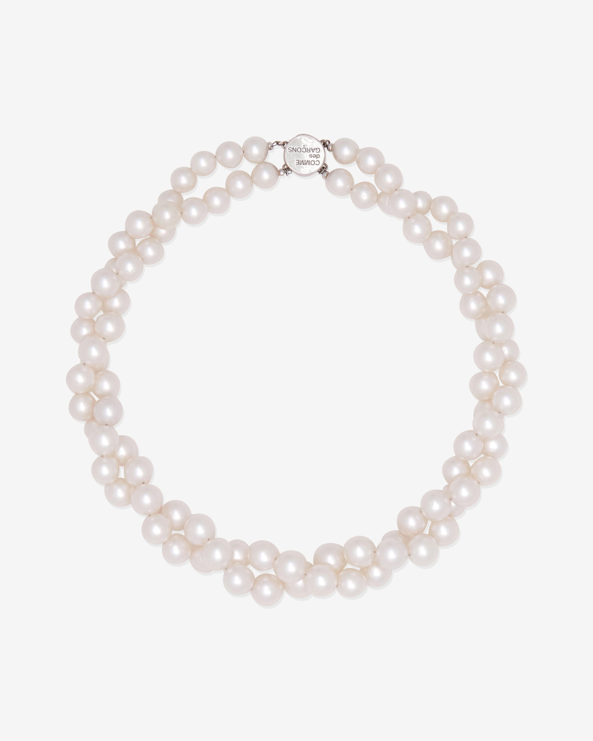 Two strands of white pearls with a silver clasp, designed by Rei Kawakubo.