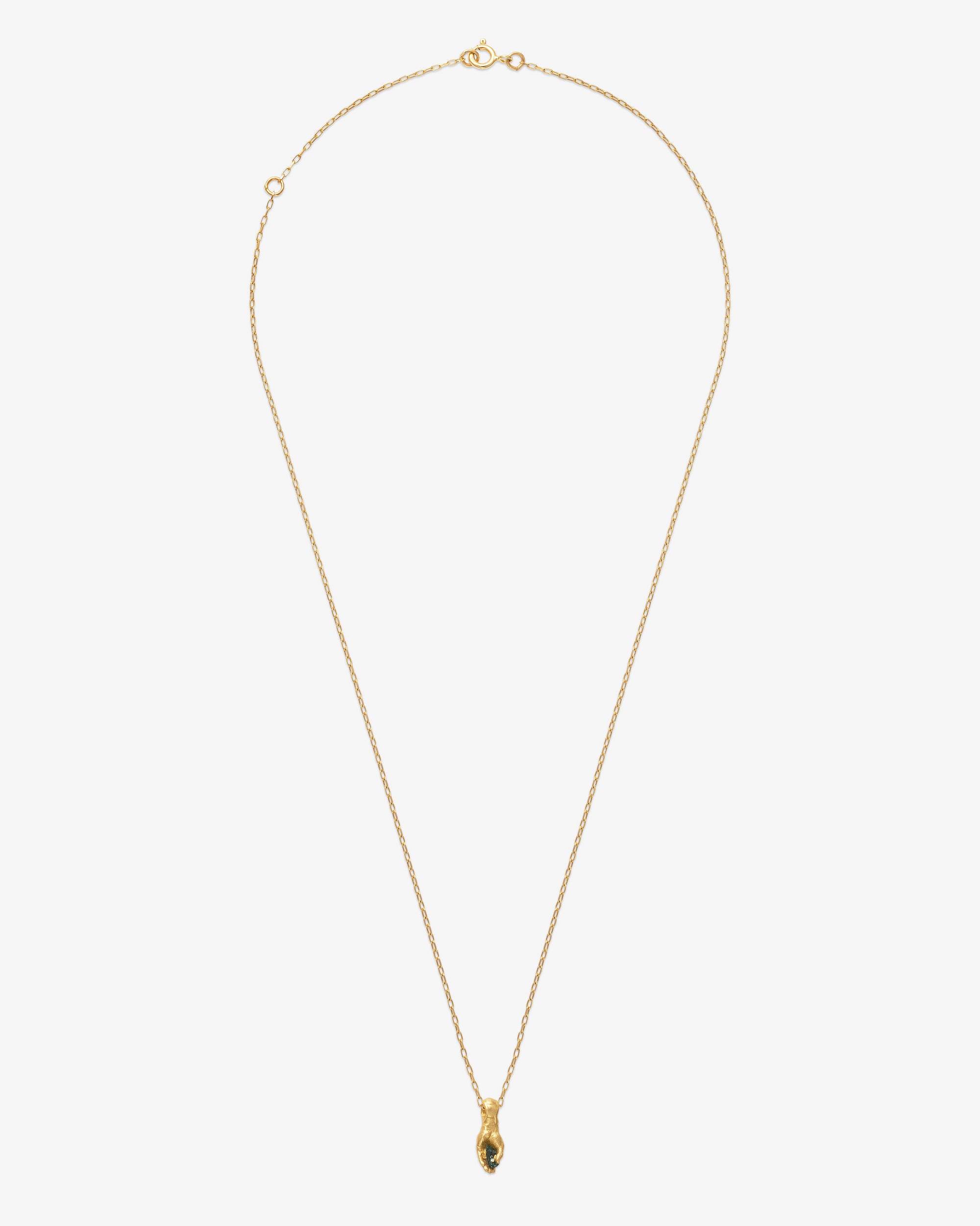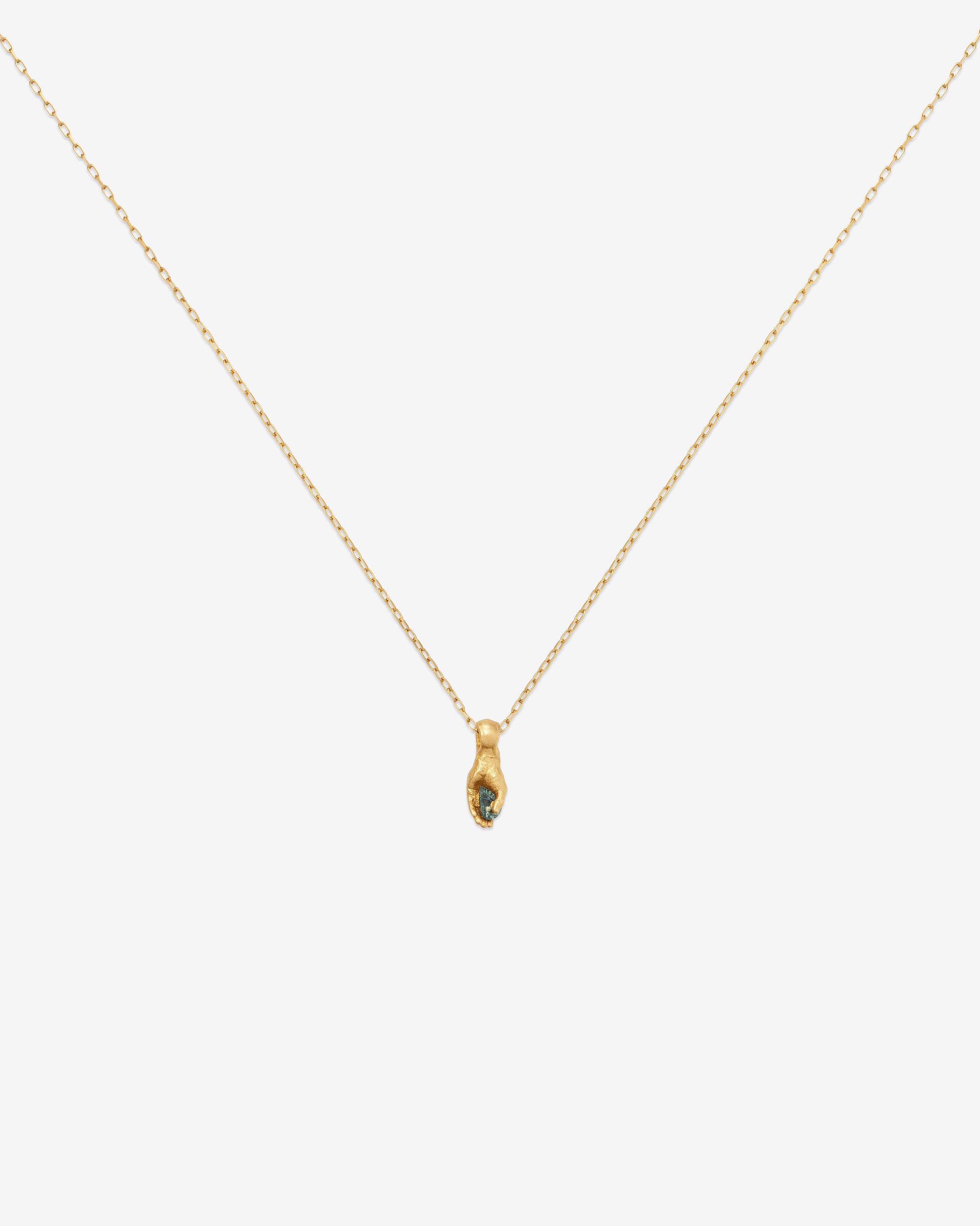 Necklace with a fine-detailed hand holding a natural sapphire