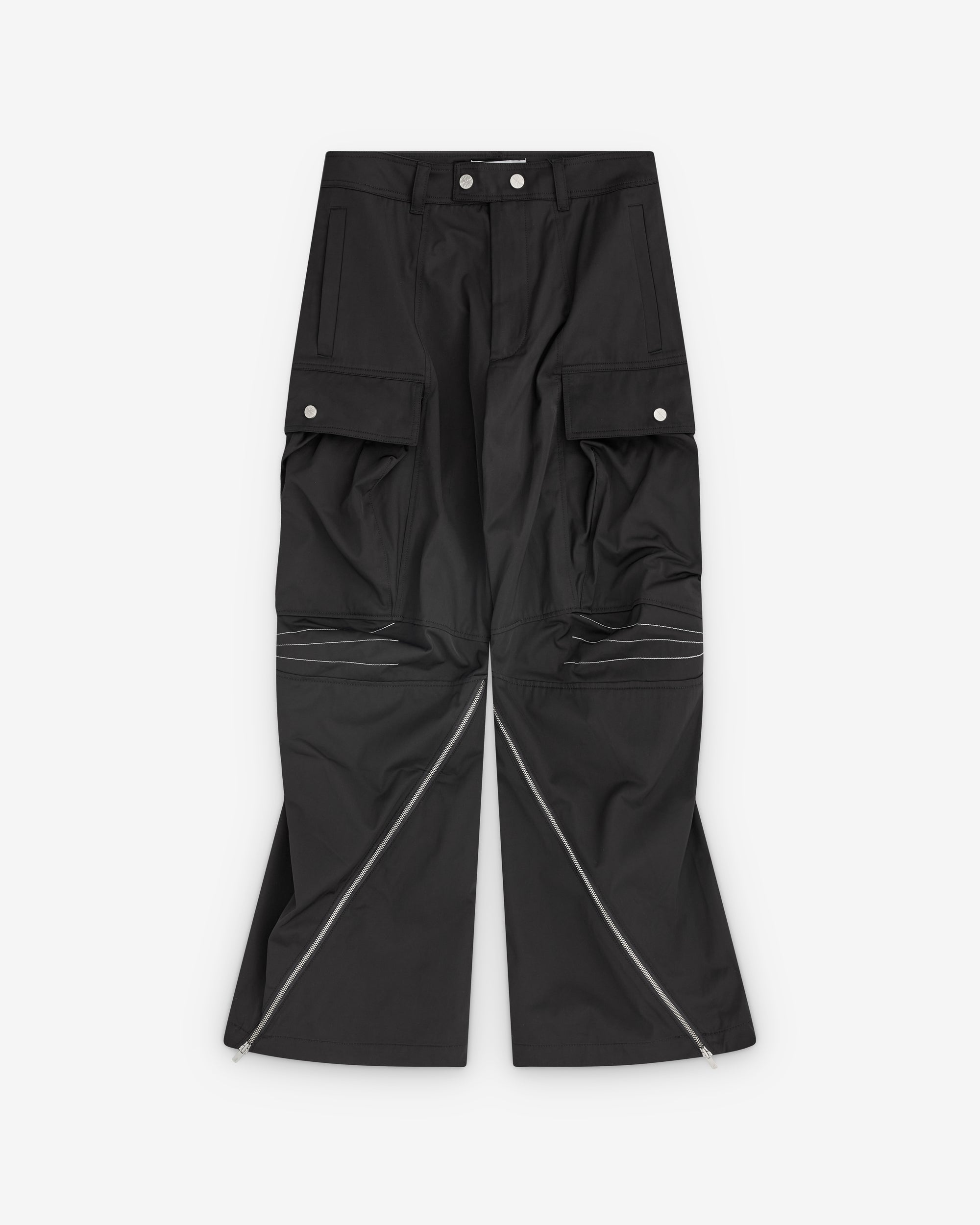 Button waist, zip flyFront and leg pocketsArticulated darted kneesZip open detailsLoose fit