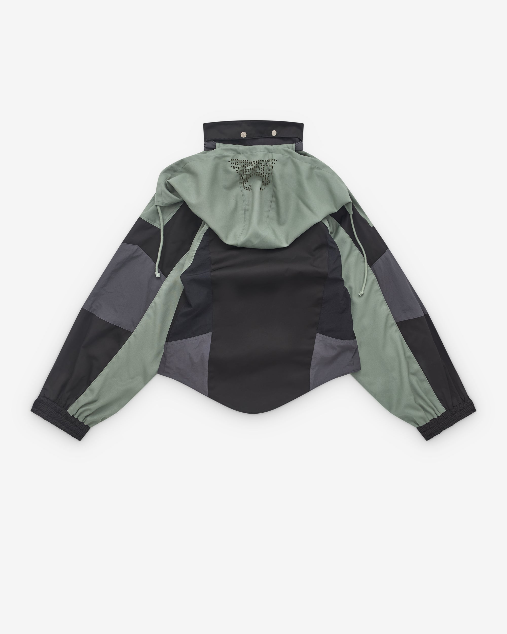 Funnel neck linePackable drawstring hoodContrast panelled fabricFront pocketsConcealed zip closureFull internal liningAdjustable cuffsDrop rear hem