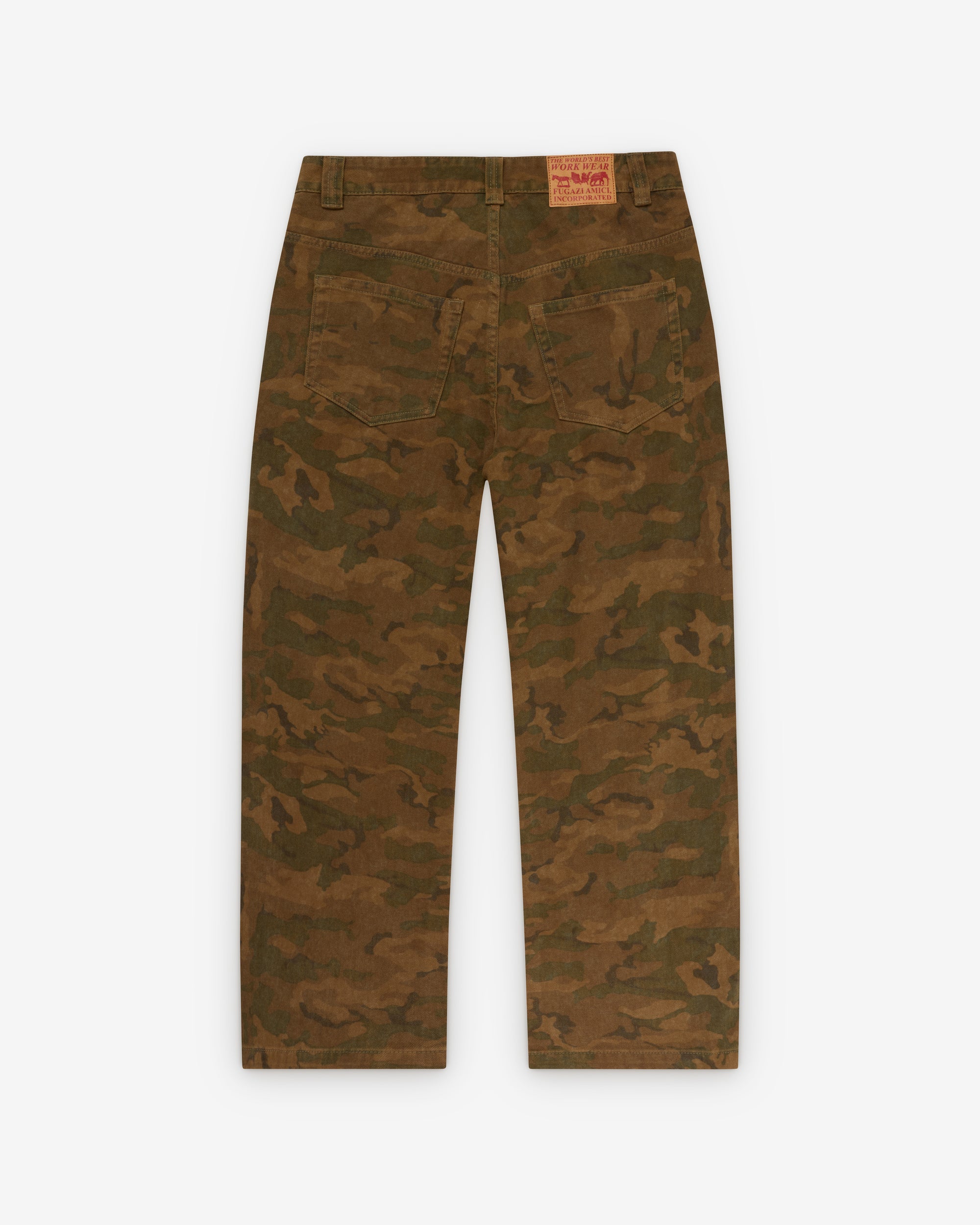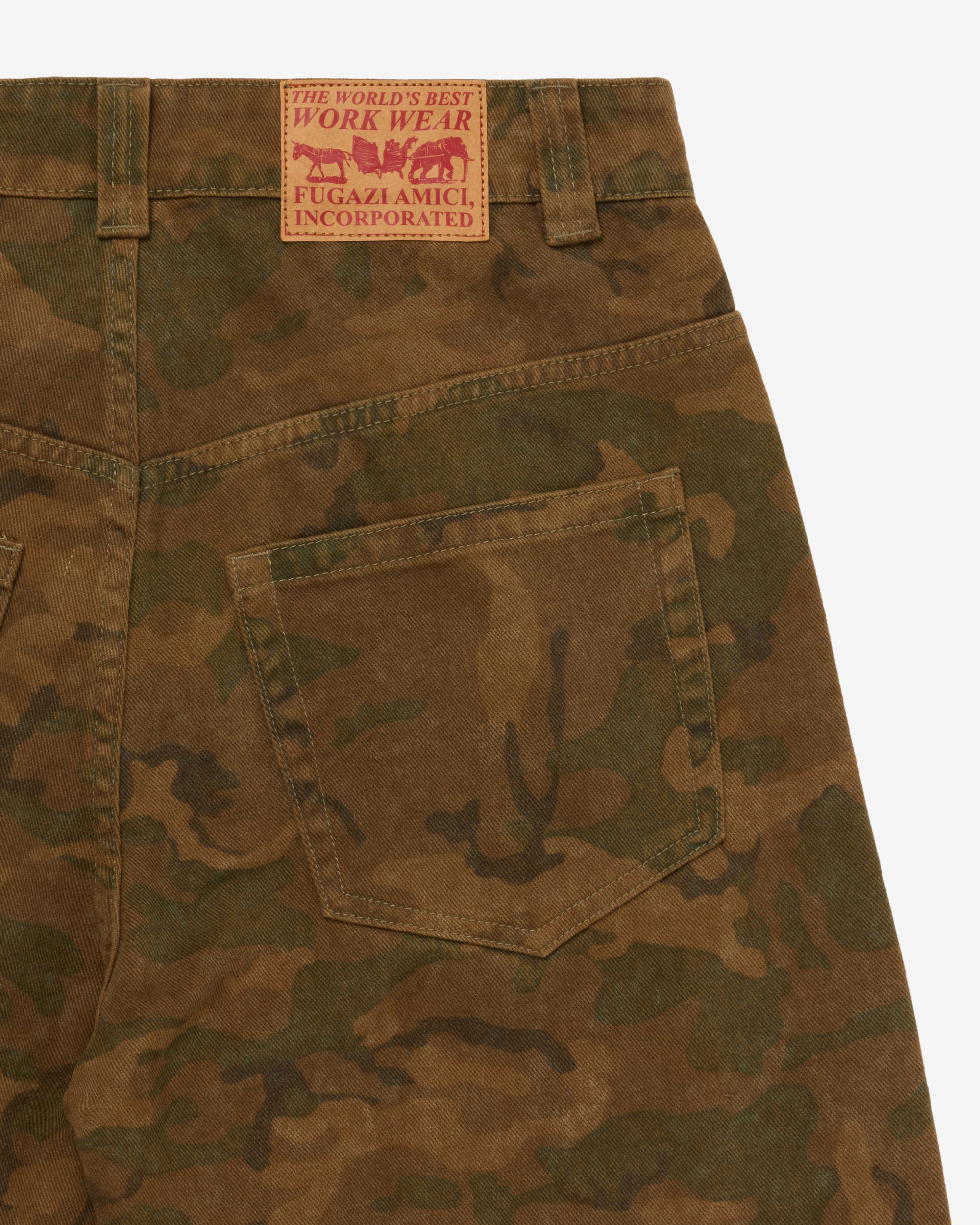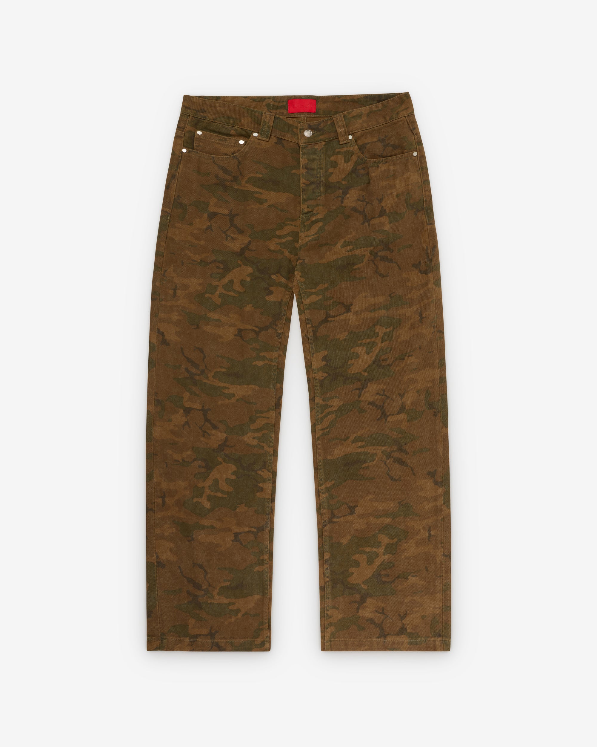 Button waist and flyLoose fitCamo print fabricFive pocket construction Leather patch at rear waist bandBelt loops