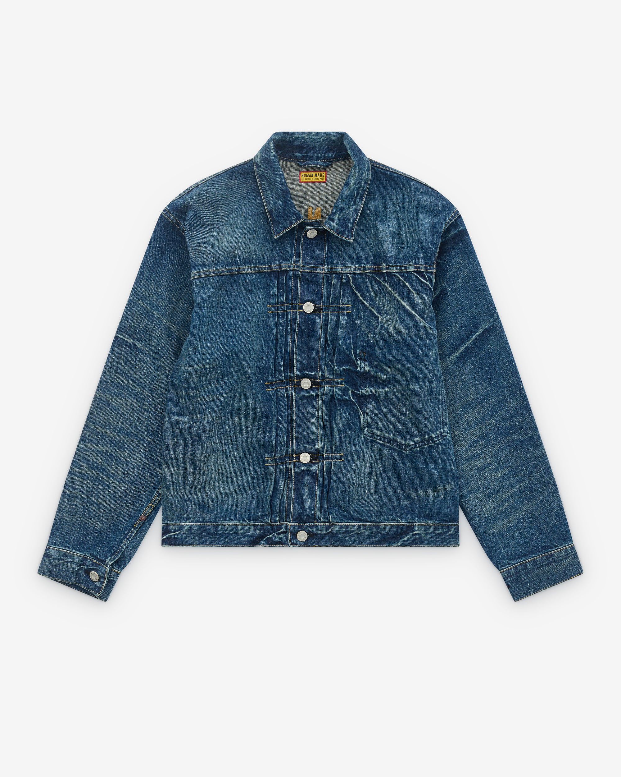 Aged, washed denim fabricMetal button closureChain stitch graphicsInternal pocketButton adjustable cuffs