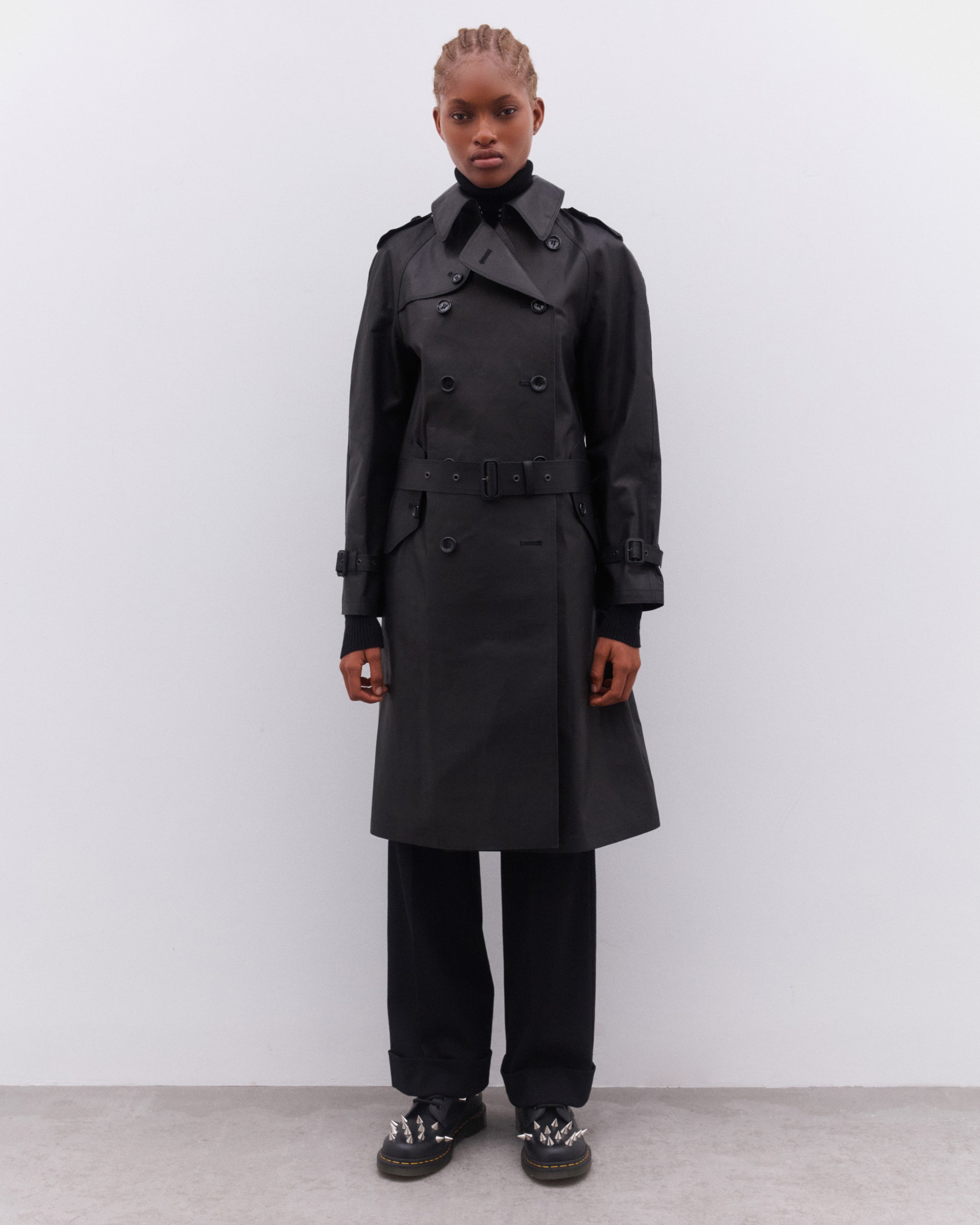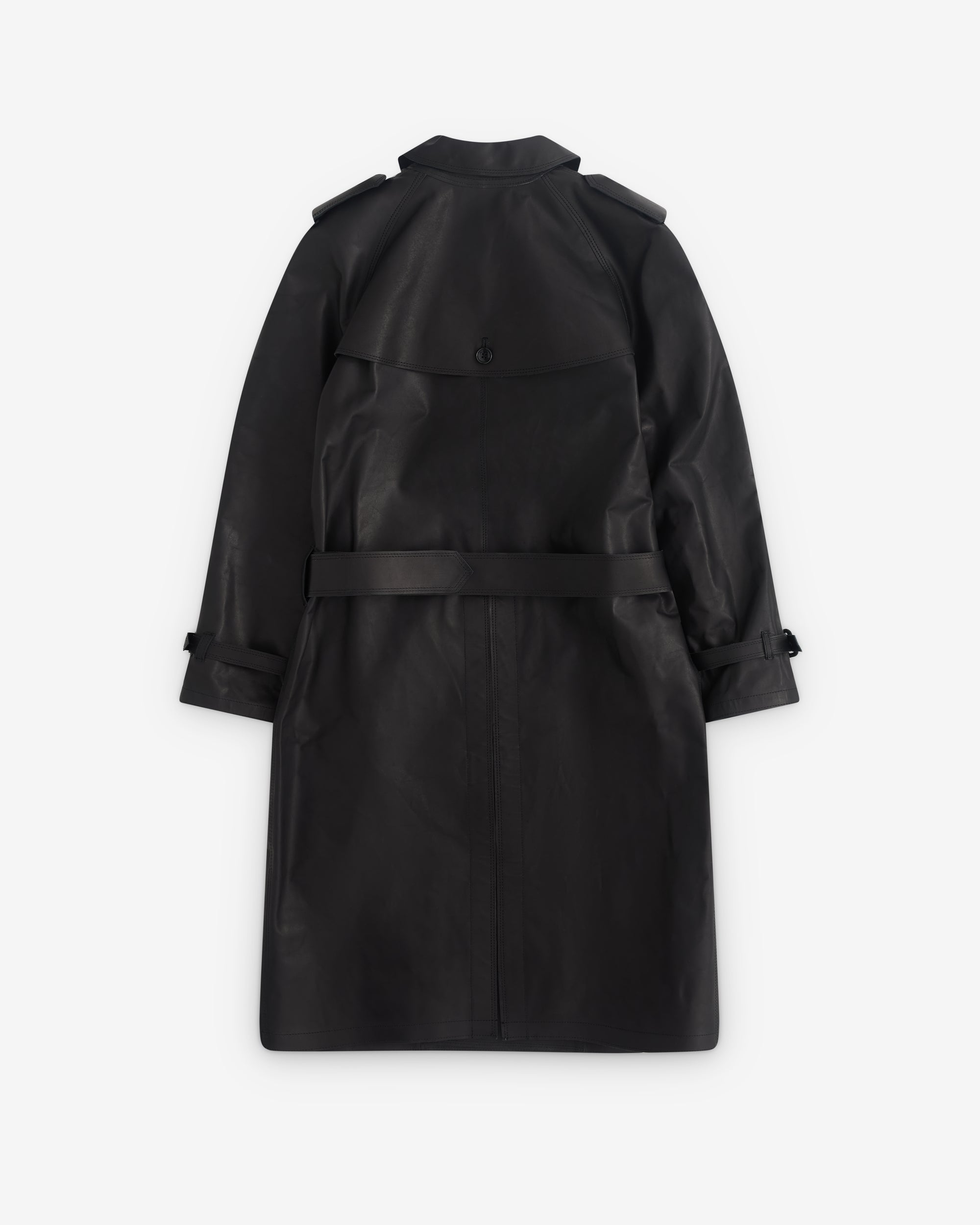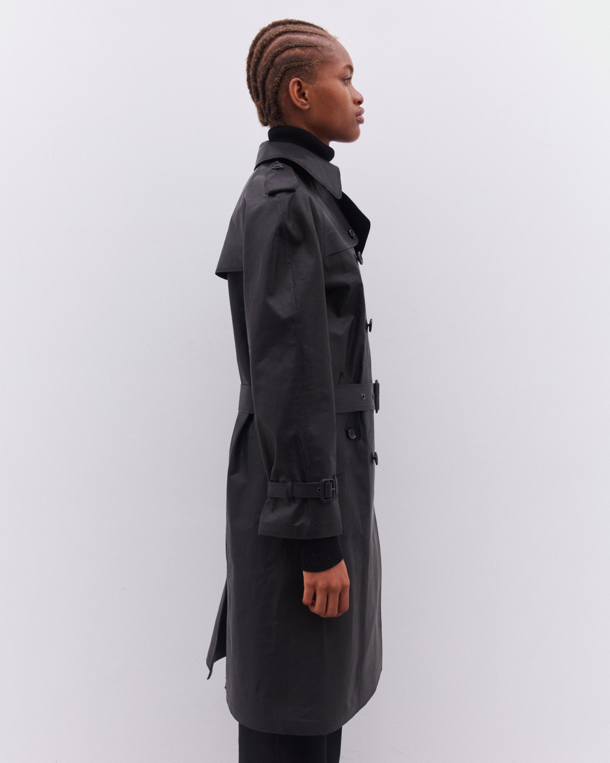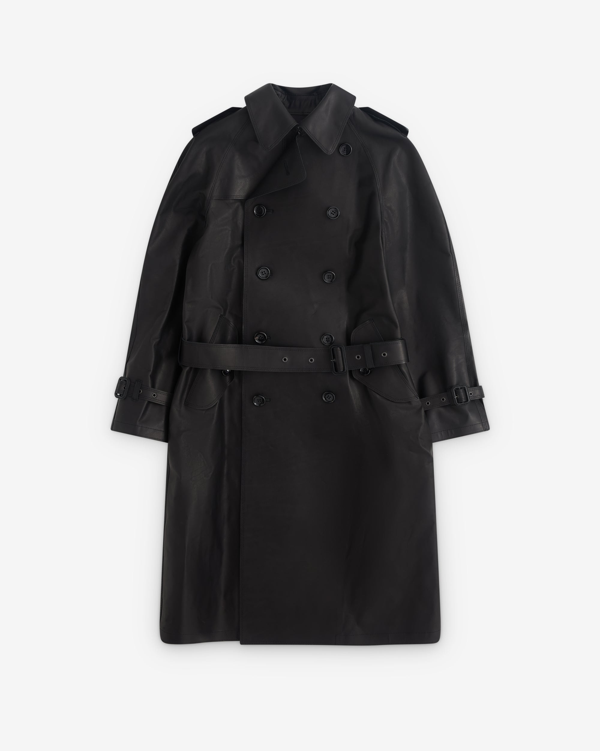 Point collarDouble breastedSide flap pocketsBelt at waist and cuffsRaglan sleevesRear button down storm flapUnlined