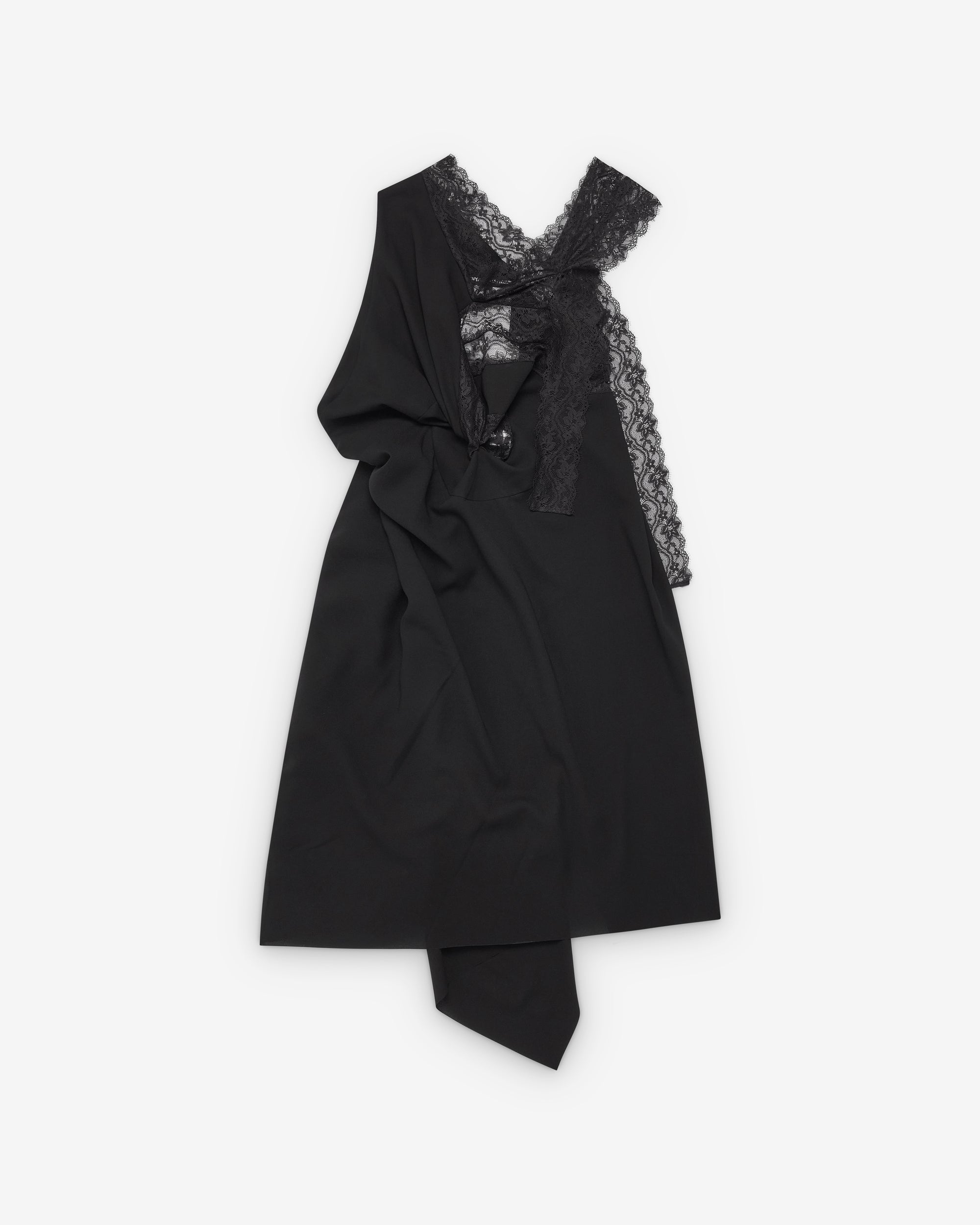 V-neckline with lace trimSleeveless styleAsymmetric cut body and hemOpen backMidi length
