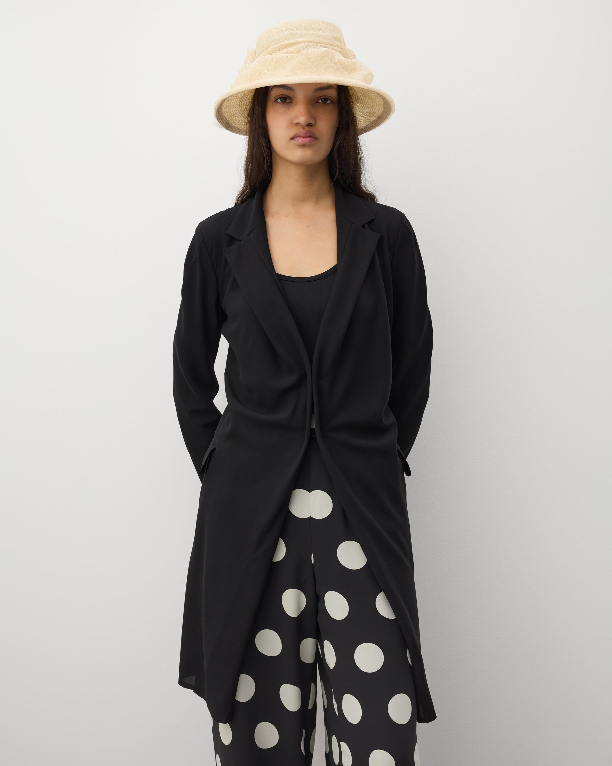 Unstructered single breasted collarNoted lapel Dual hook and clasp closureFront flap close pocketsLong sleevesFitted cutPolyester georgette fabric