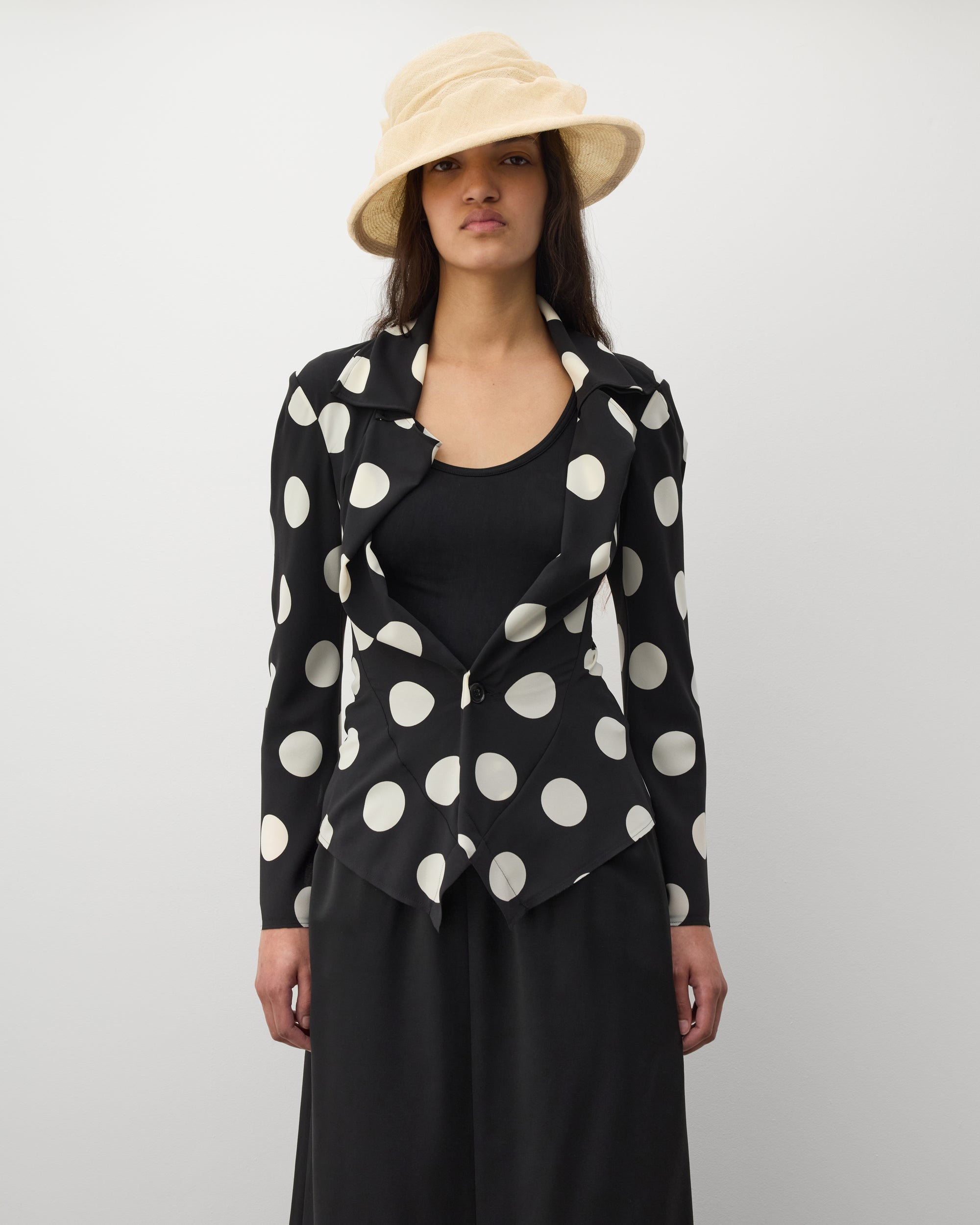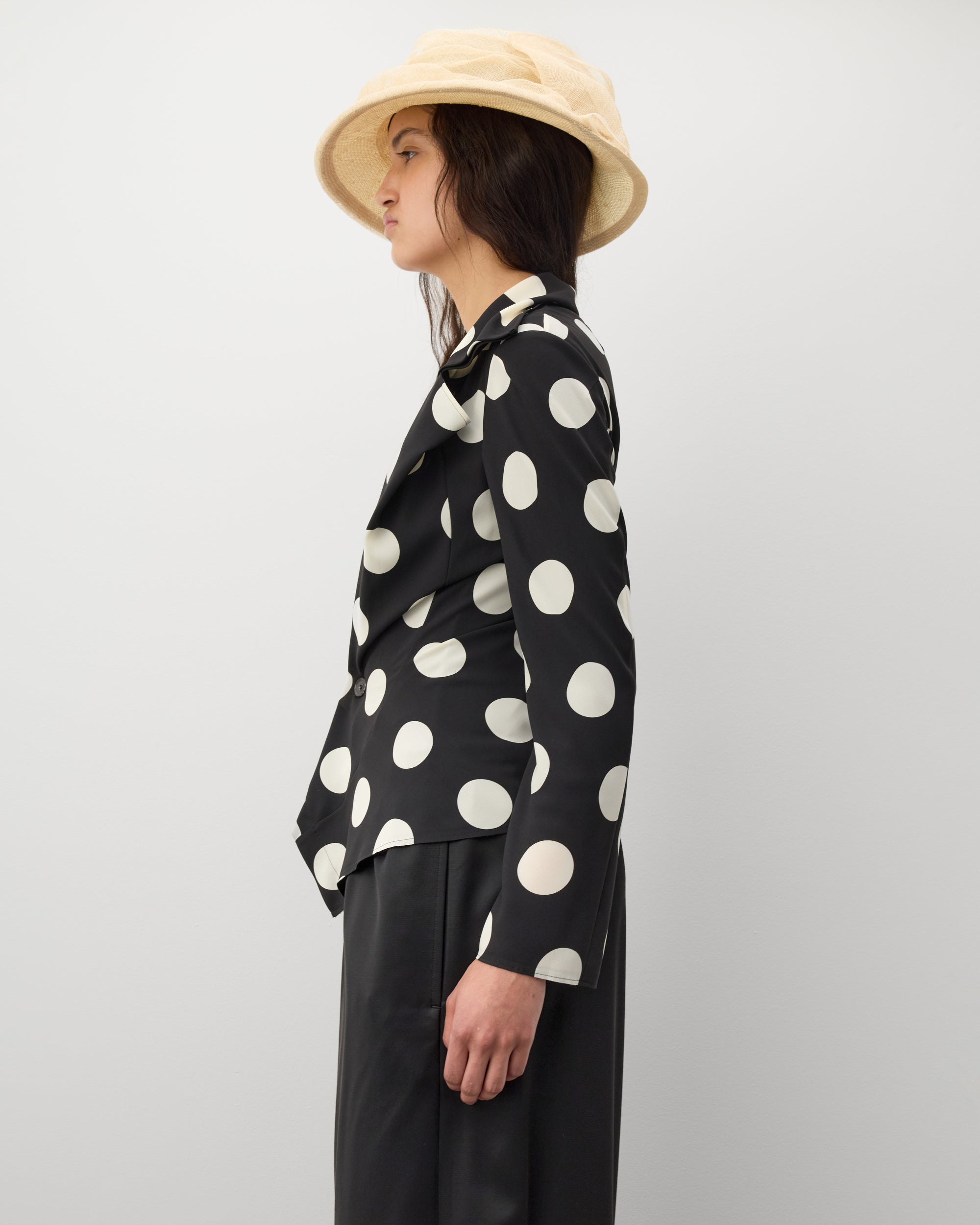Unstructured single breasted collarNoted lapel Dual hook and clasp closureFront flap close pocketsLong sleevesFitted cutPolka dot polyester georgette fabric