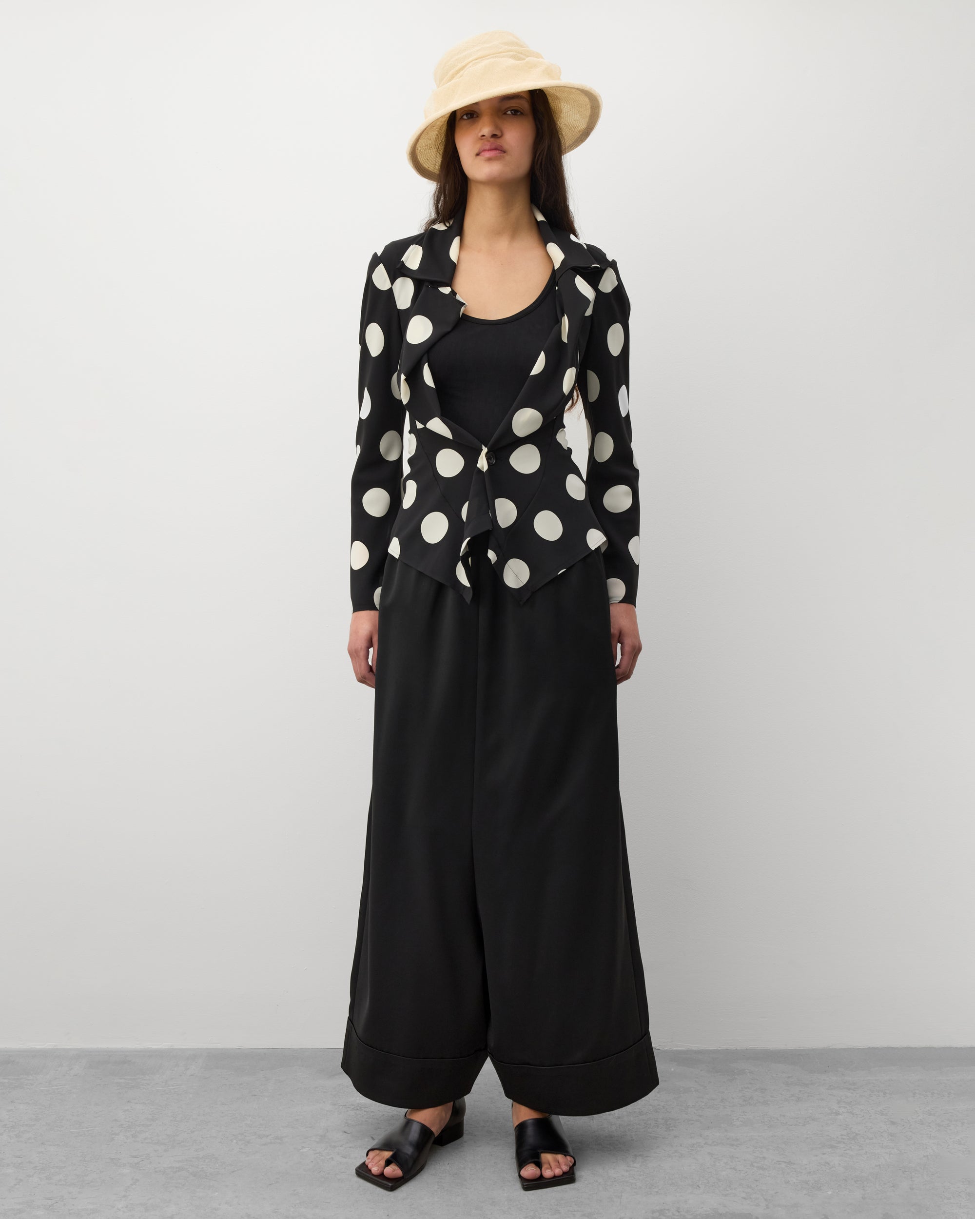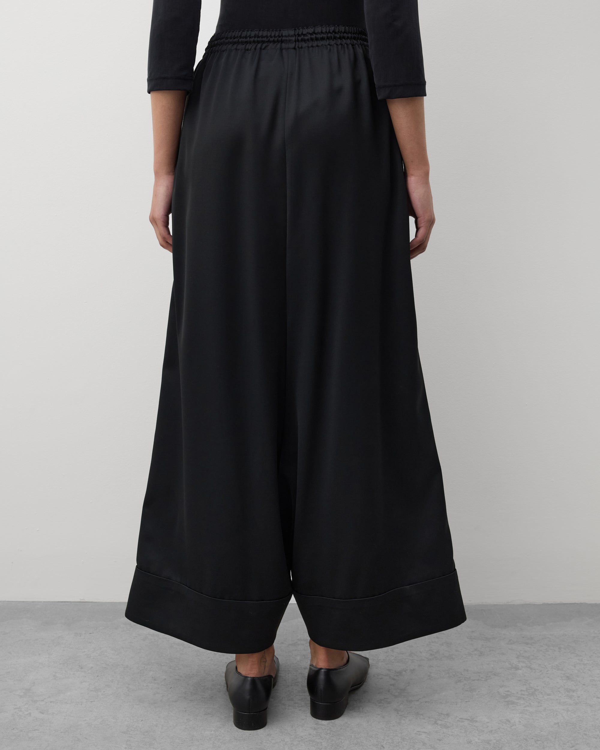 Elasticated waist bandSide seam pocketsWide legExaggerated crotchPre cuffed ankles