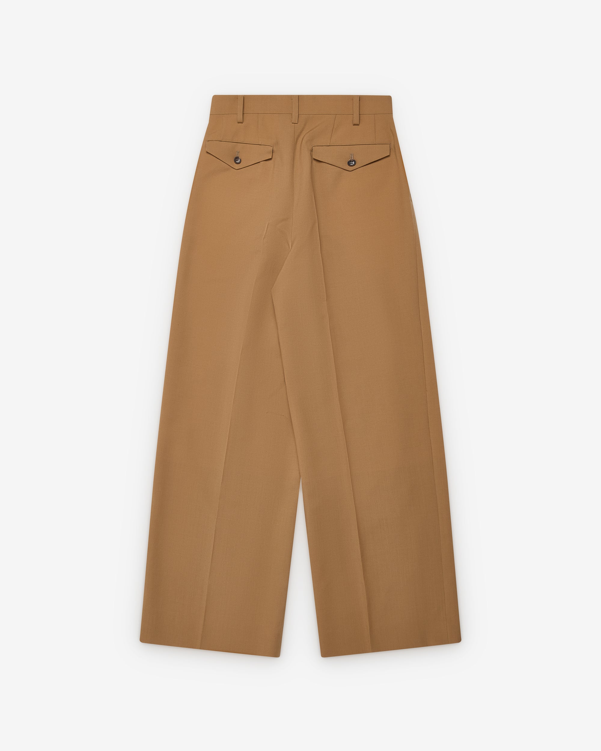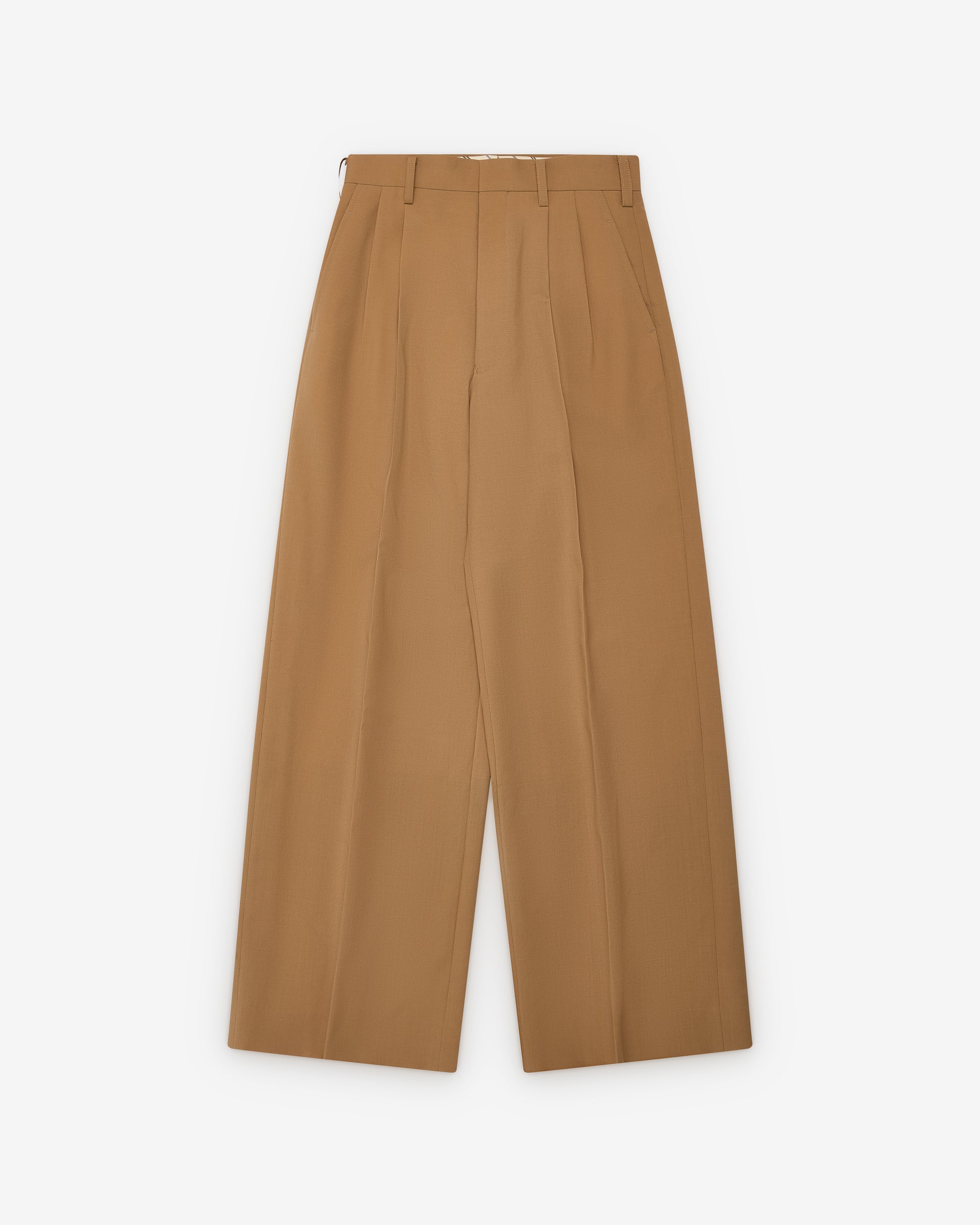 Hook and eye waist closureZip flyWide legDual pleated frontSide seam pocketsTwo back welt pockets