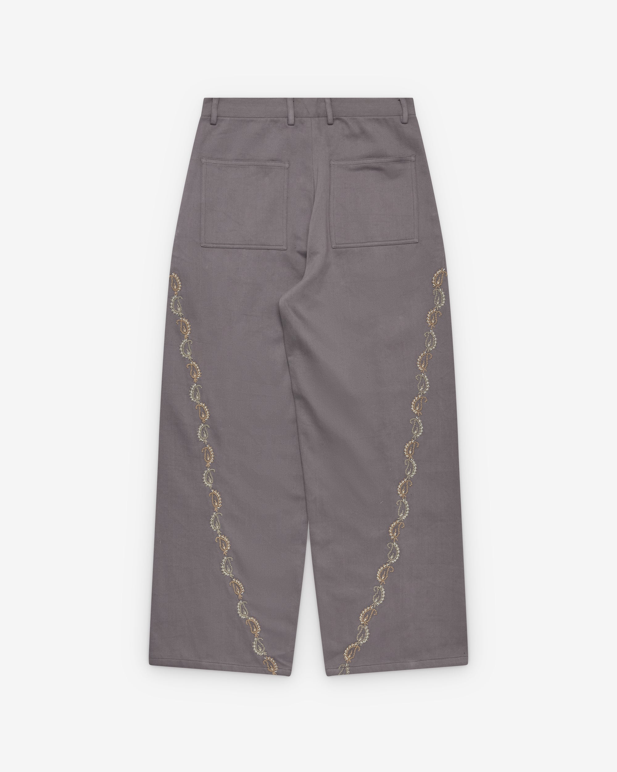 Button waist, zip flyPleated frontSide seam pocketsHand embroidery at frontWide leg
