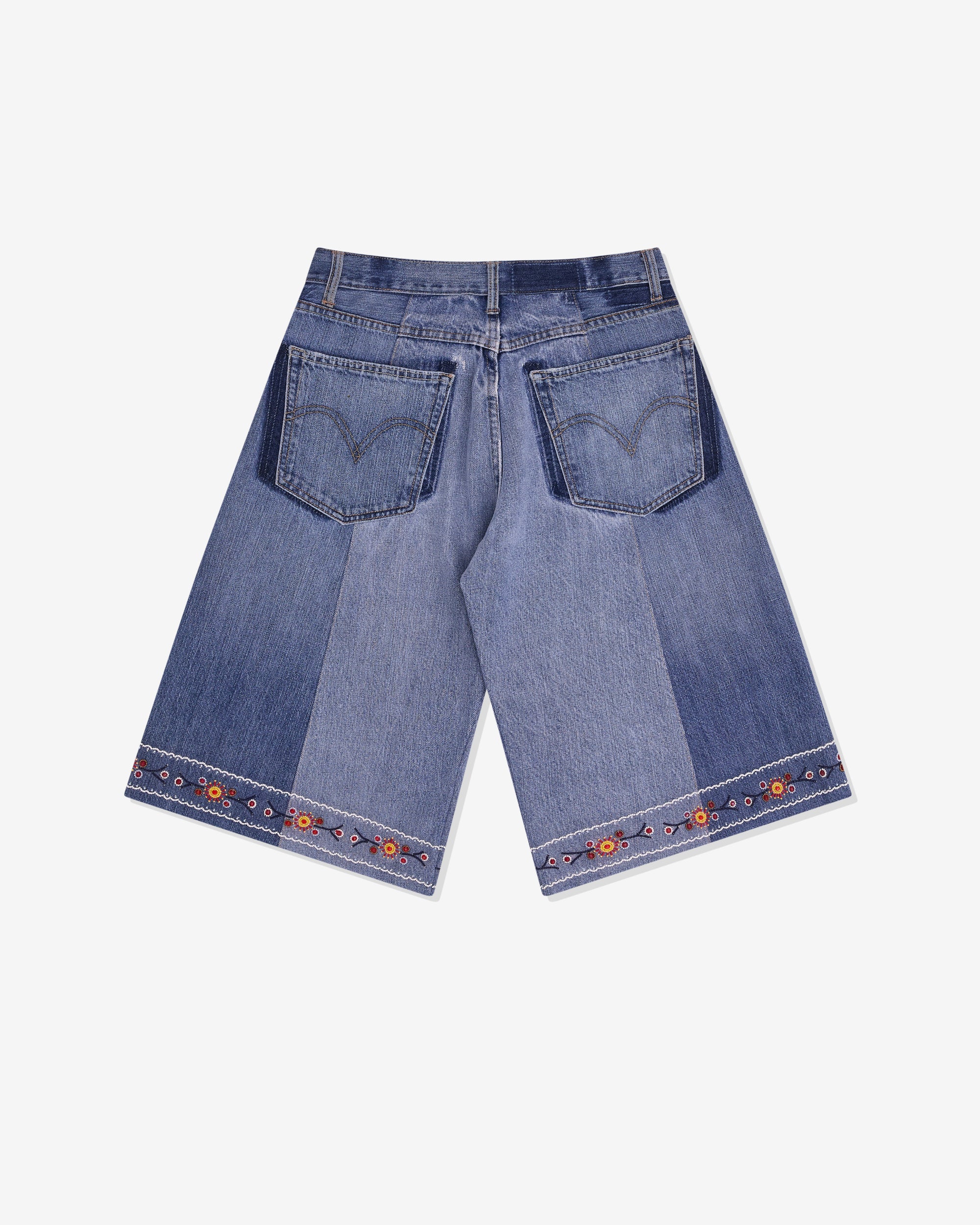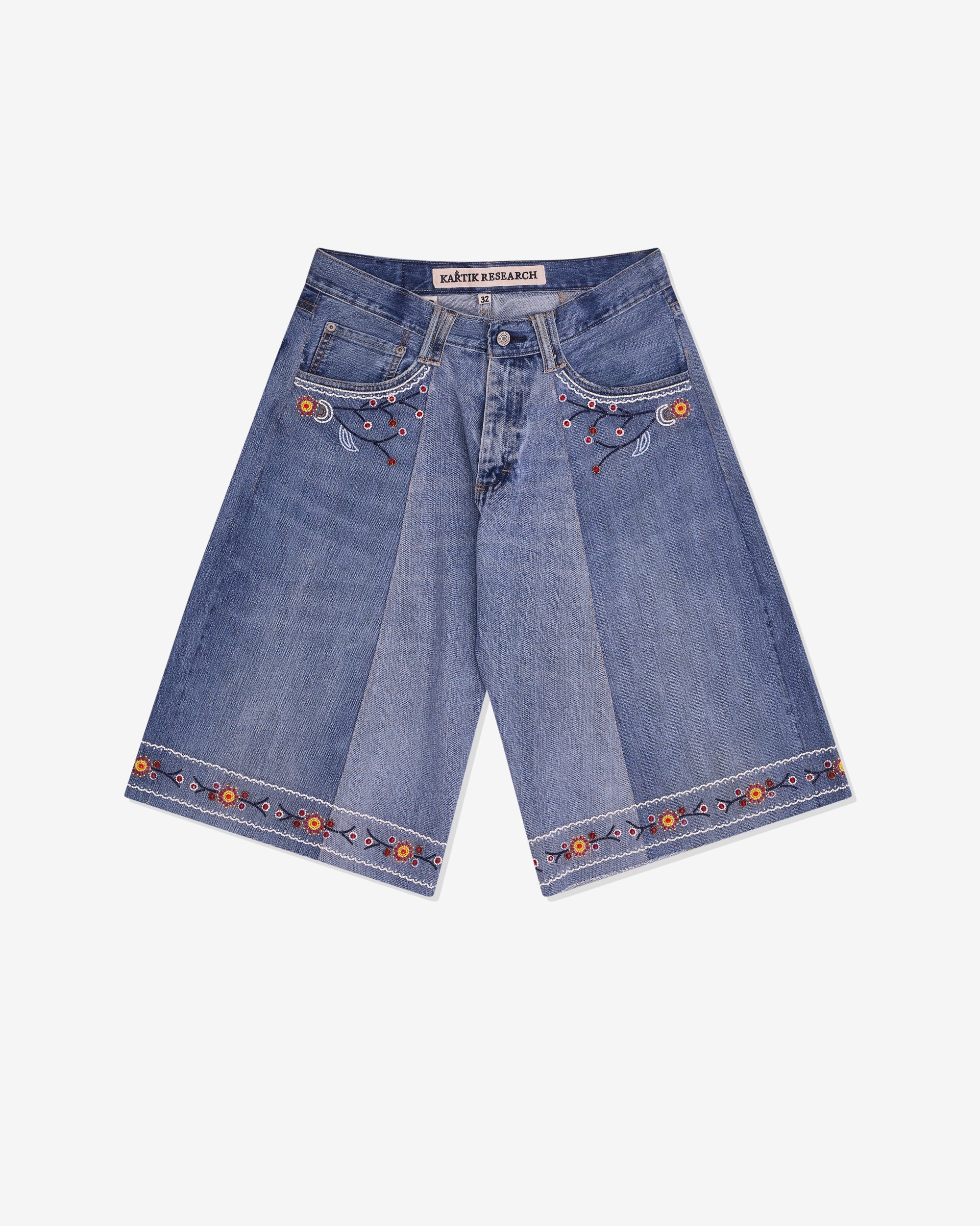 Button and fly fasteningTwo tone denimHand embroidery and hand beading throughout5 pocket constructionBelt loopsMade in India