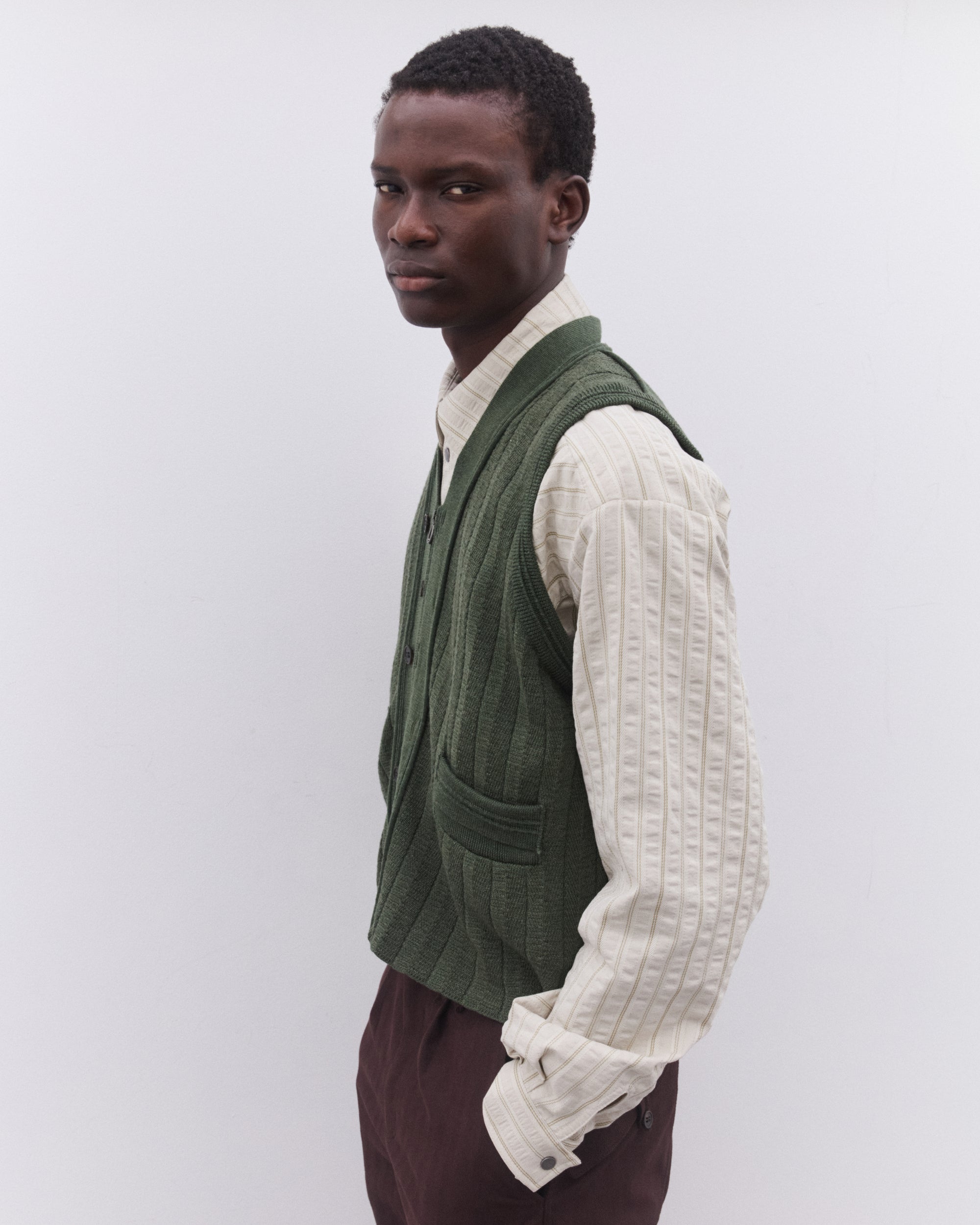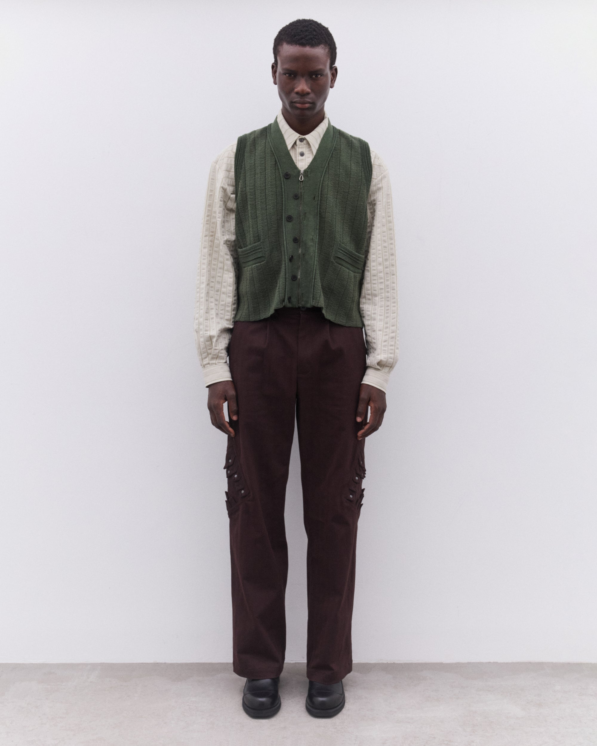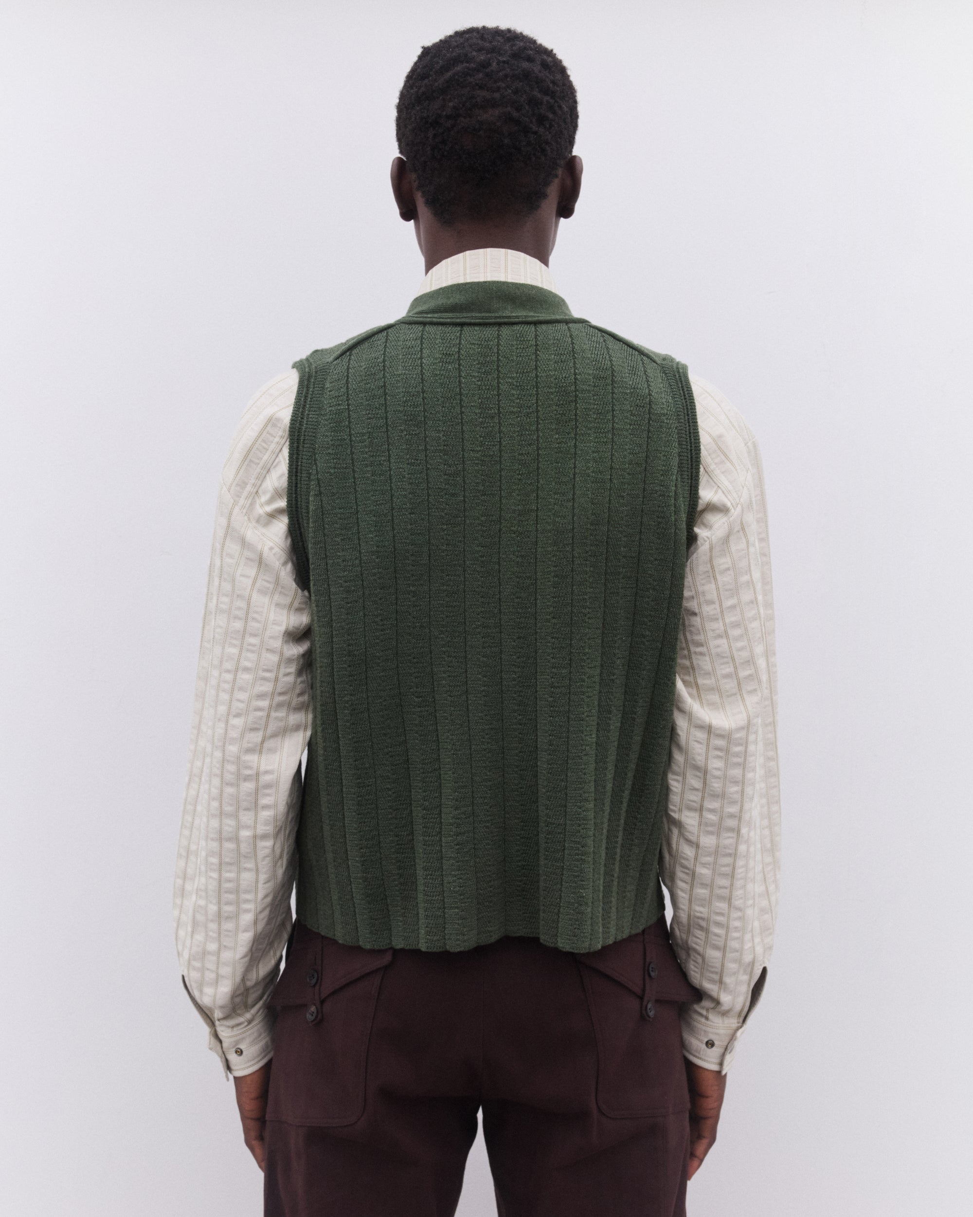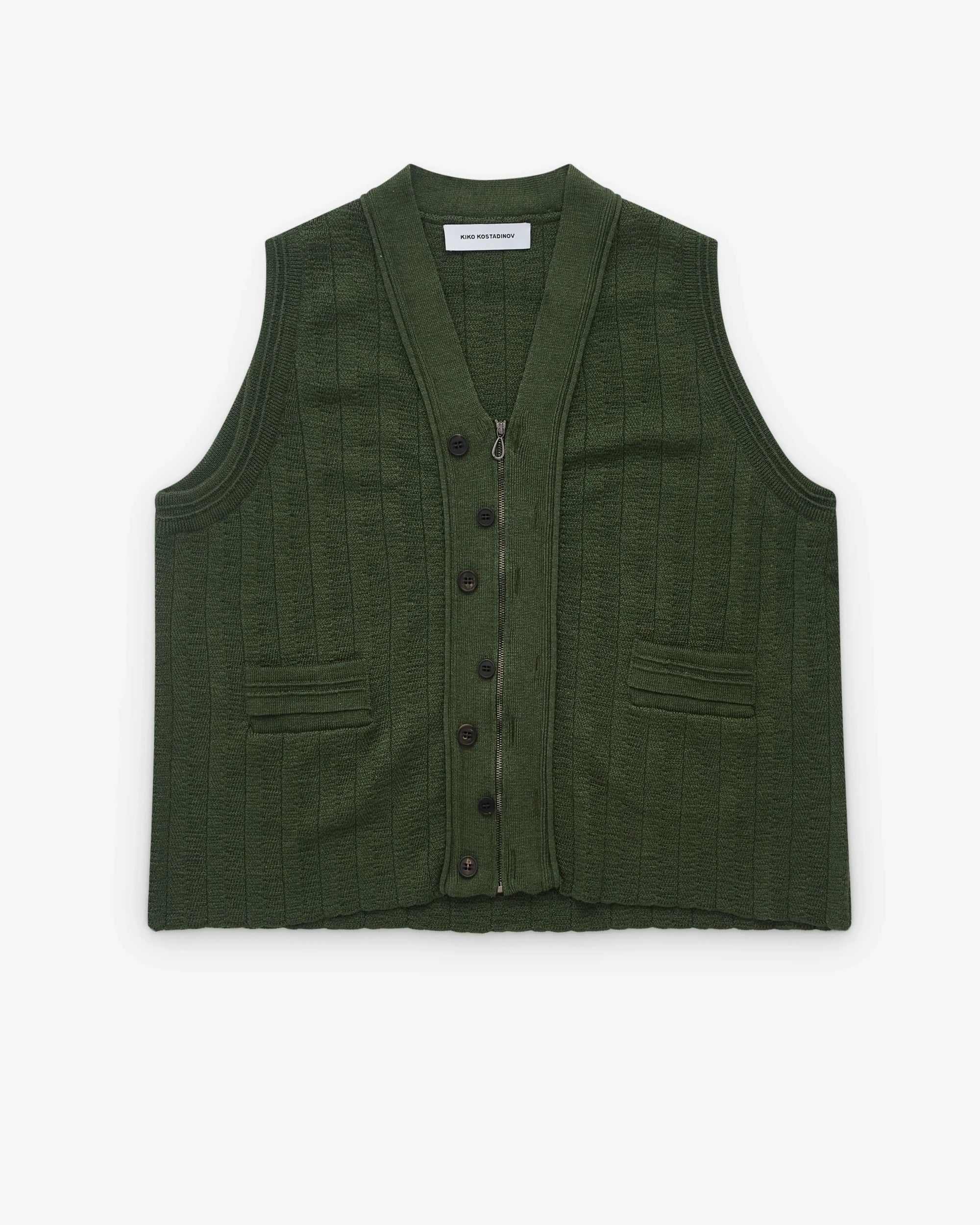Front zip and button closureV neck collarSleeveless styleFront patch pocketsRibbed knit trims