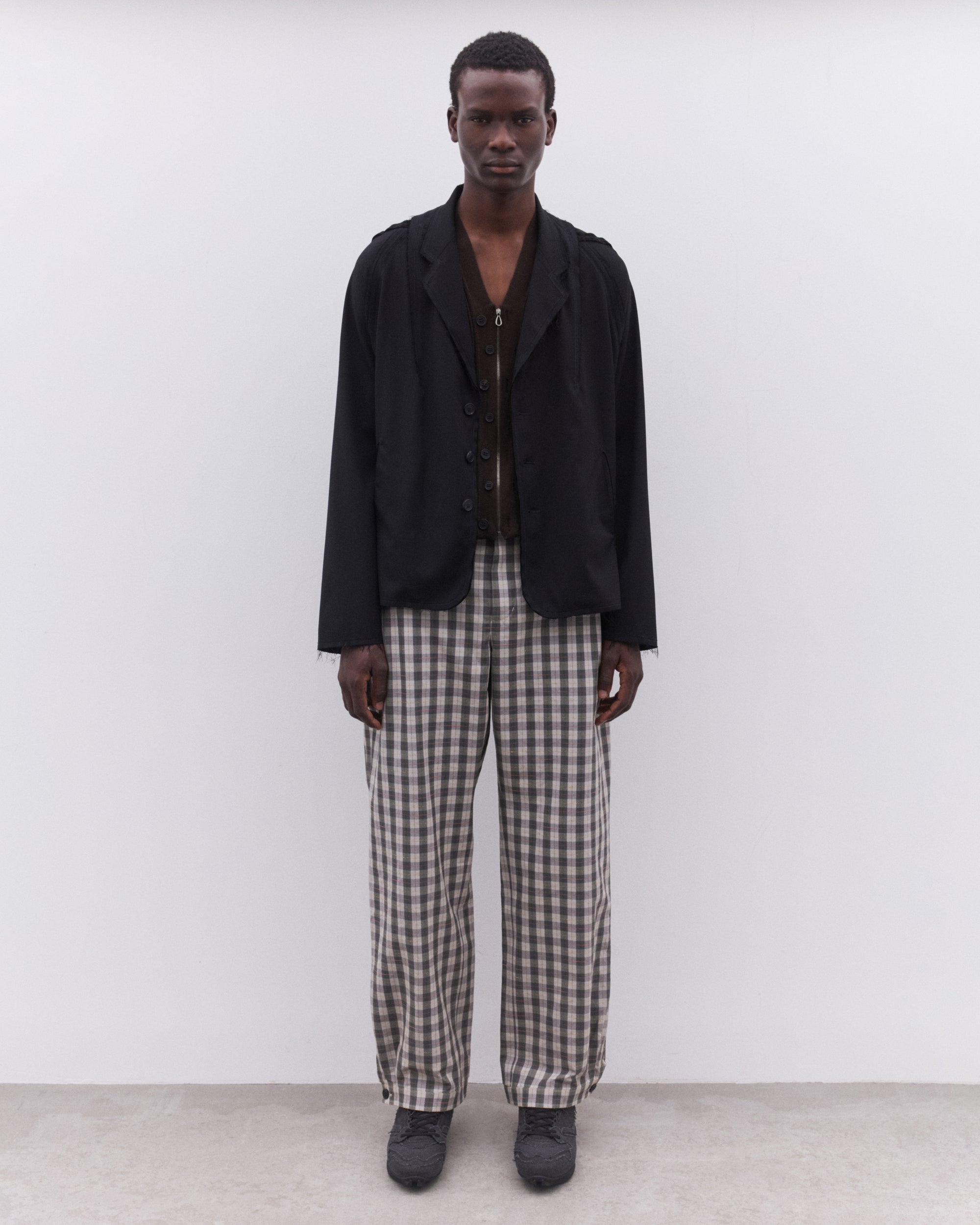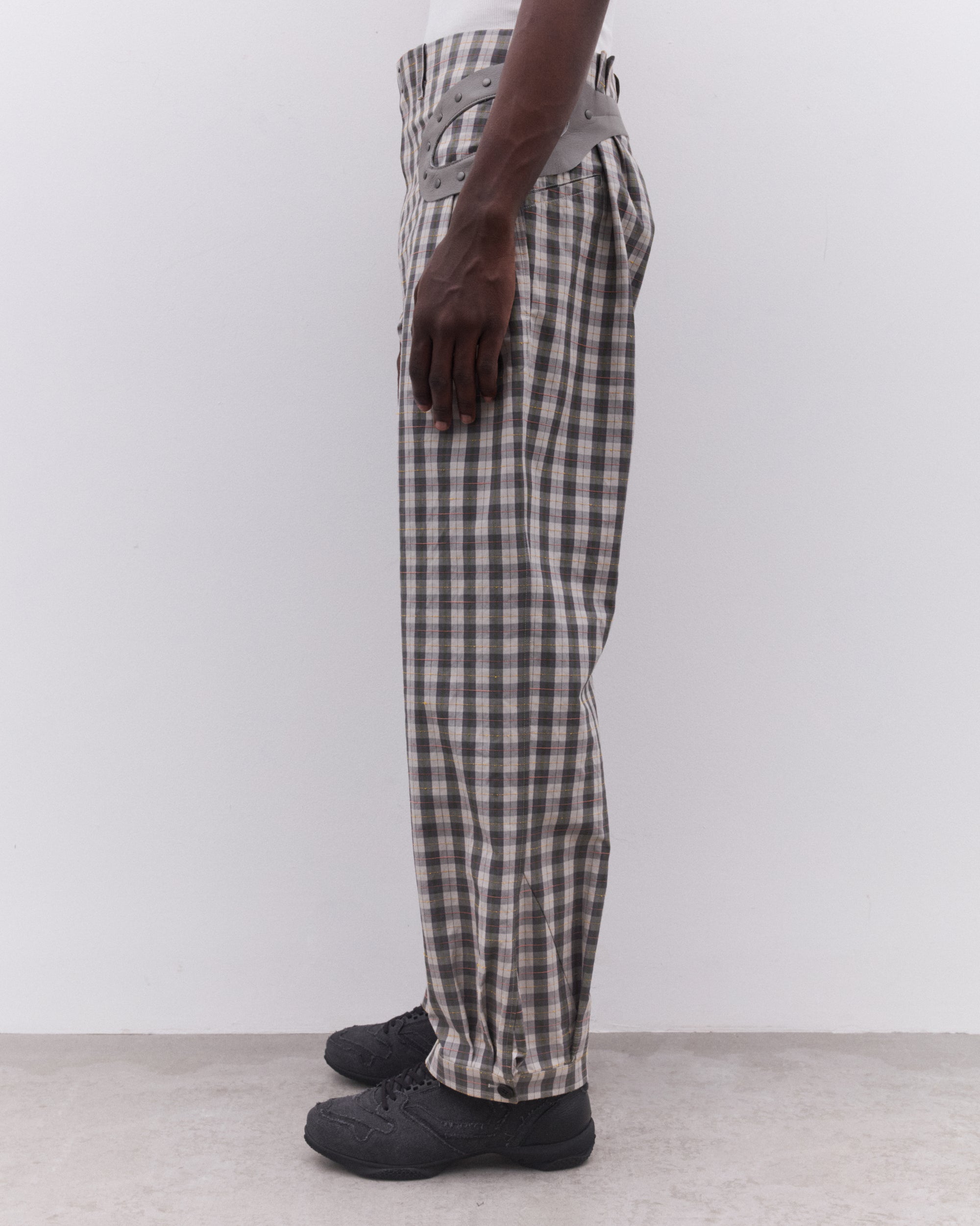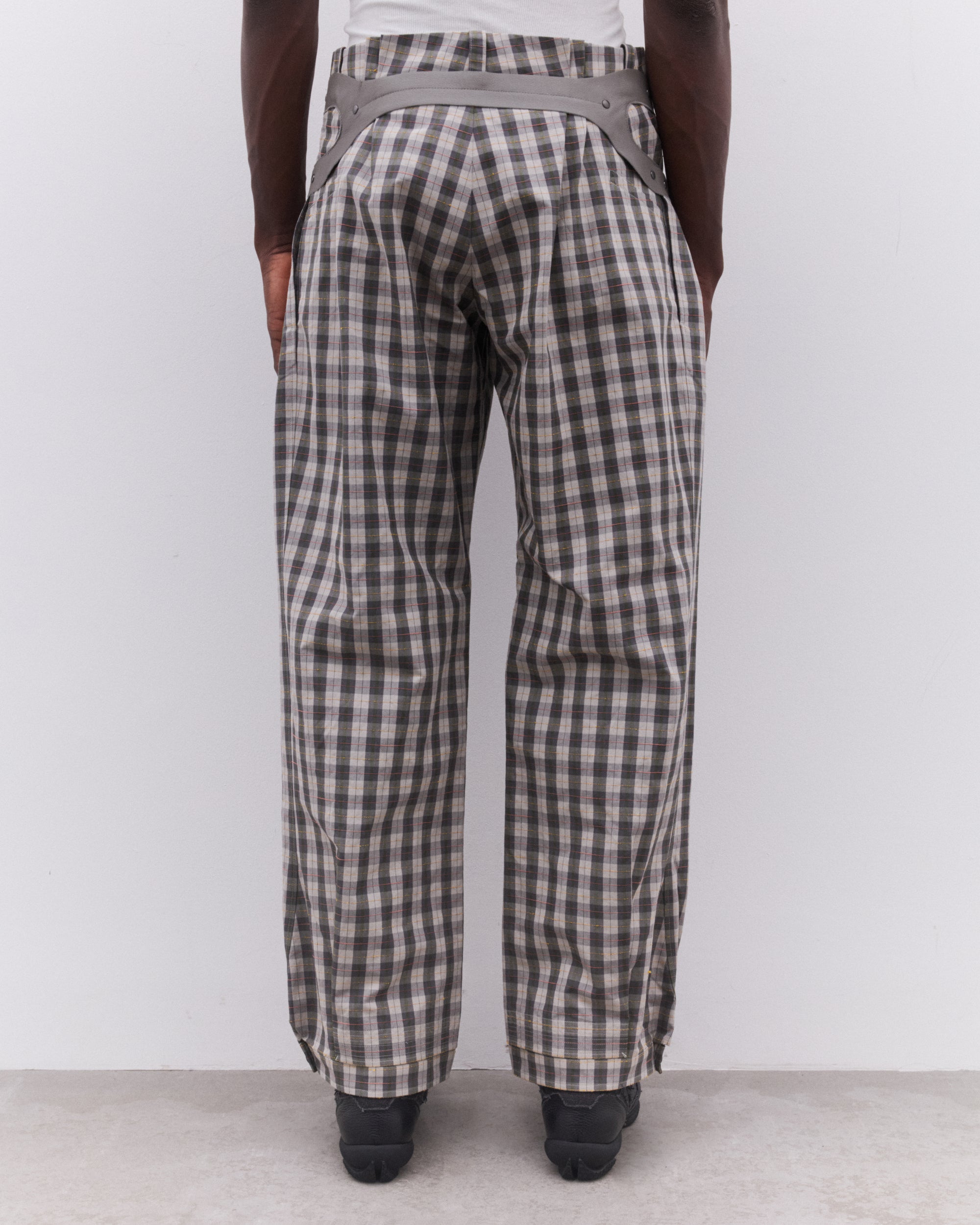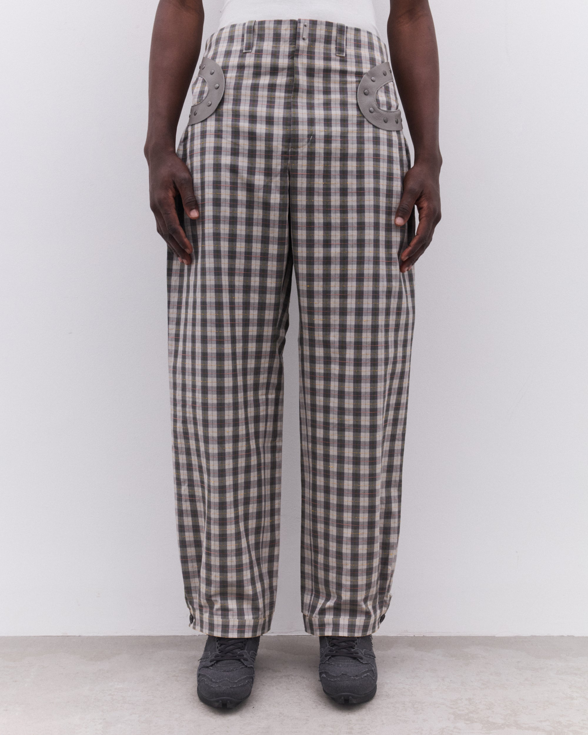 Regular silhouetteButton adjustable hemsCircular front pockets with leather detailingTextured check fabric
