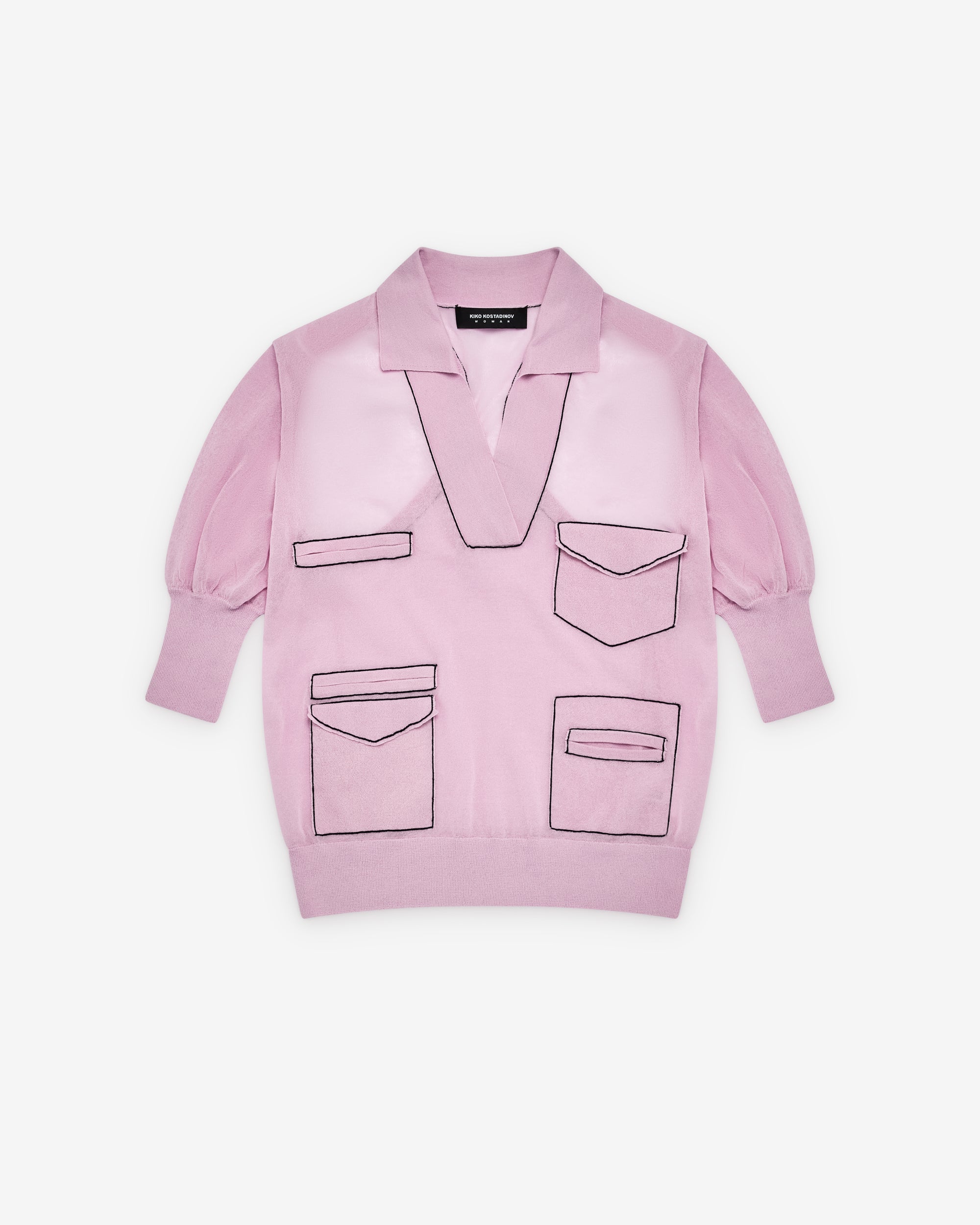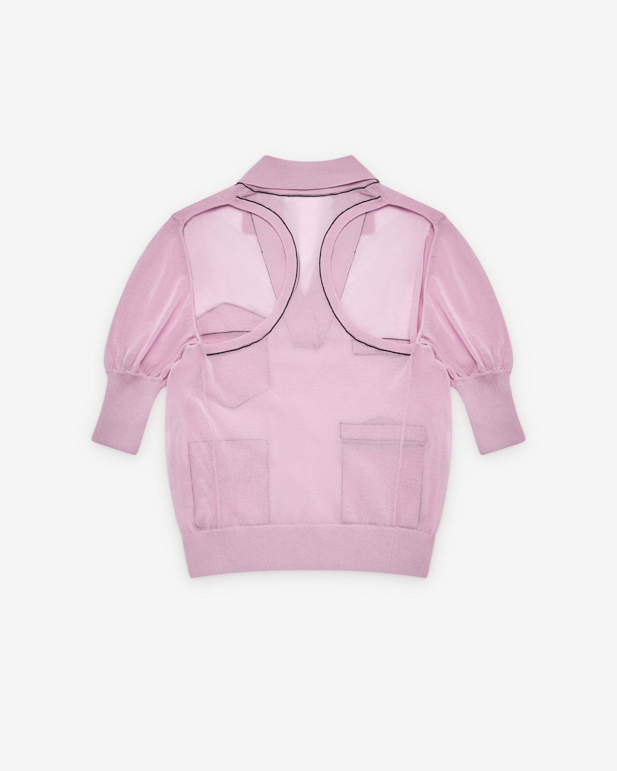 Lightweight sheer cotton fabricShort sleevesPolo style frontRacer back Ribbed knit trims Contrast crochet detailingWelt and flap pocket constructionsOversized cut
