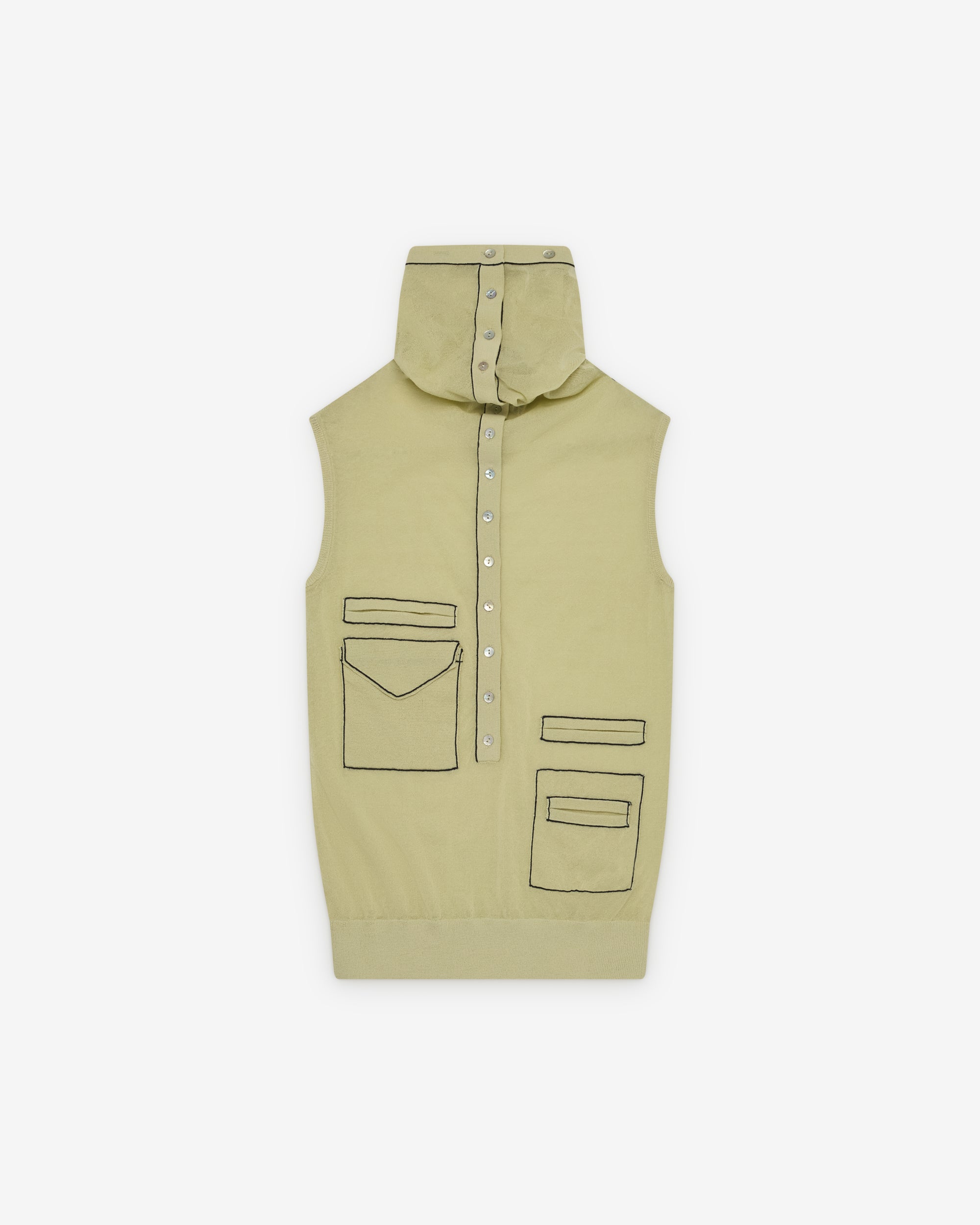 Lightweight sheer cotton fabricSleevelessContrast stitchingRollneck Button placketWelt and flap pocket constructions