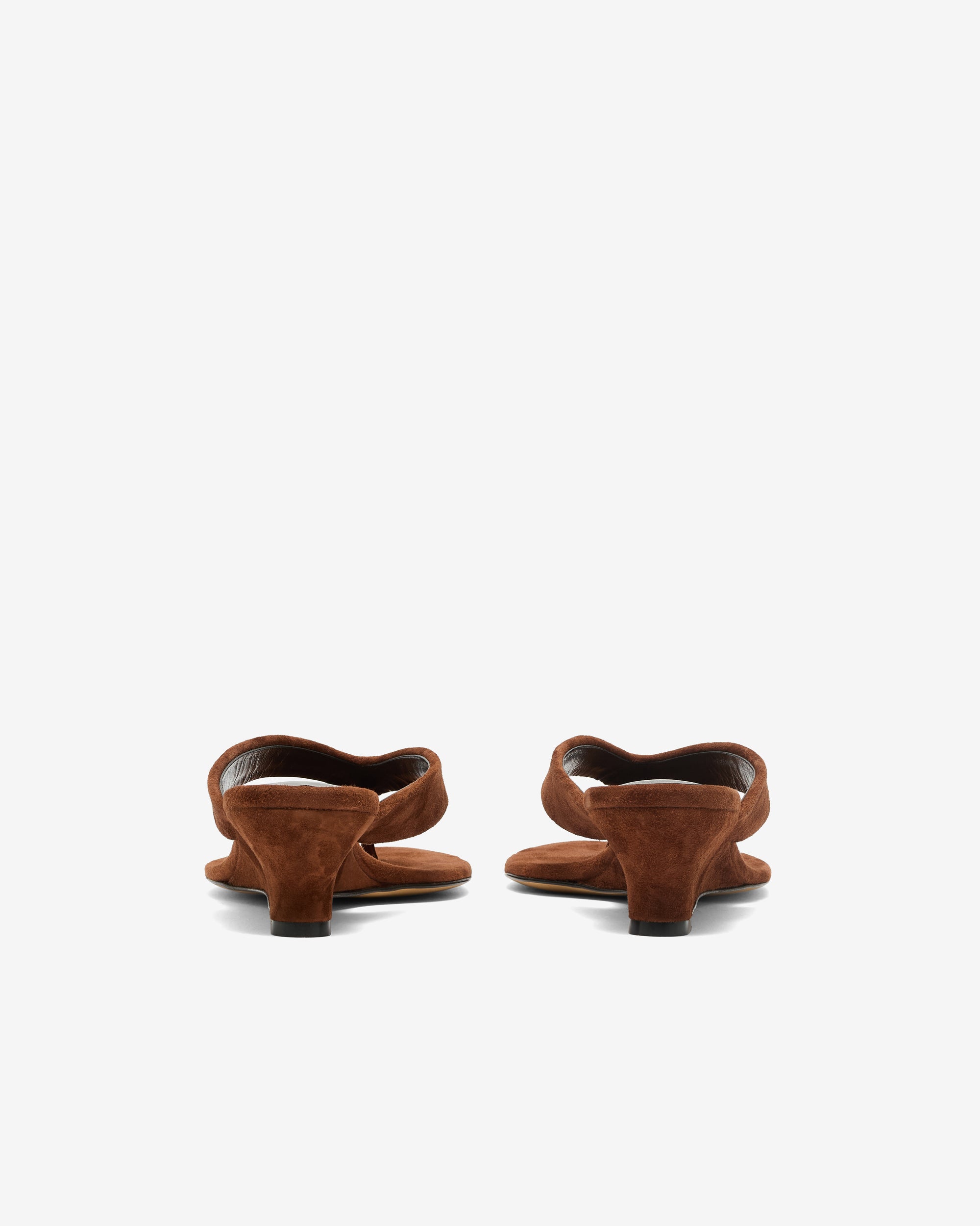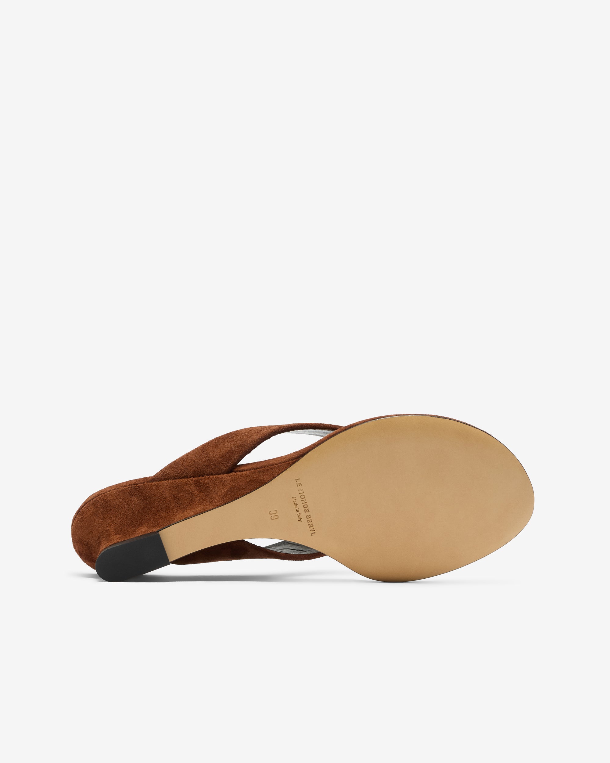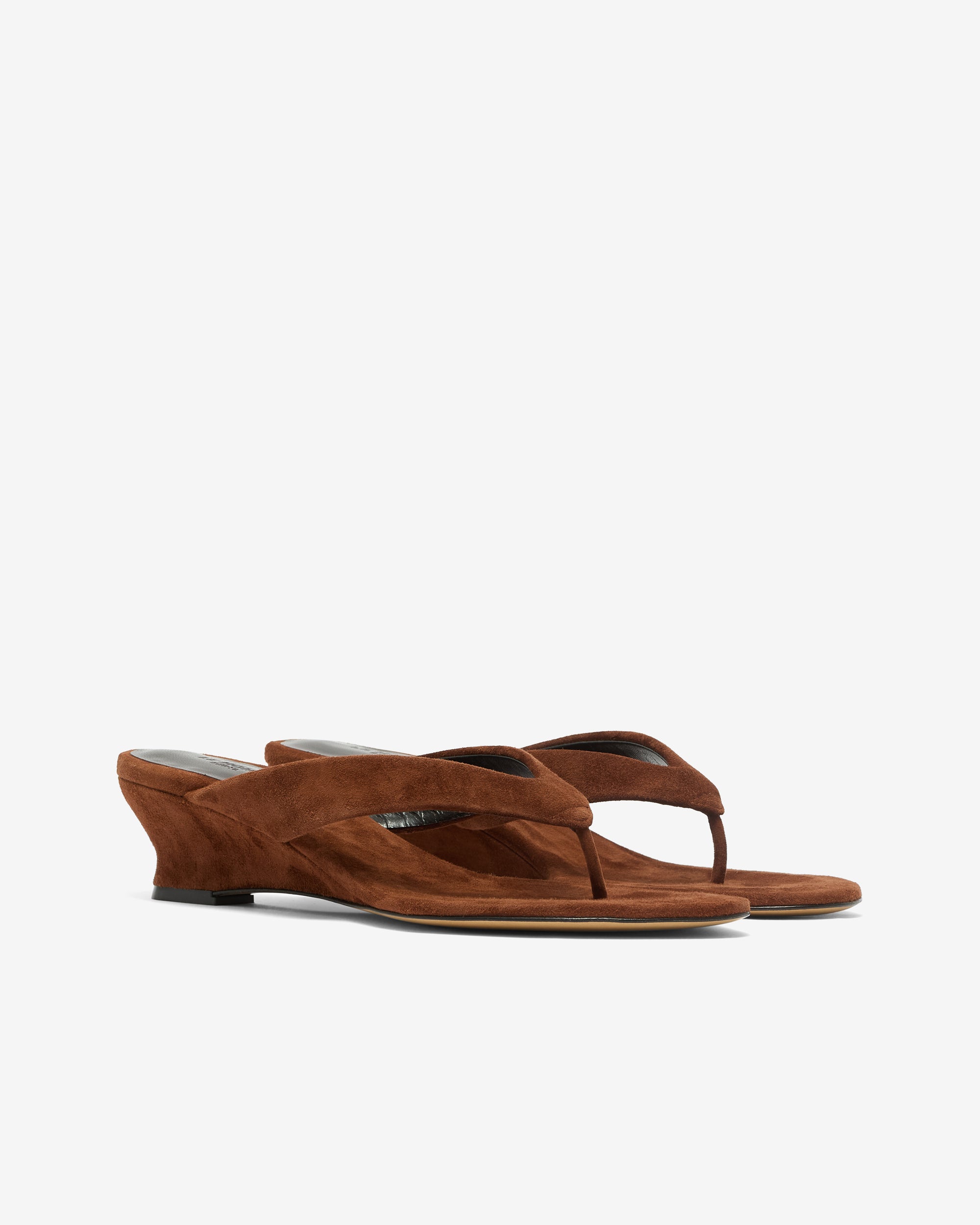 Micro wedge thong sandalCushioned calf leather insole and 40mm heelSuede upper