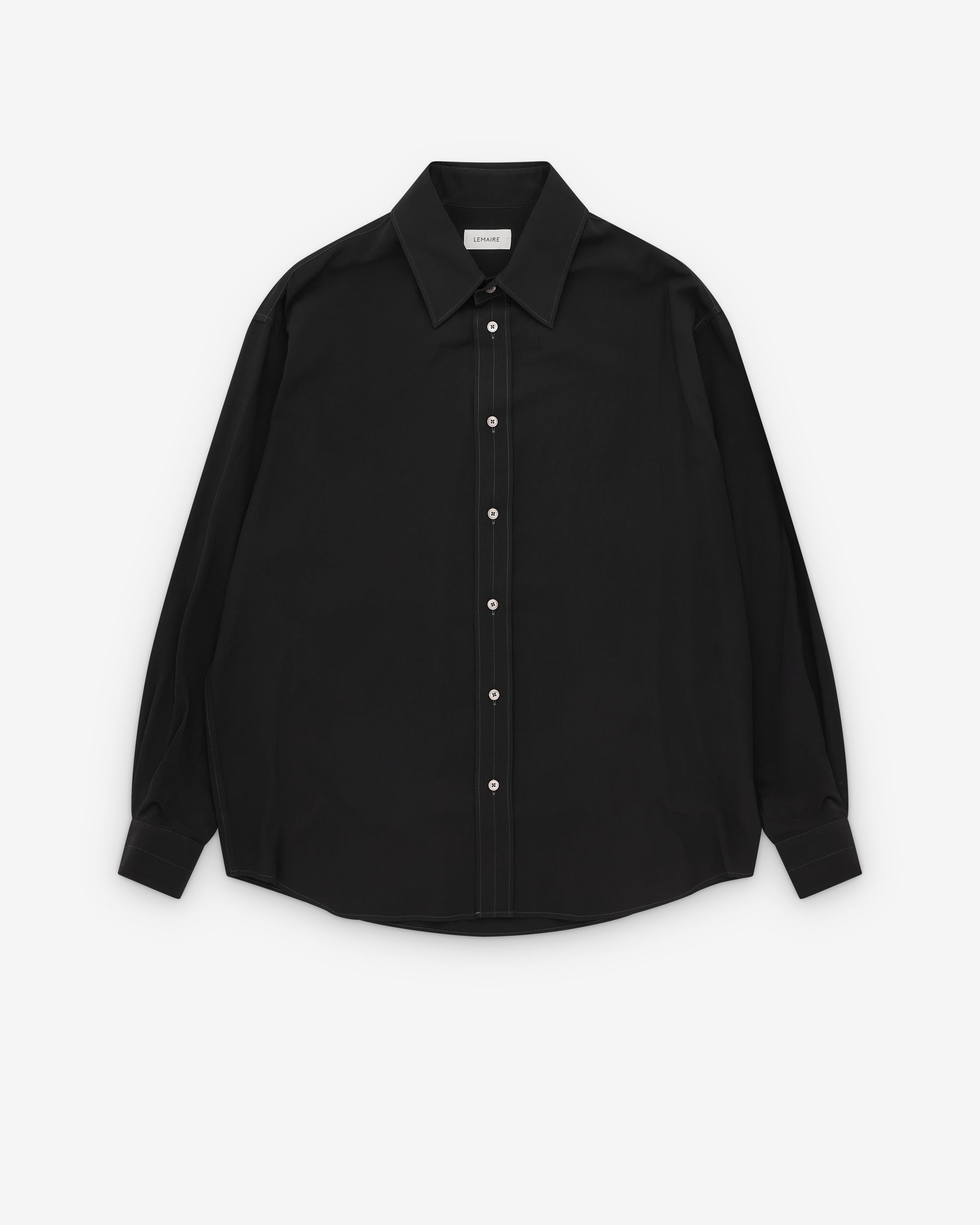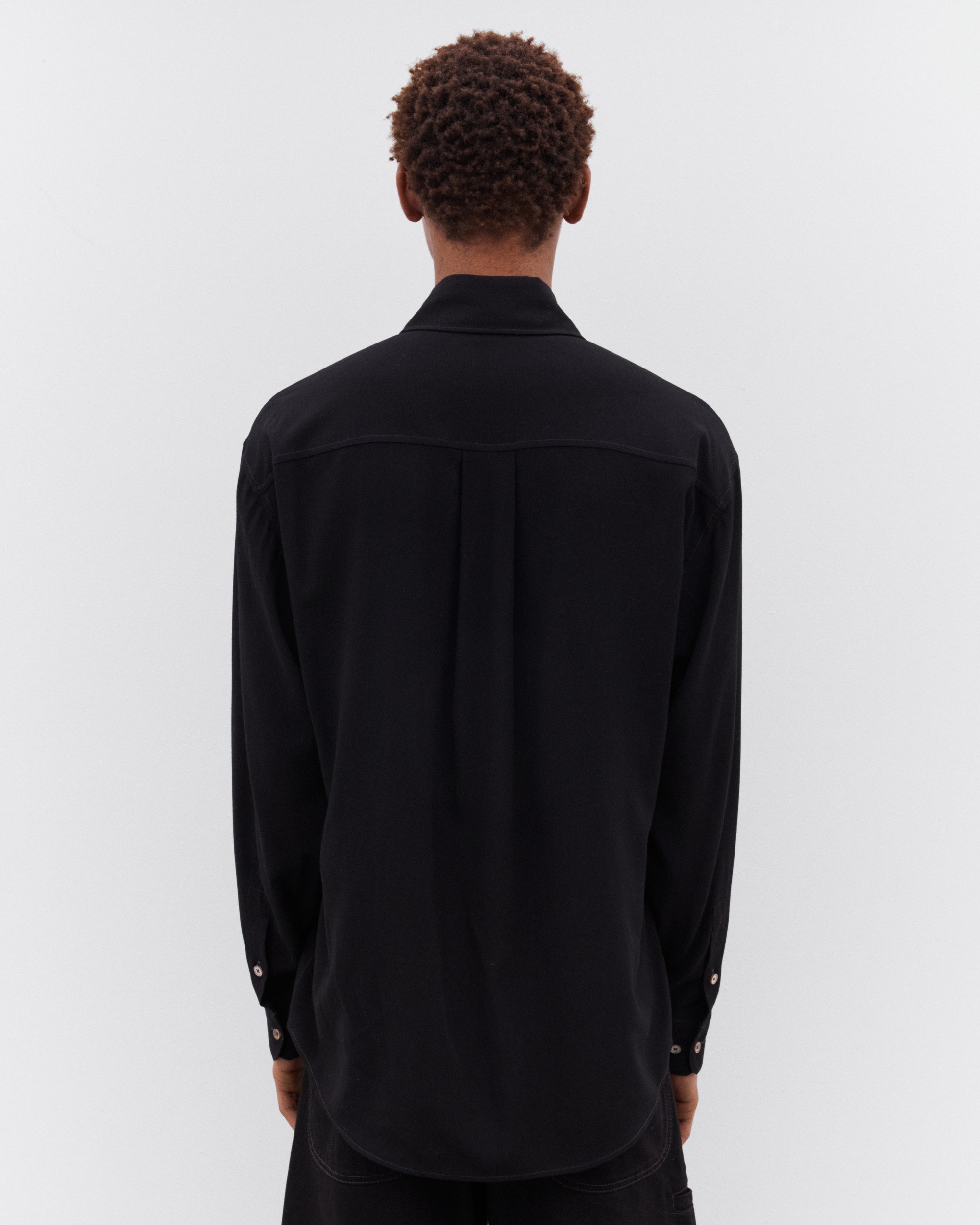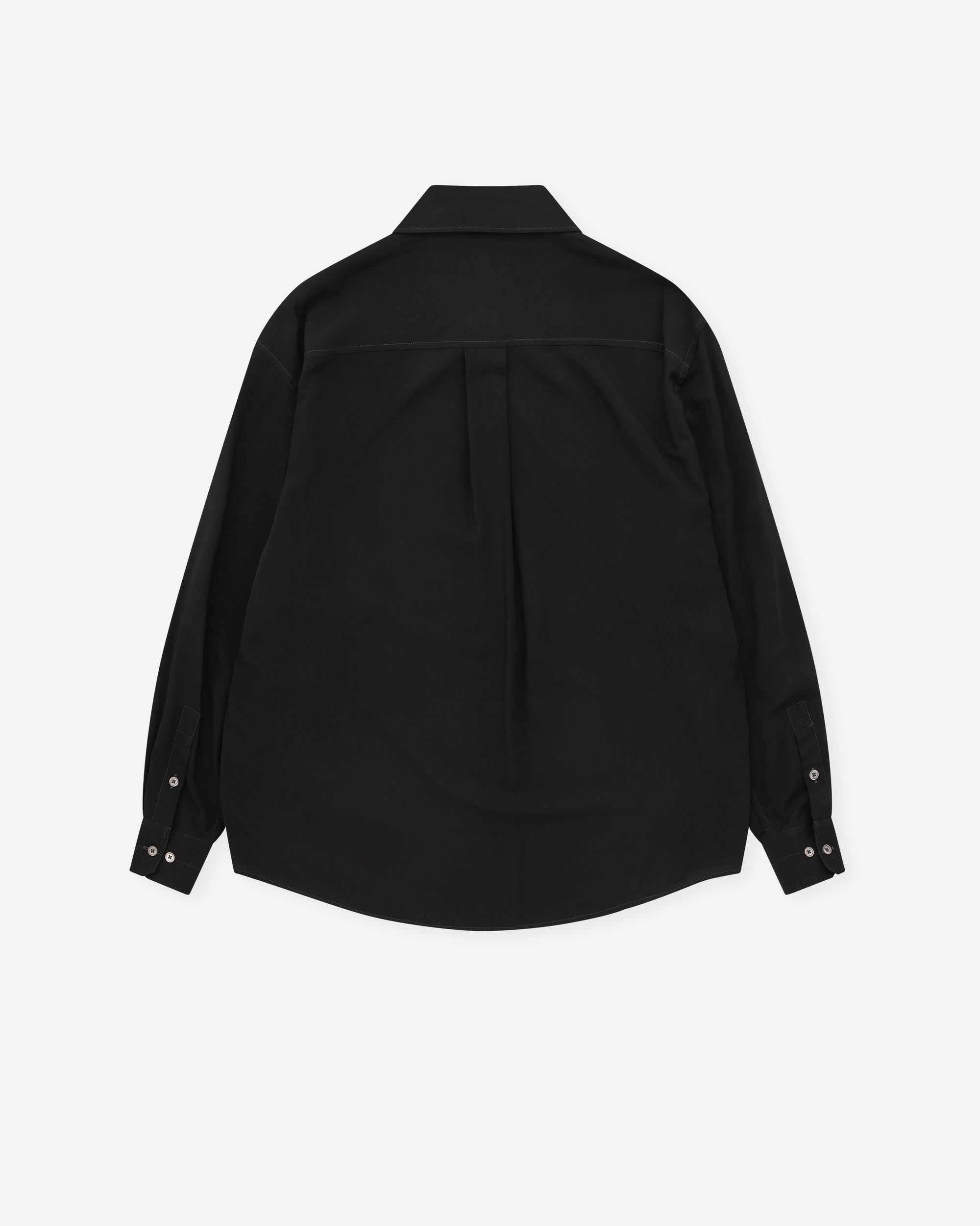 Oversized cutShirt collarFront button closureLong sleevesStraight buttoned cuffsMother-of-pearl buttonsFlat pleat at the backContrast topstitching