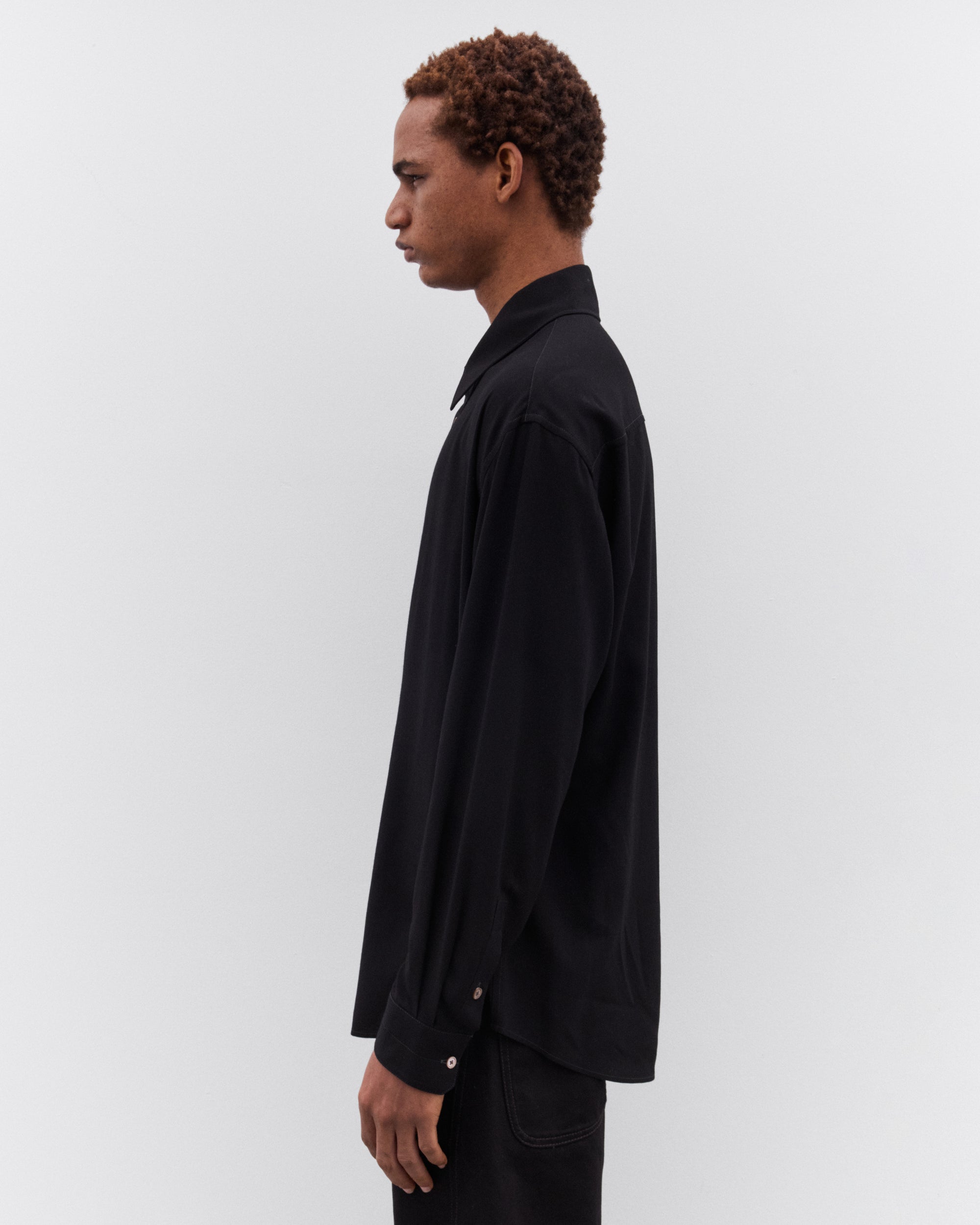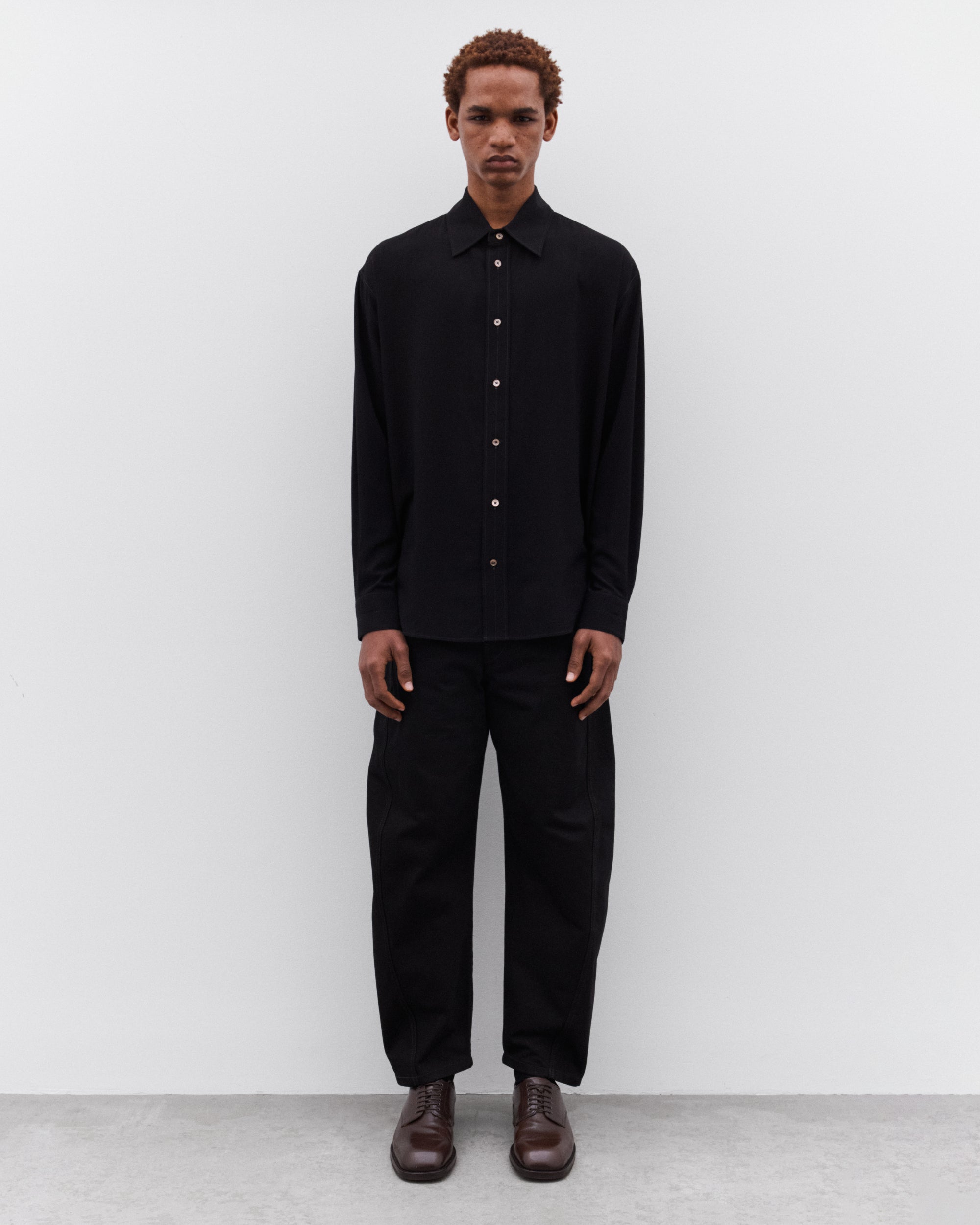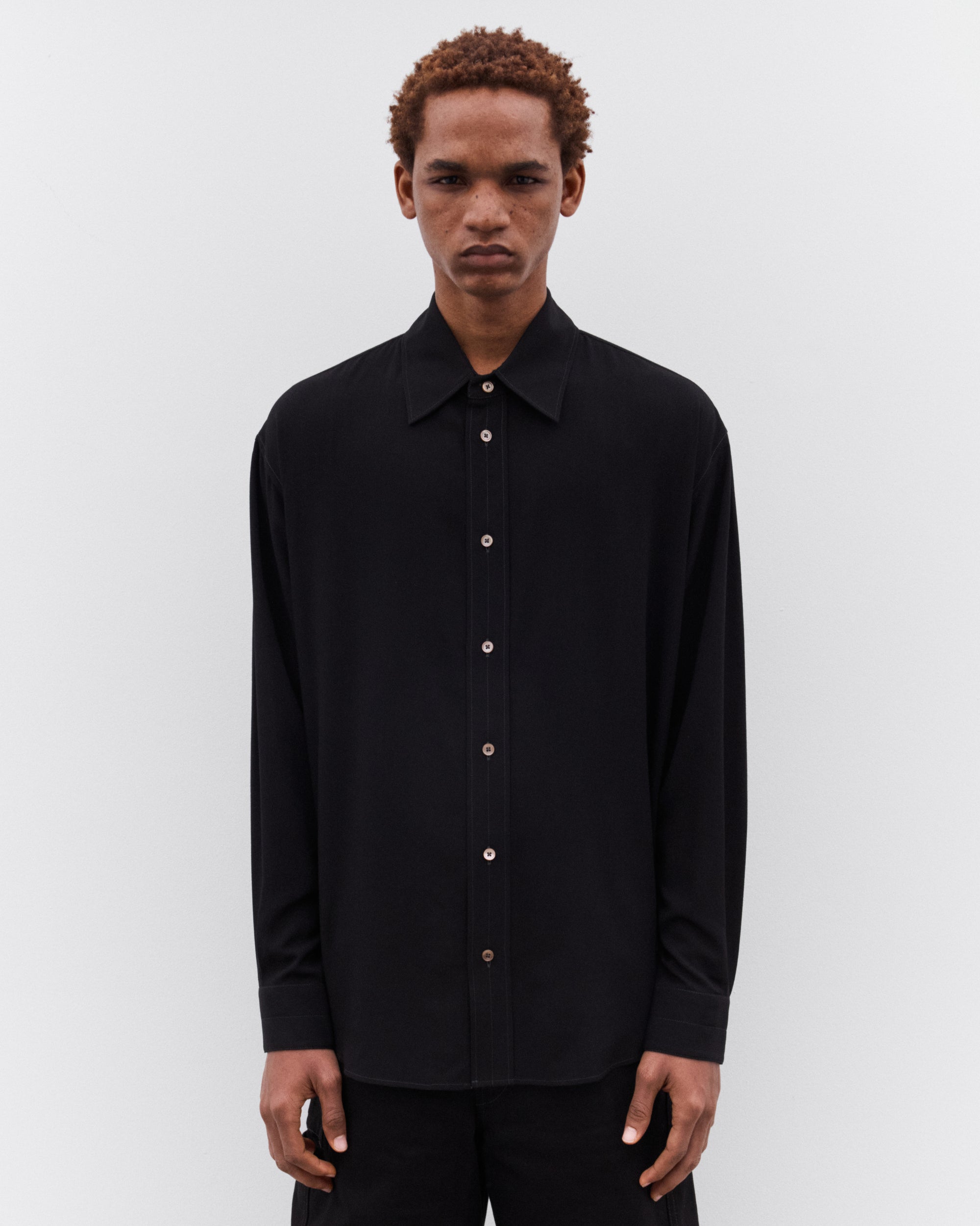 Oversized cutShirt collarFront button closureLong sleevesStraight buttoned cuffsMother-of-pearl buttonsFlat pleat at the backContrast topstitching