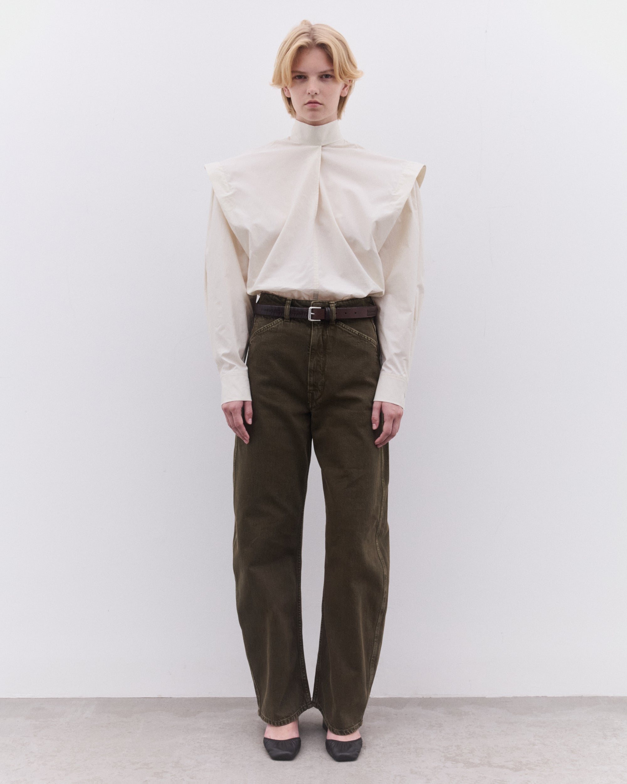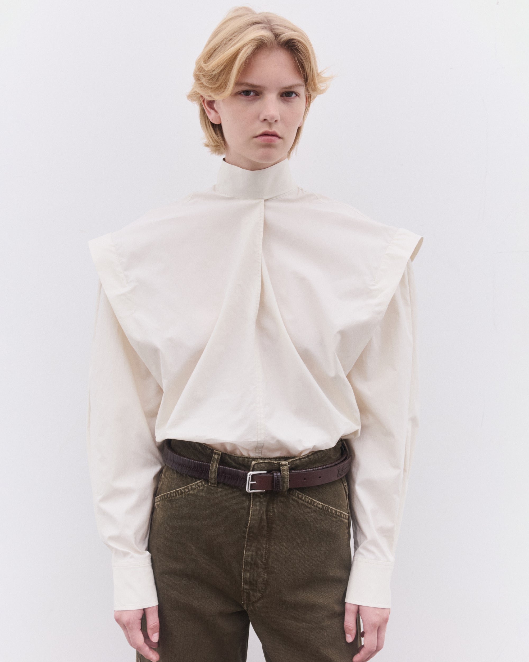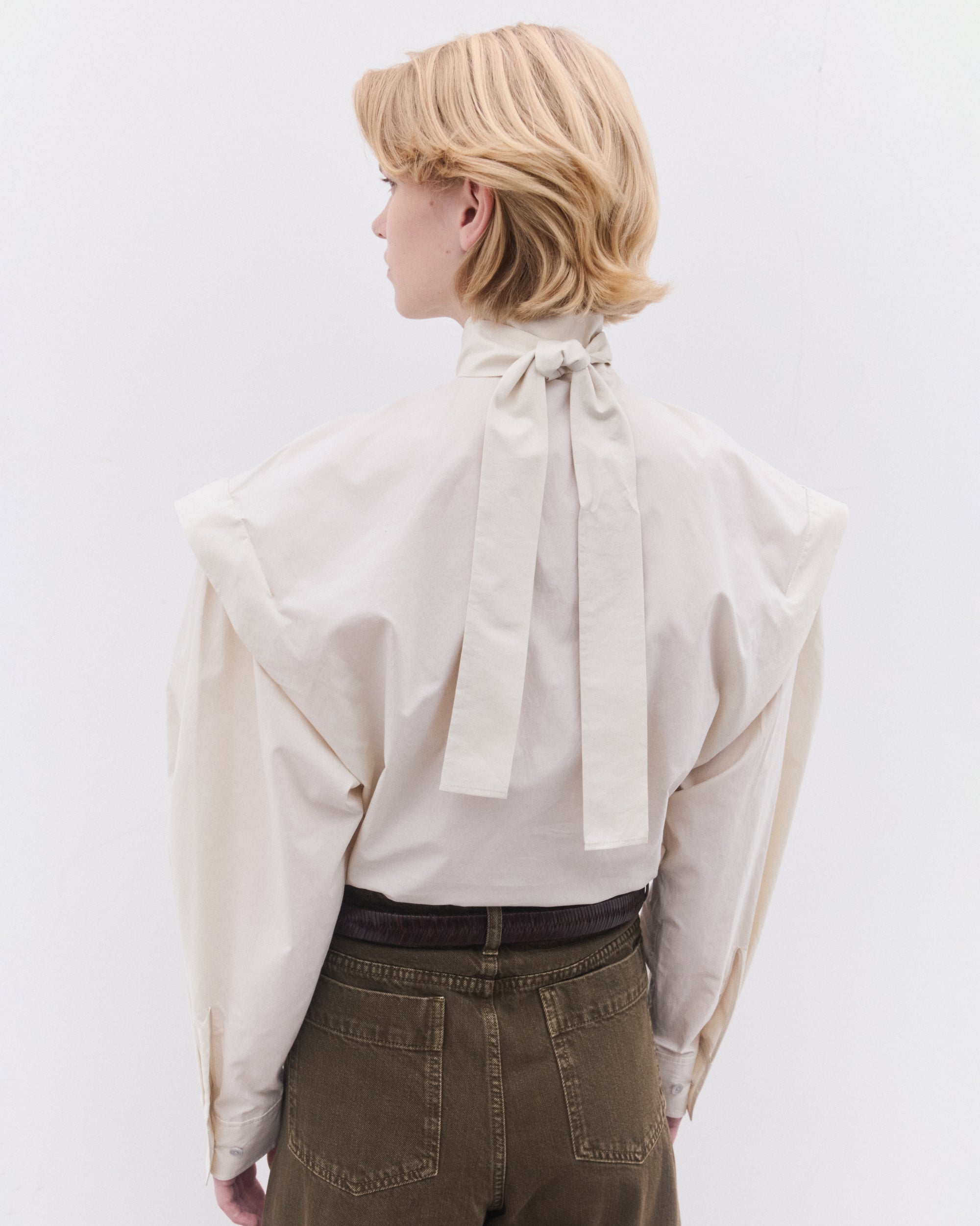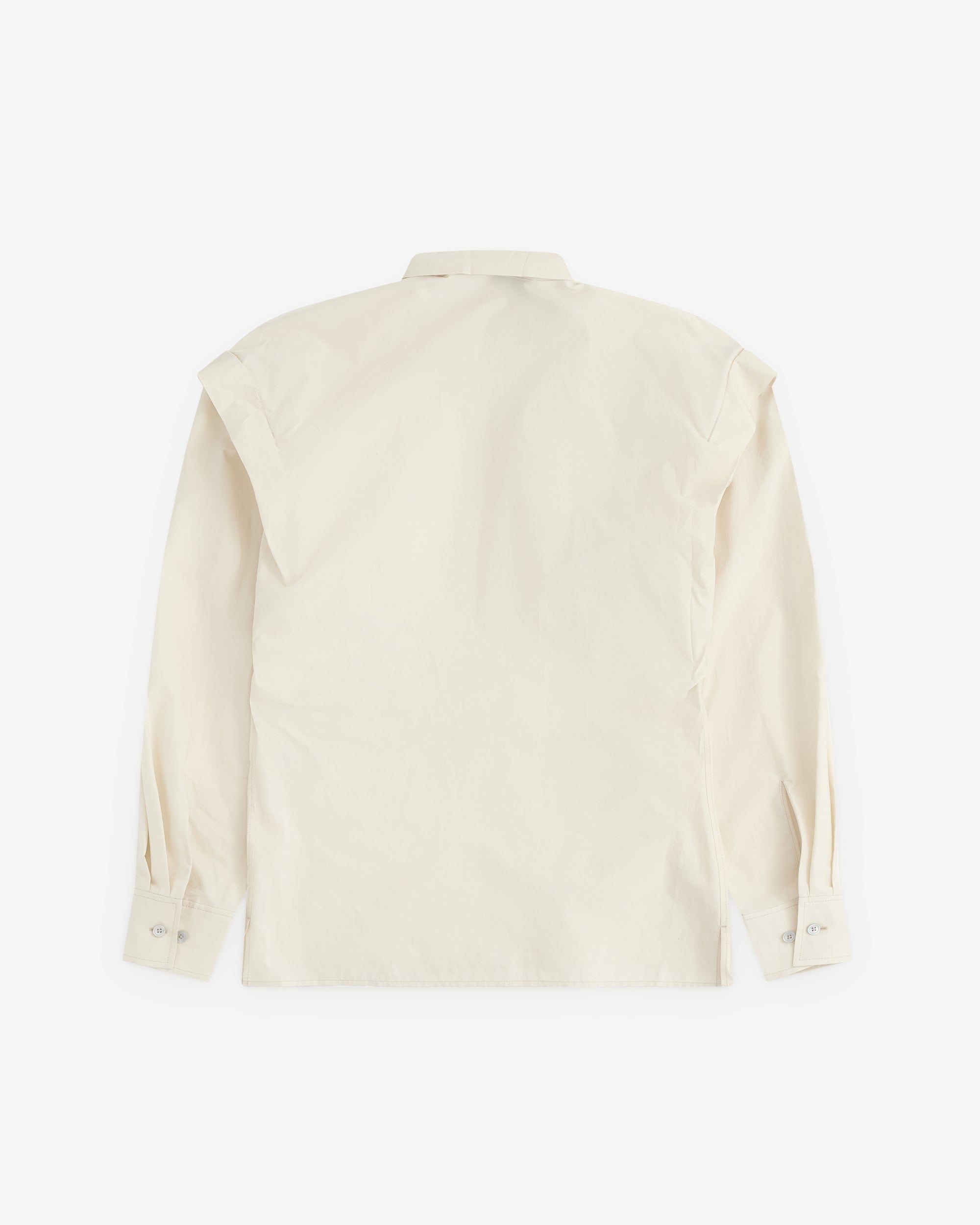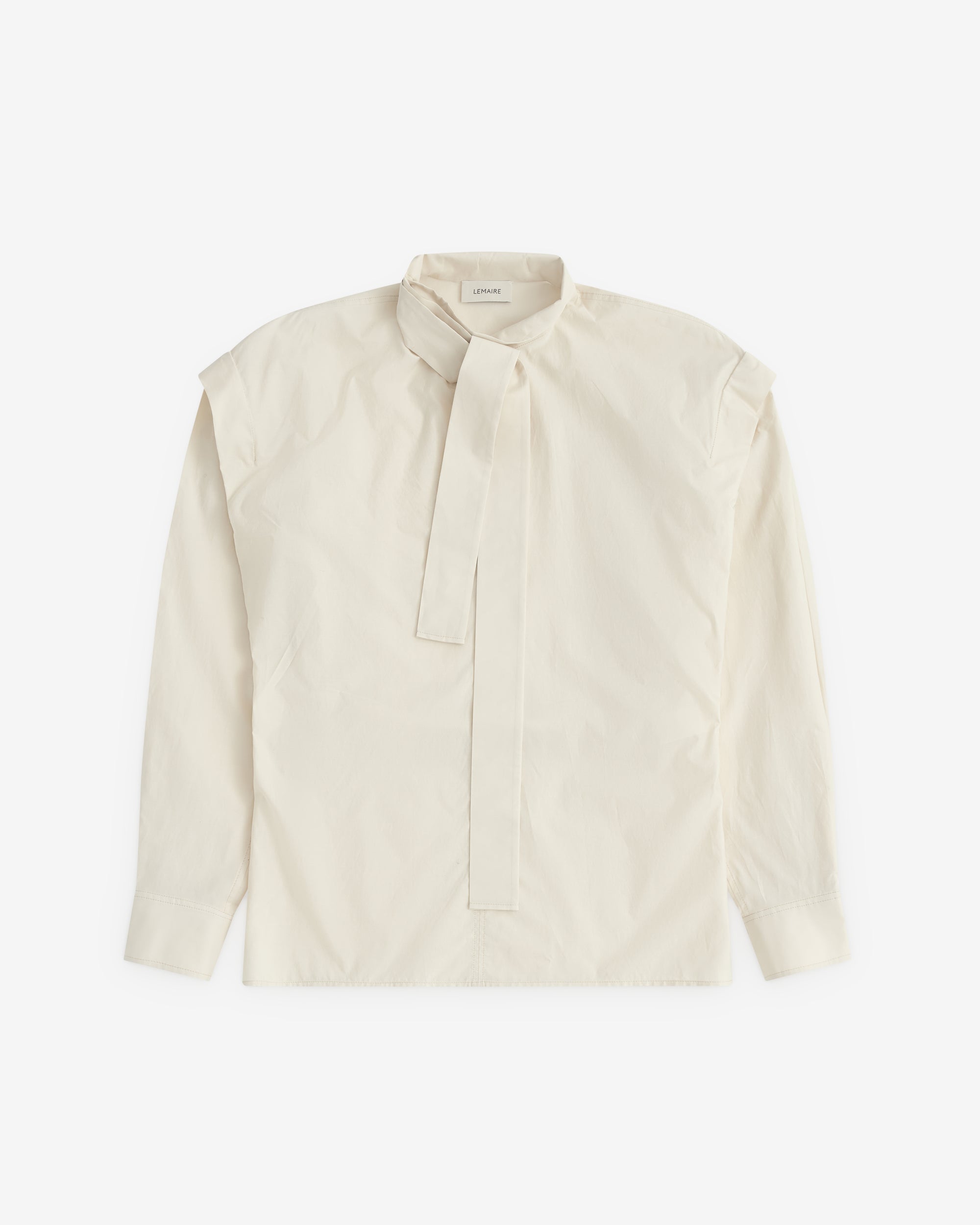 Straight cutAscot collar with side slitShoulder pleatsTrompe-l’oeil-style sleevesStraight buttoned cuffsFront slit
