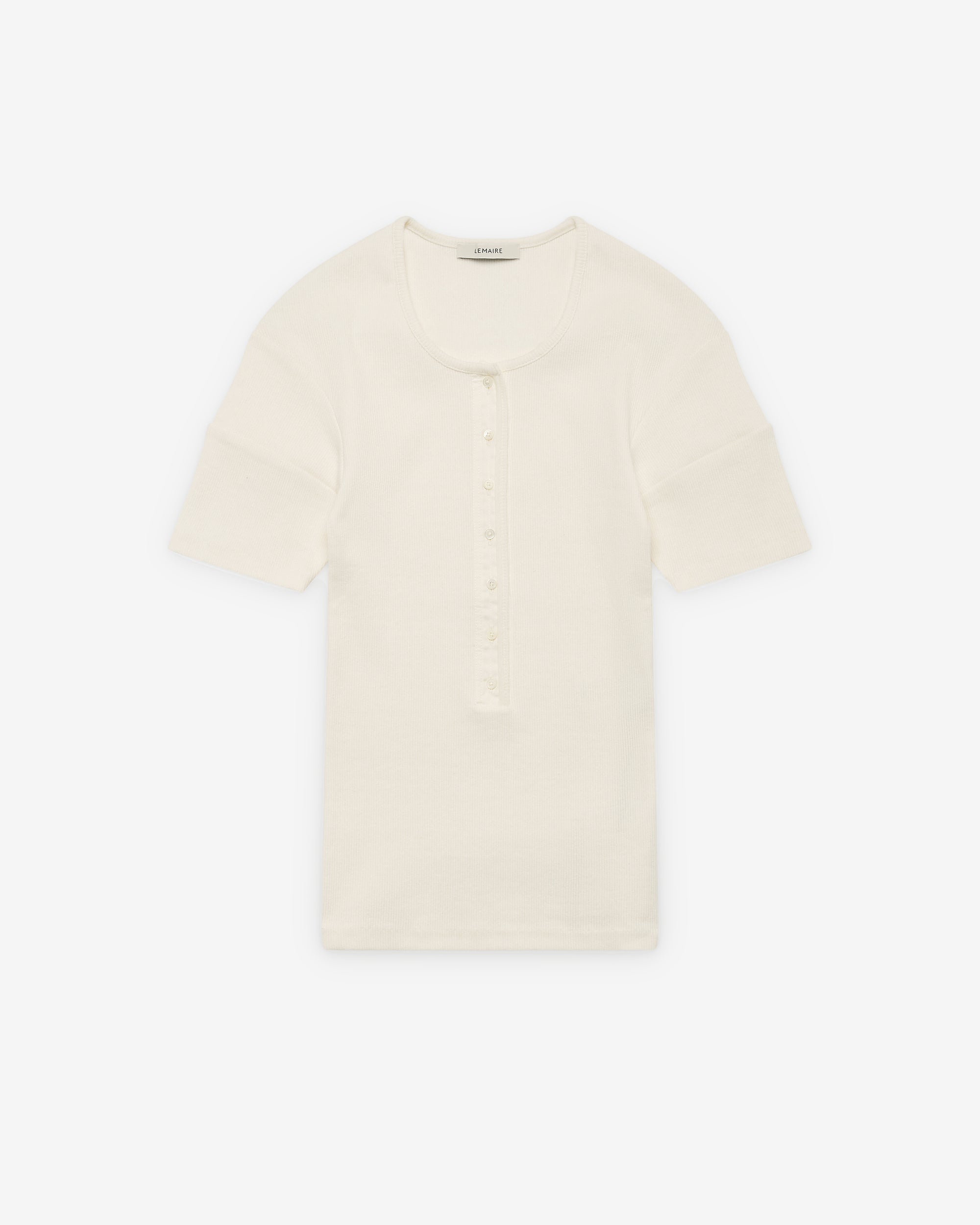 Fitted Henley in Cotton Linen Rib JerseyFitted cutTunisian collarContrast fabric detail on the buttoning3D effect shoulder pleatsMother-of-pearl buttons