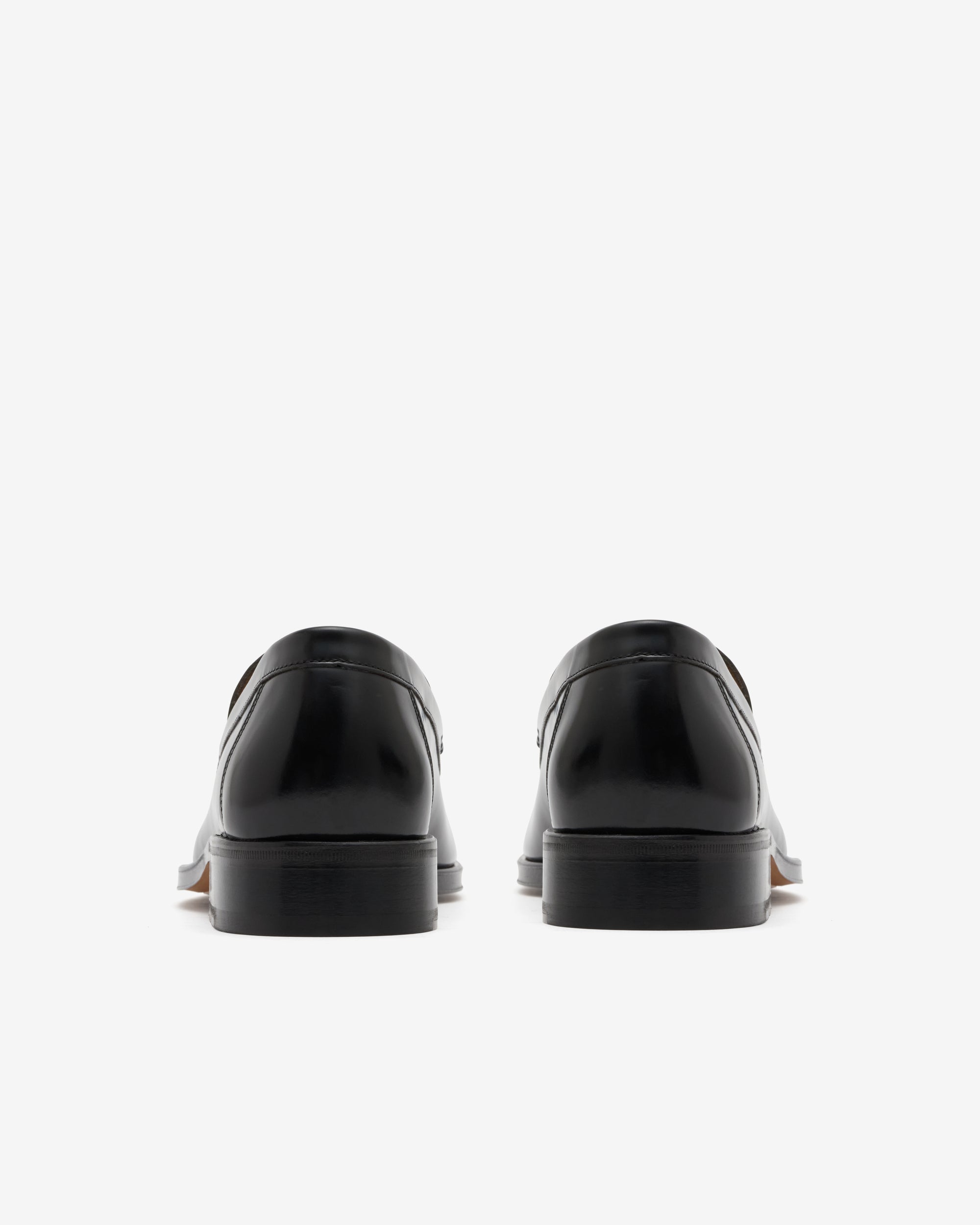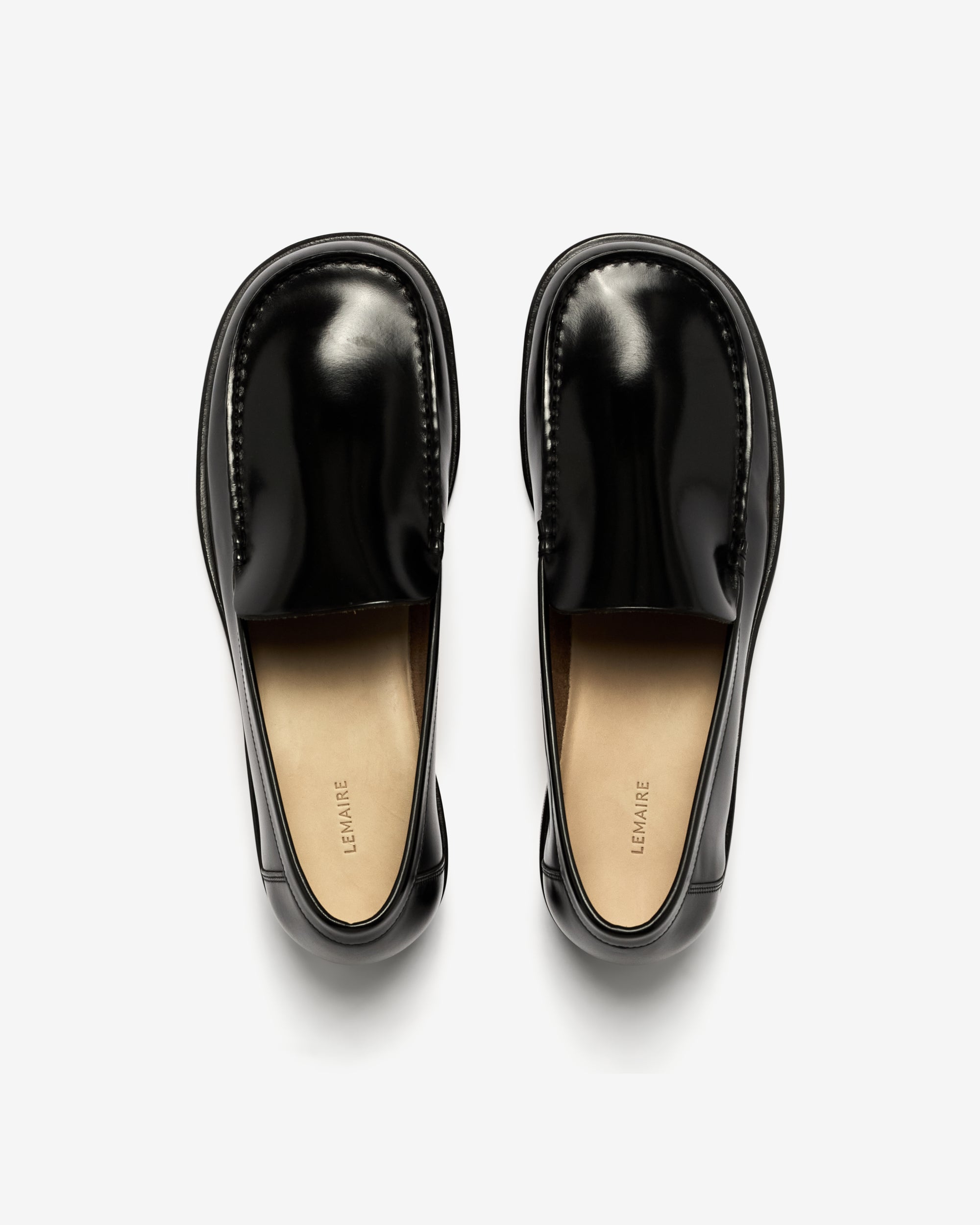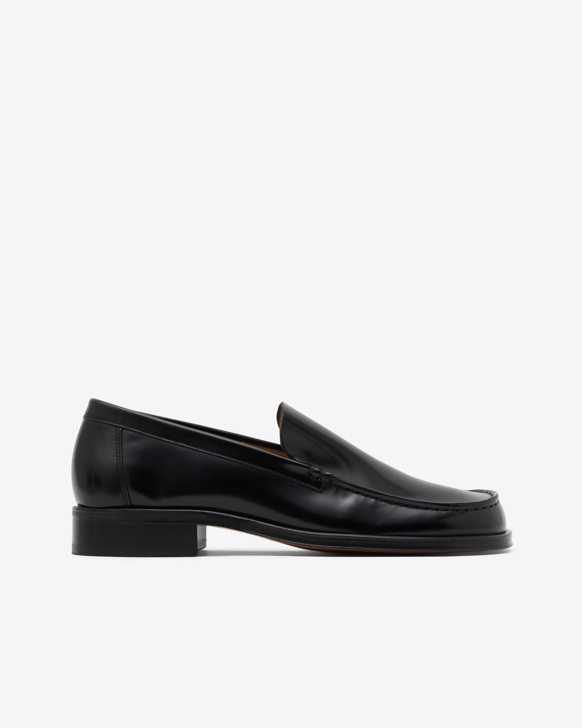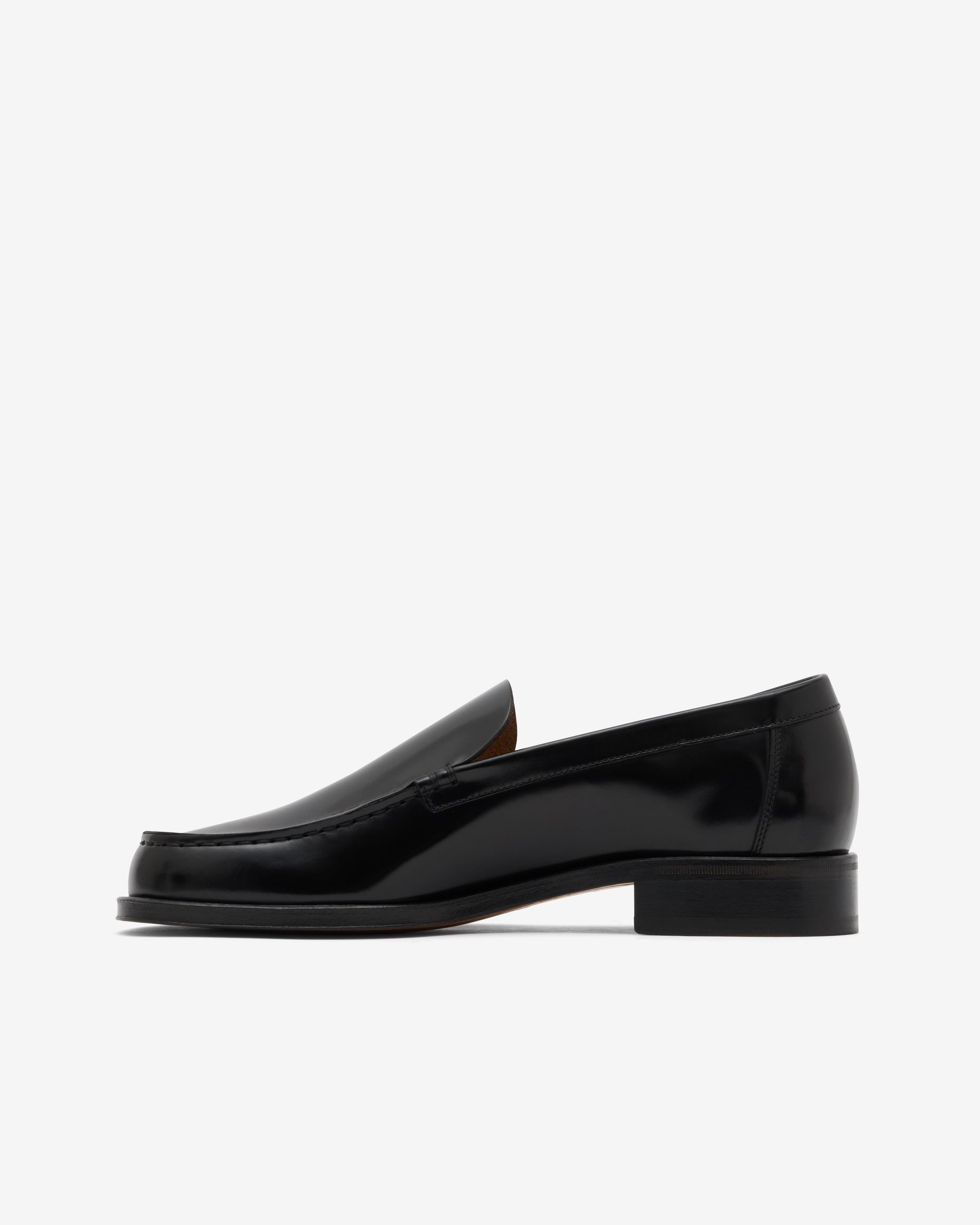Shiny calfskin leather loafersSlip-on modelElongated square toeTone-on-tone topstitched detailingLeather outsole, insole, and lining