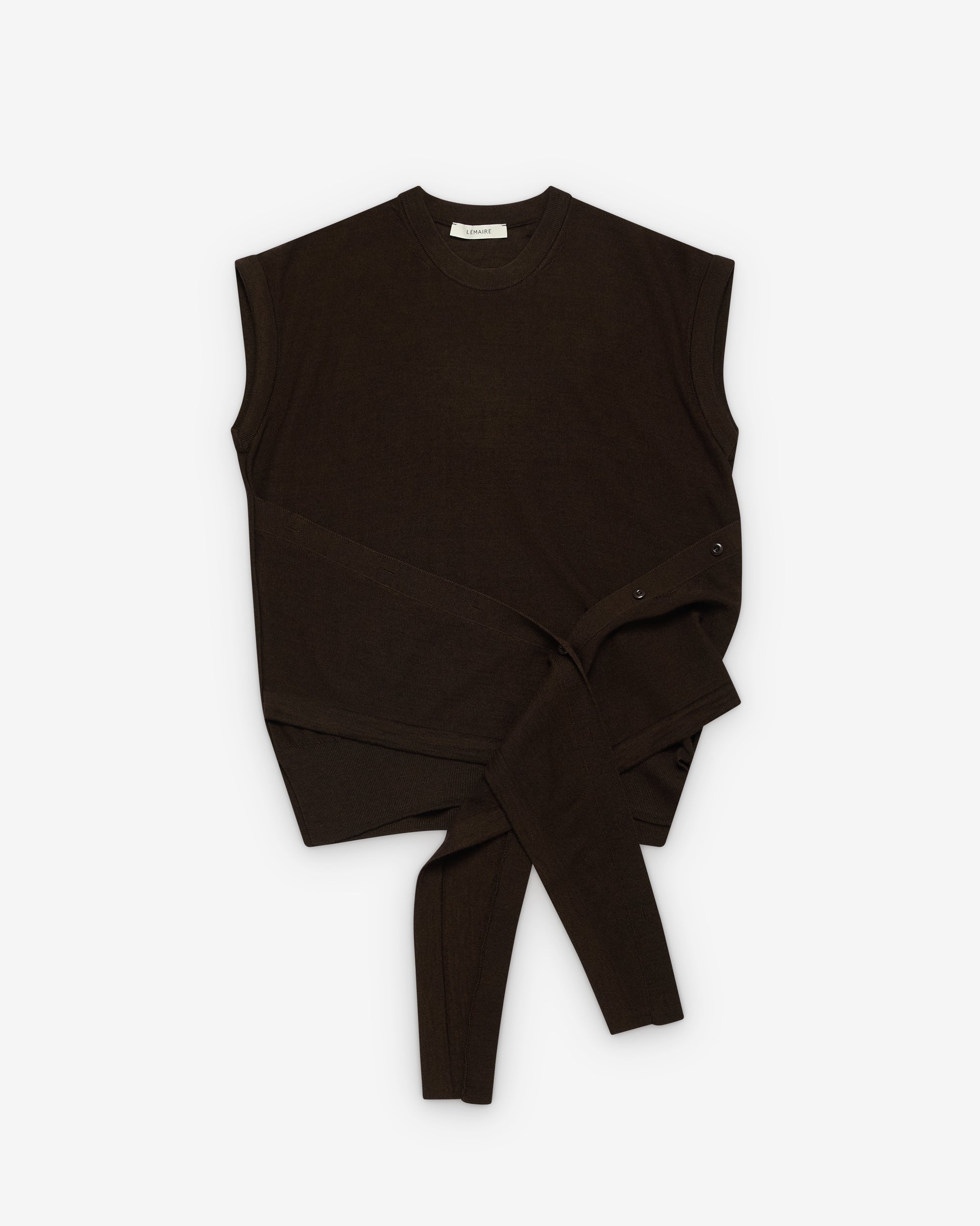 Rounded necklineSleeveless pullover styleButton up wrap around panelFine wool blend knit