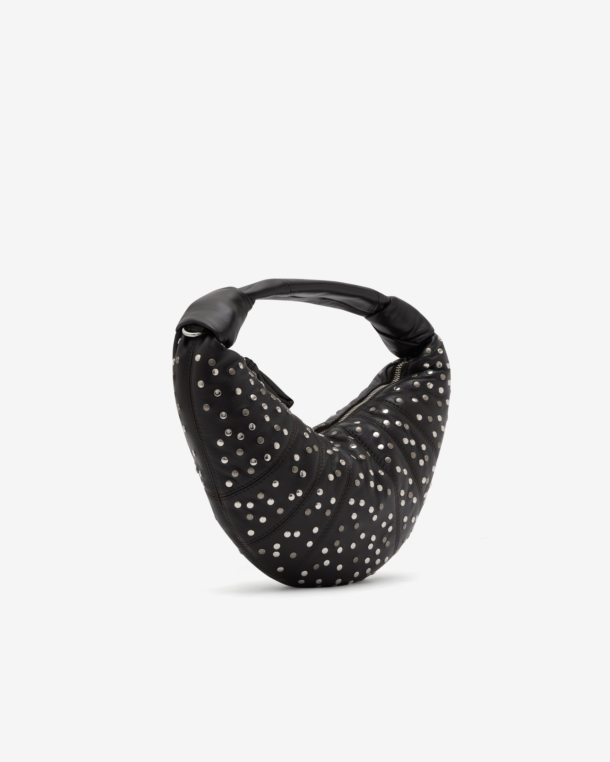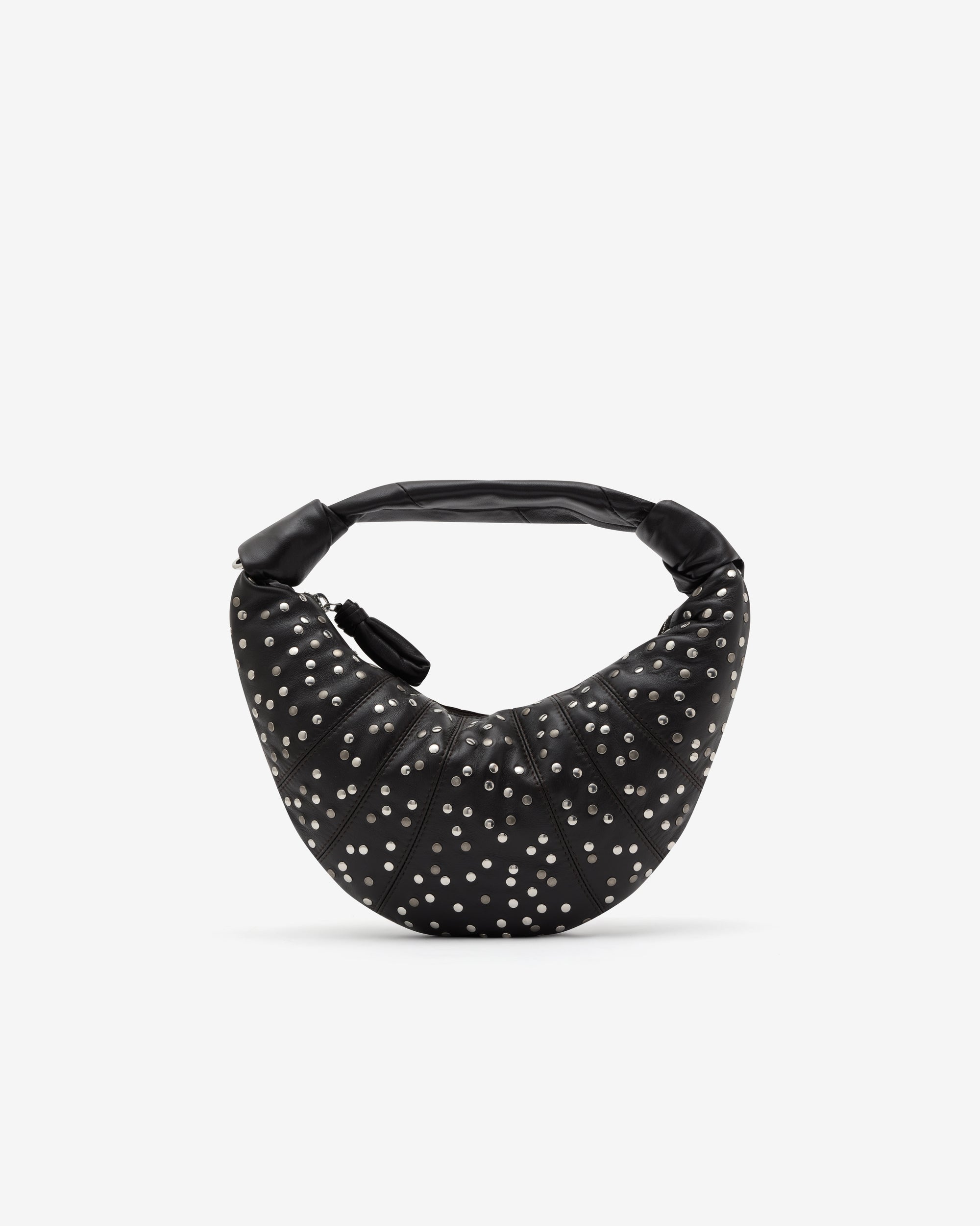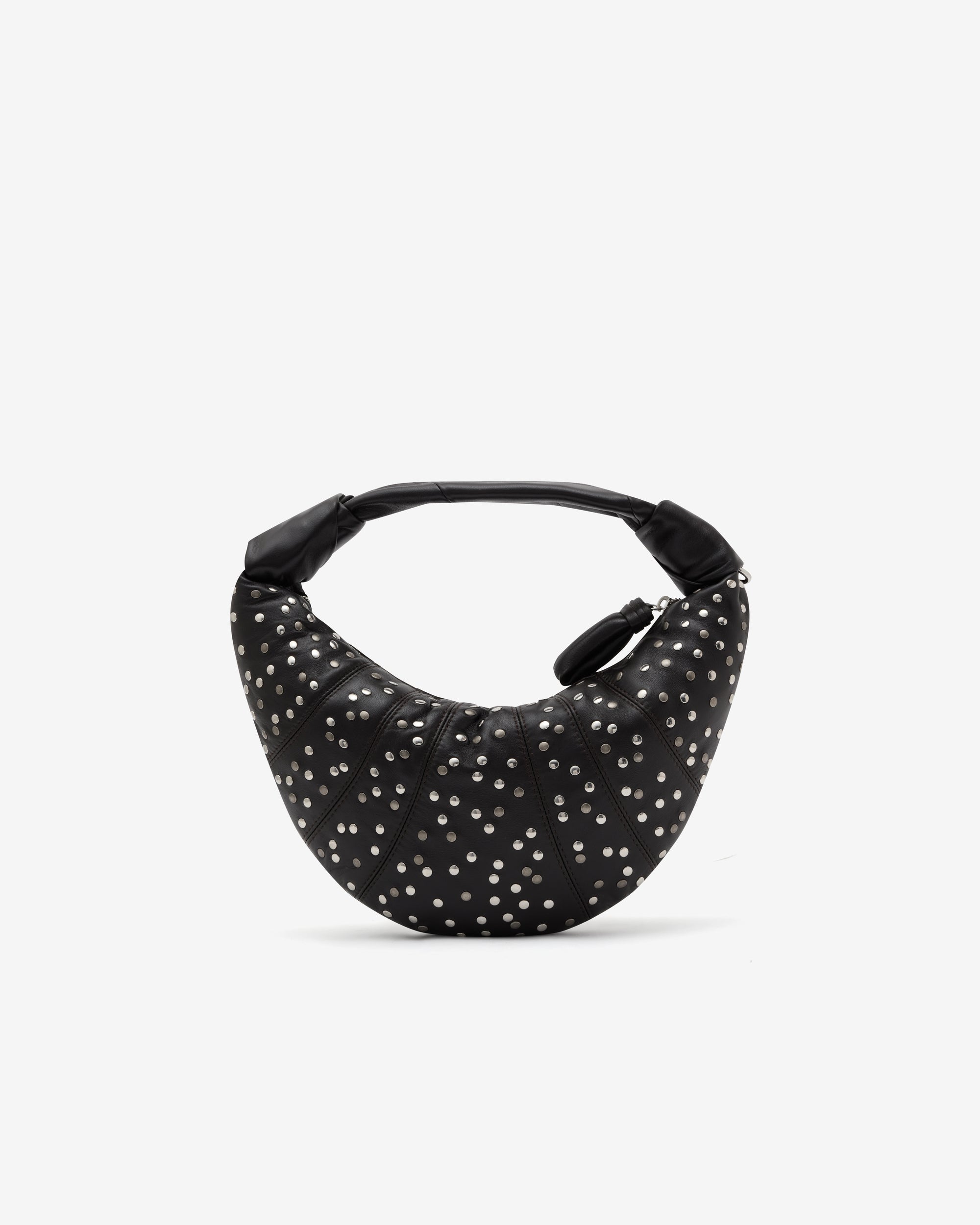 Top carry handle Studded dots all over Lining in cotton canvas Height of the shoulder strap: 18cm/7in Length: 28cm/11in Width: 8cm/3in Depth: 19cm/7,5in Side knot finishings Metal zip puller with buckle in matching fabric
