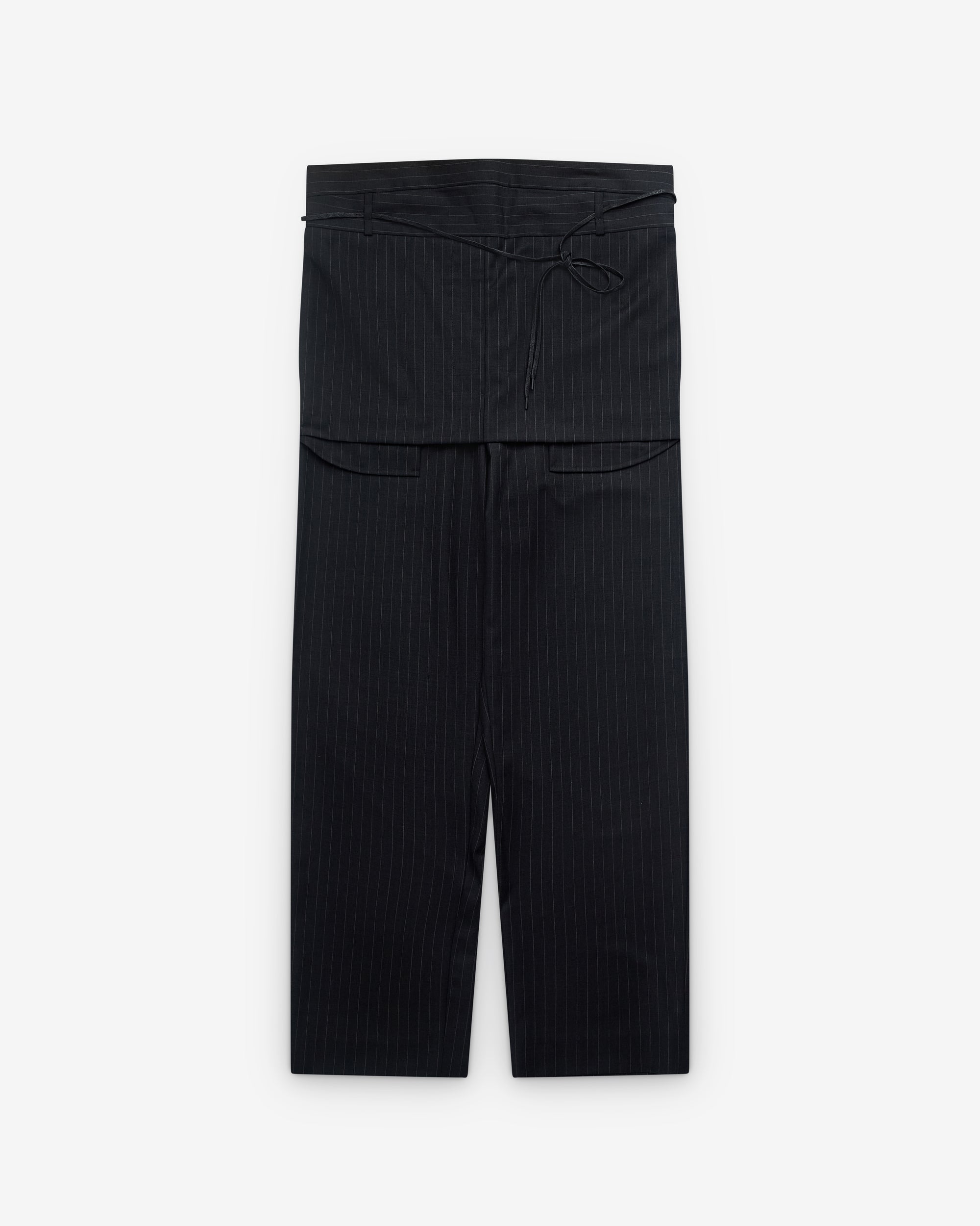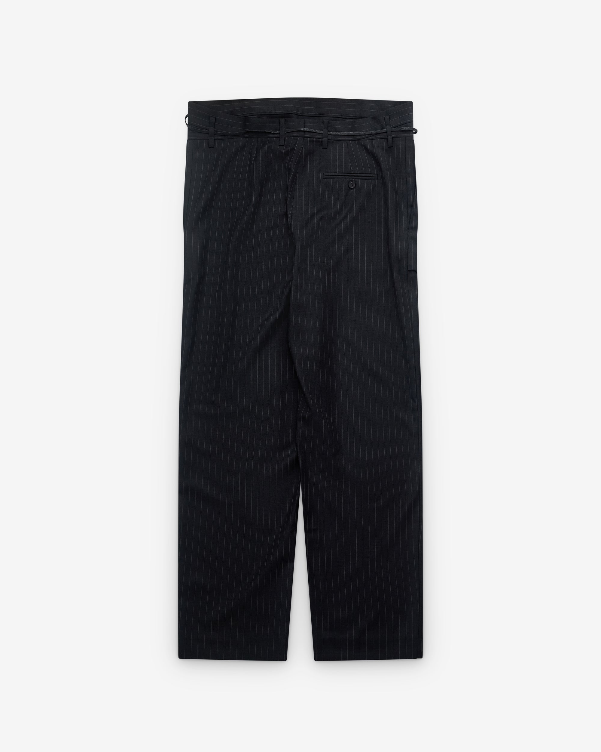 Wide, straight legFront skirt overlayTie waist beltRear welt pocketBelt loops