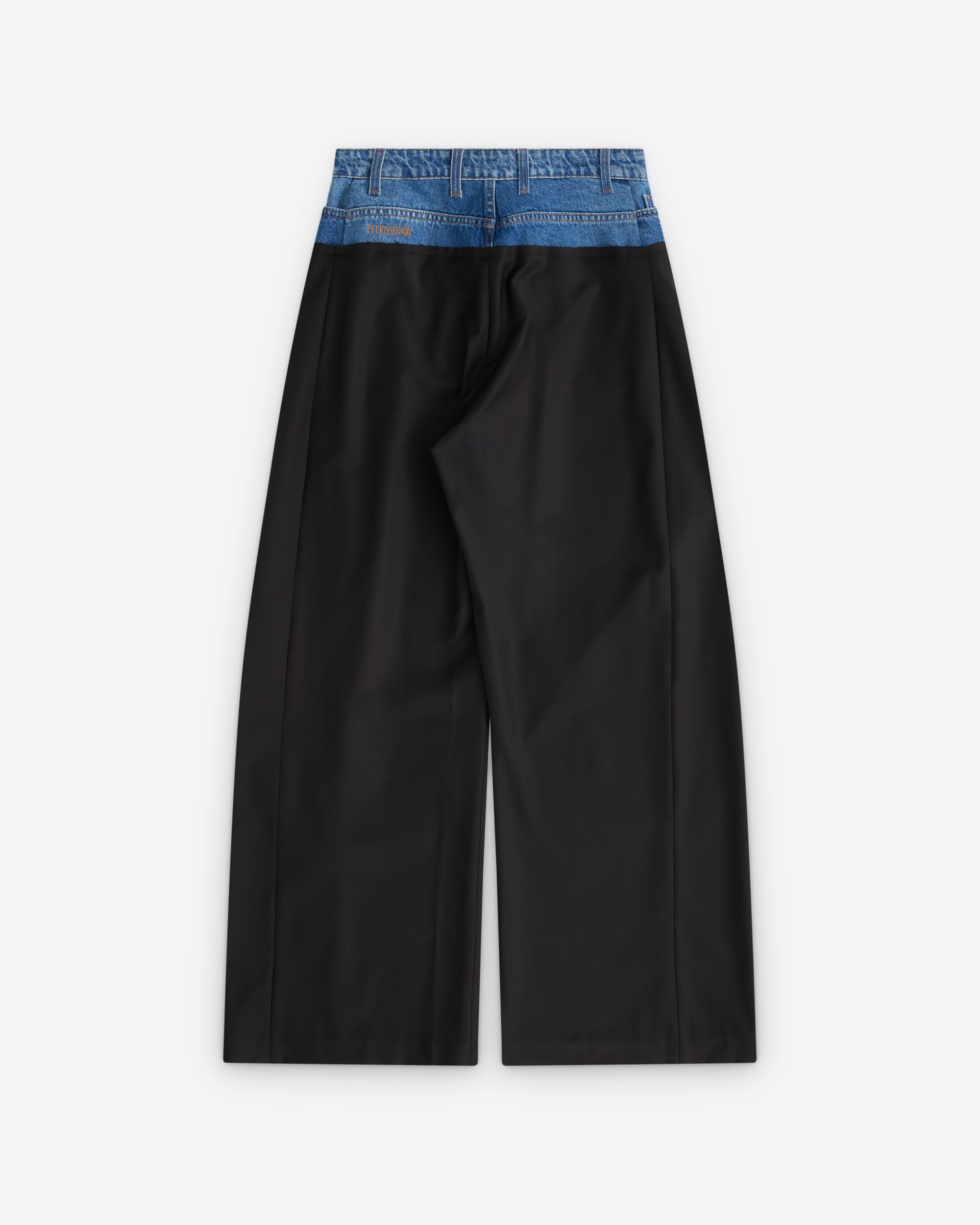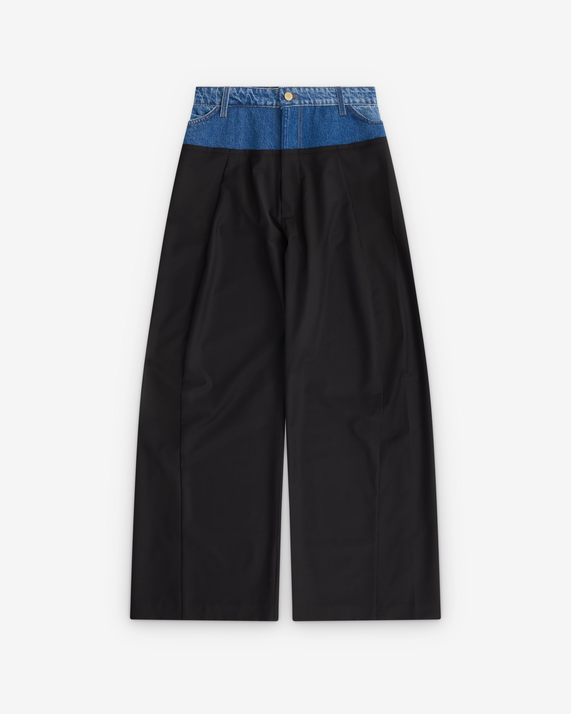 Wide legPleatedDenim panel waistbandFull lengthButton and zip fly fastening