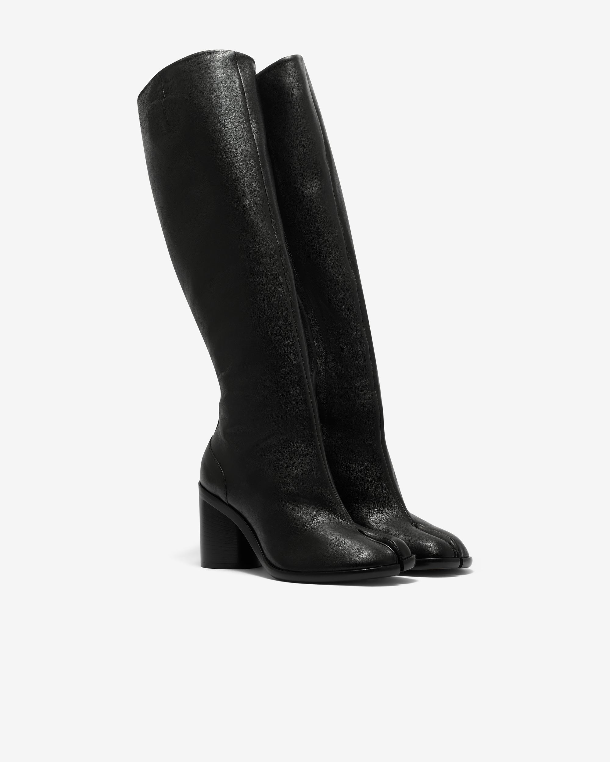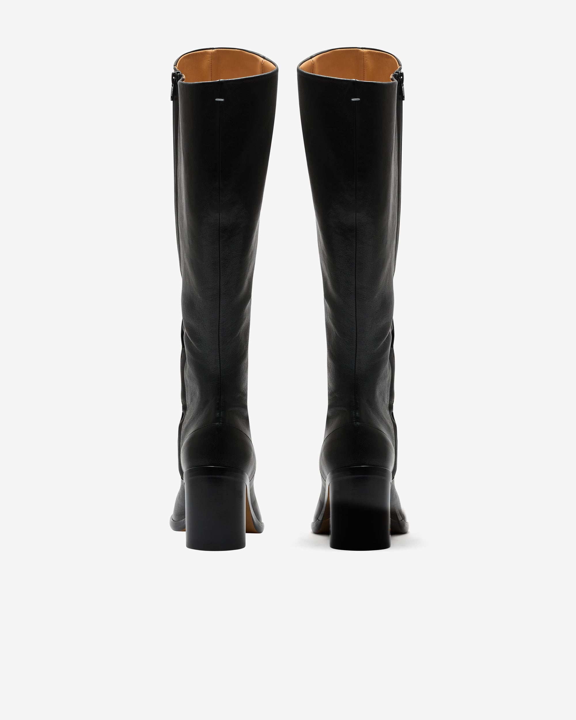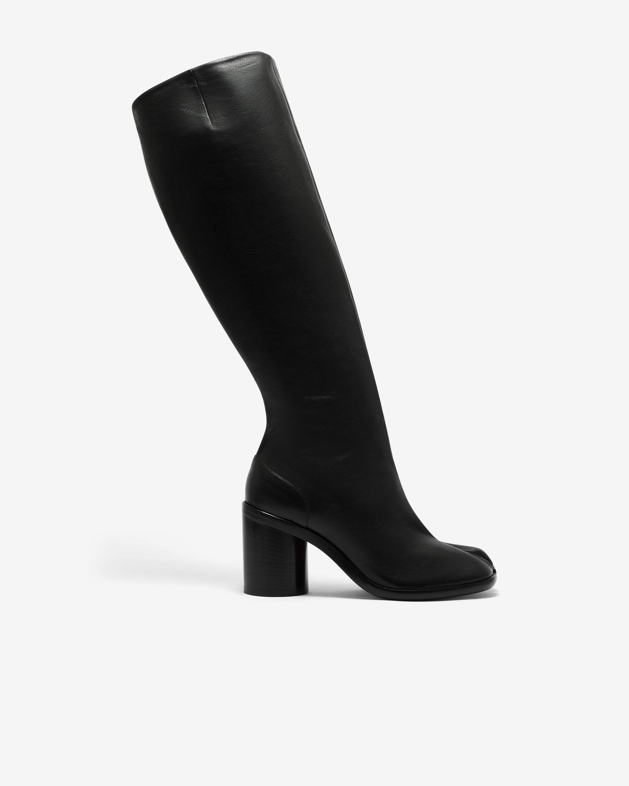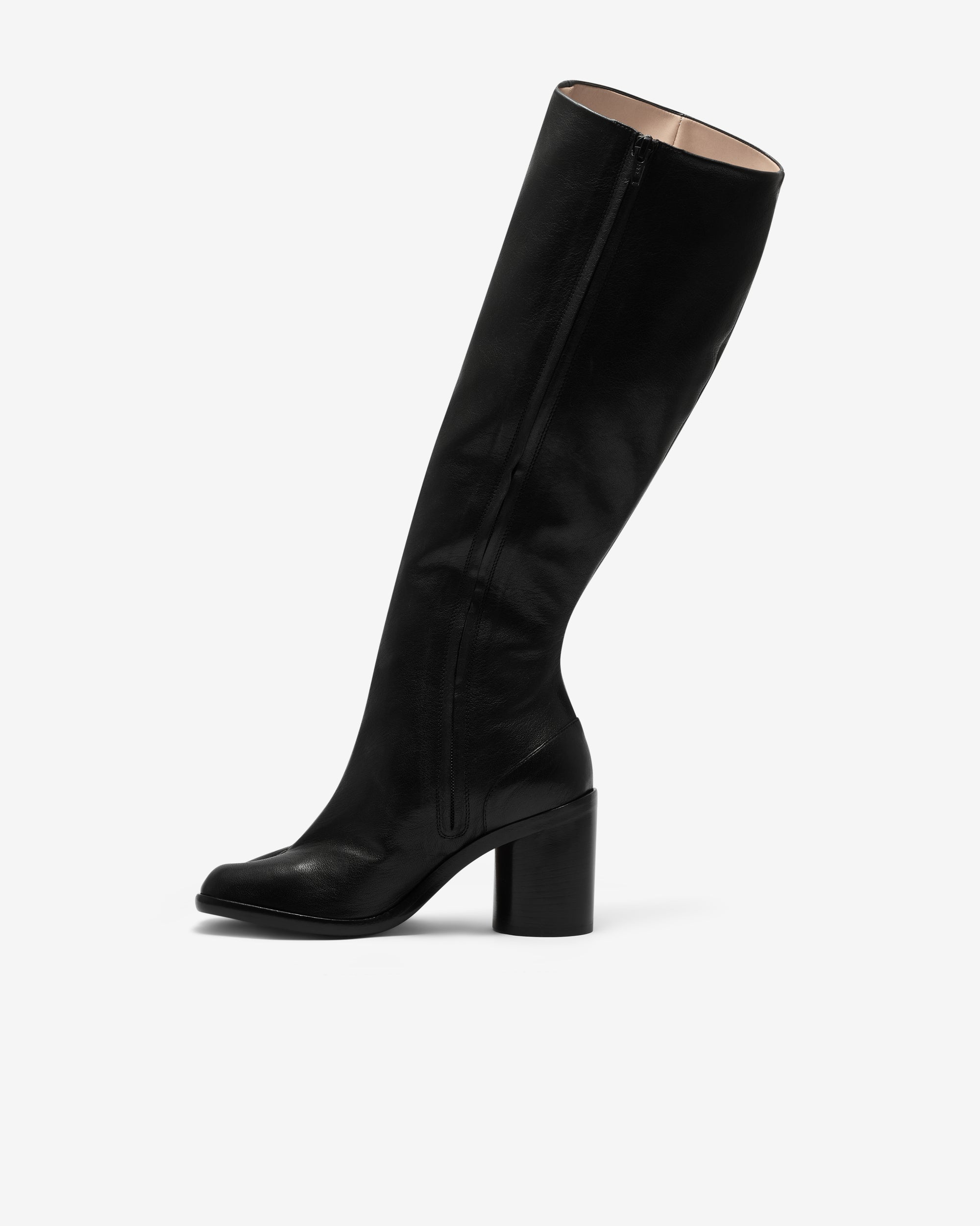Heel height: 8 cm/3 inCylindrical heelKnee height boots in nappa leatherTabi split toeWhite stitching at the backCovered zip closure
