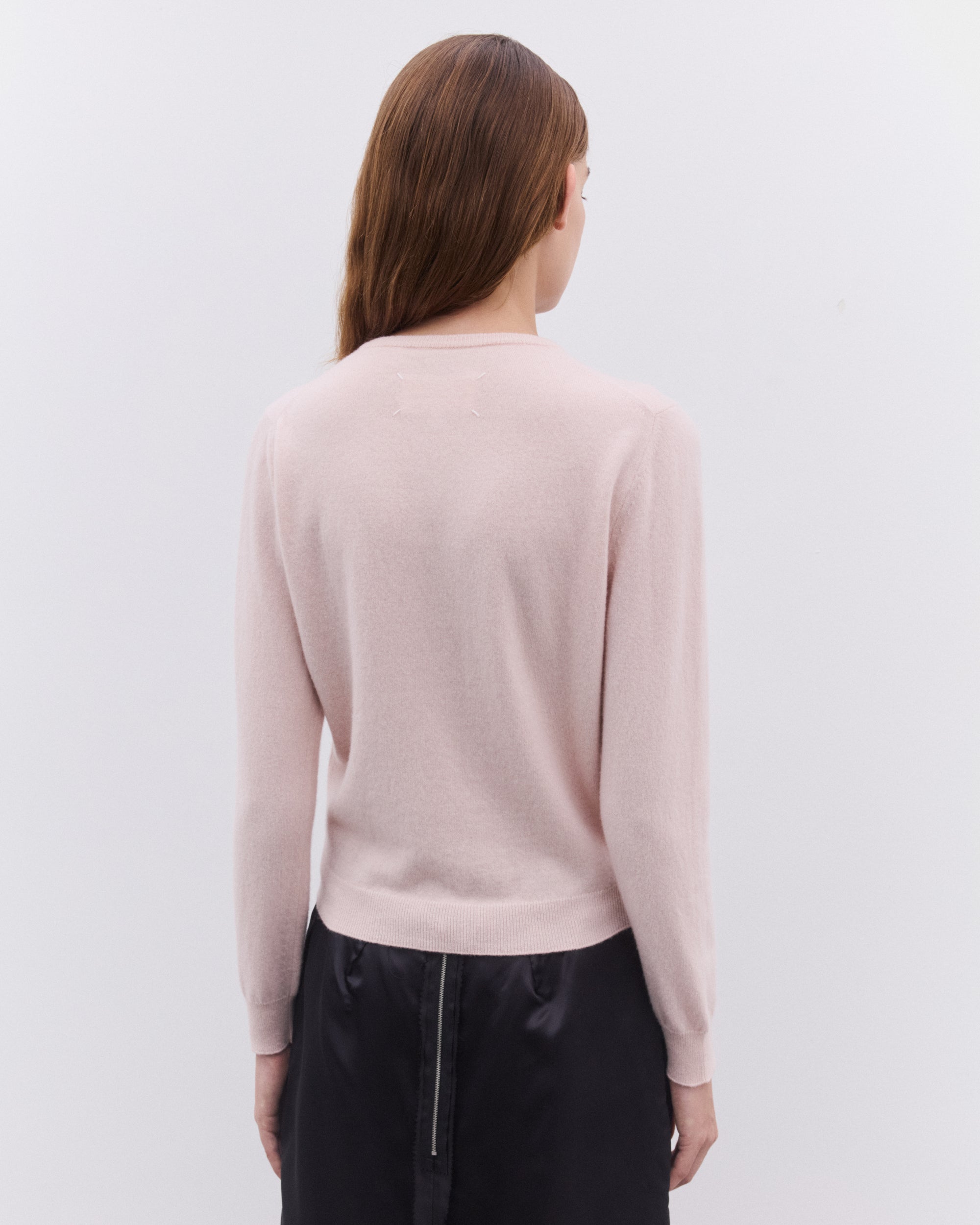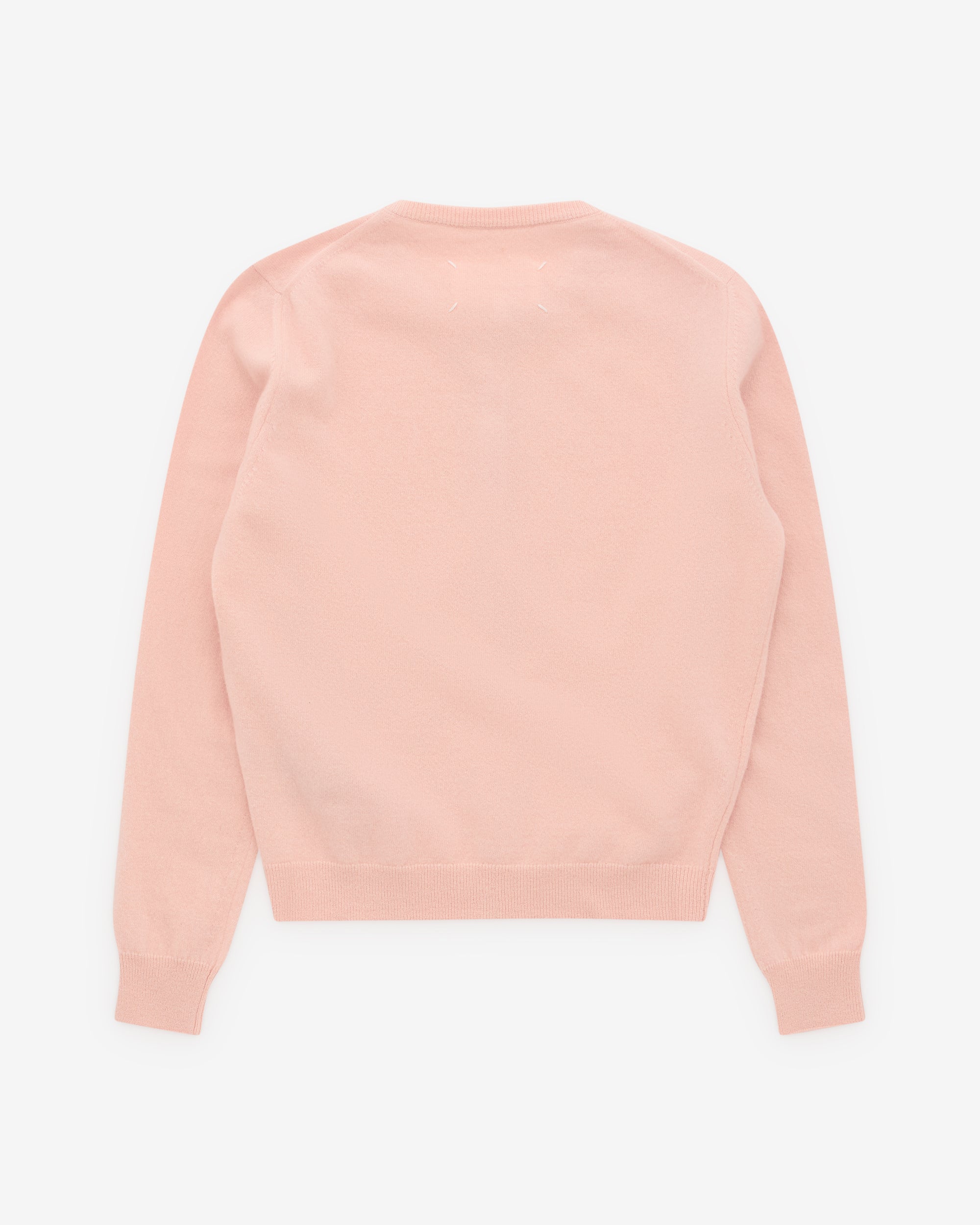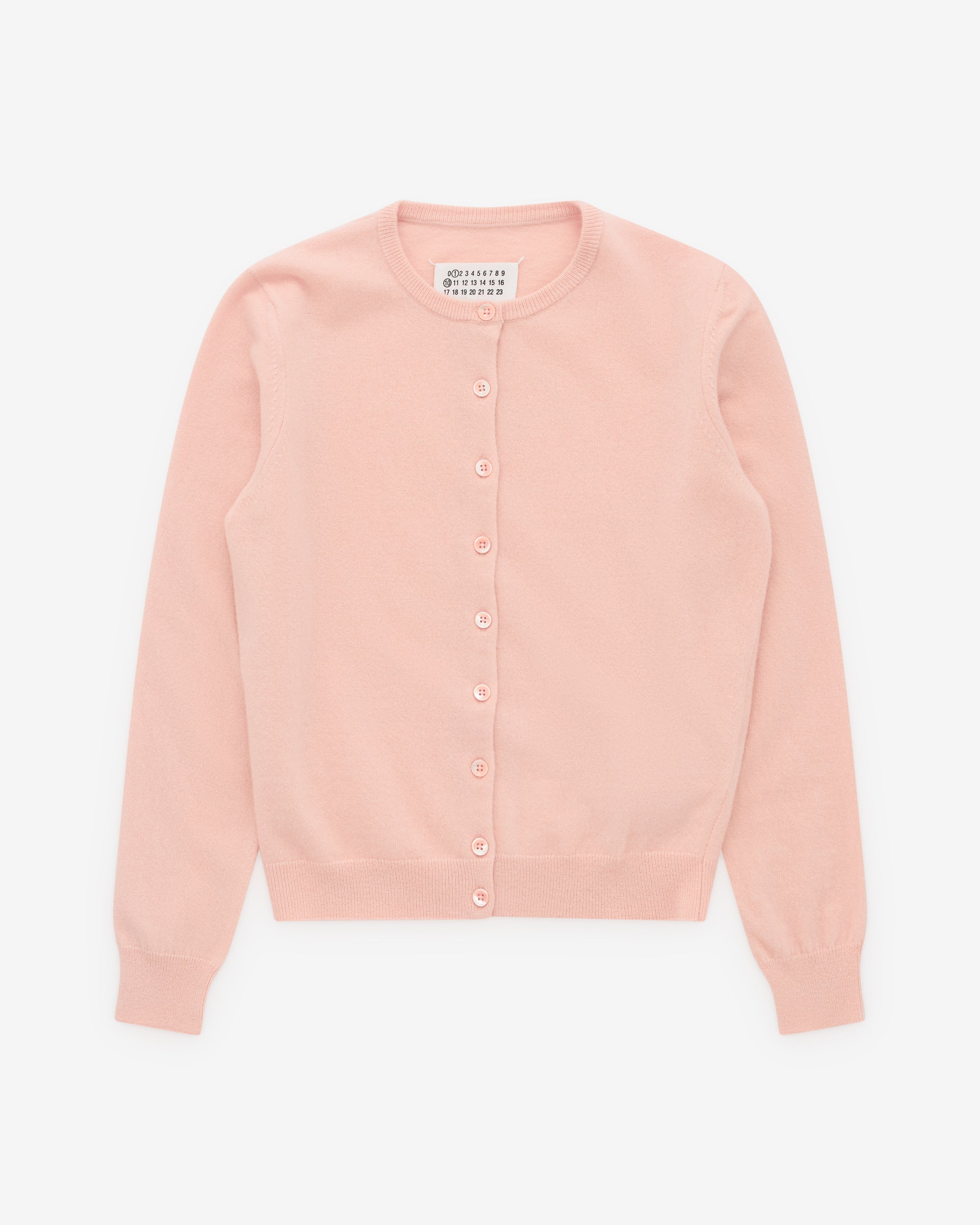 Round neckLong sleevesButton fasteningRib knit trimsFour stitches at the back