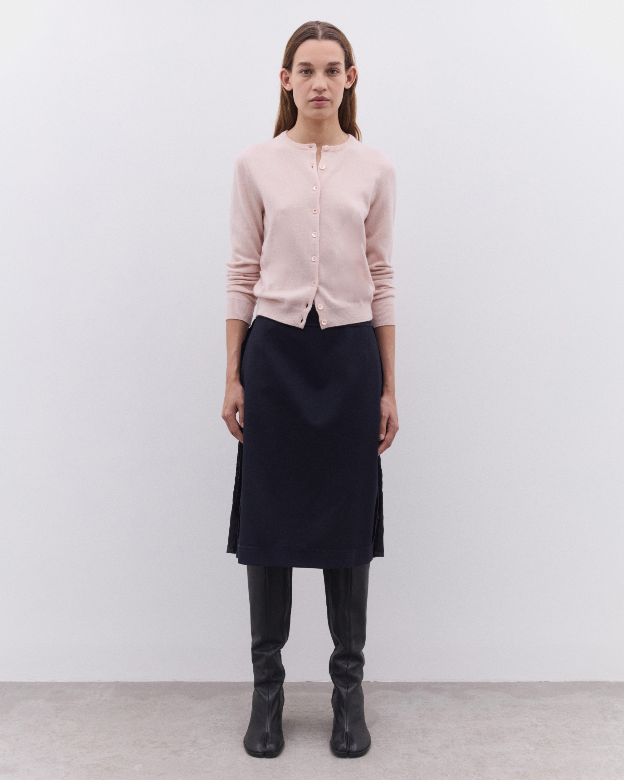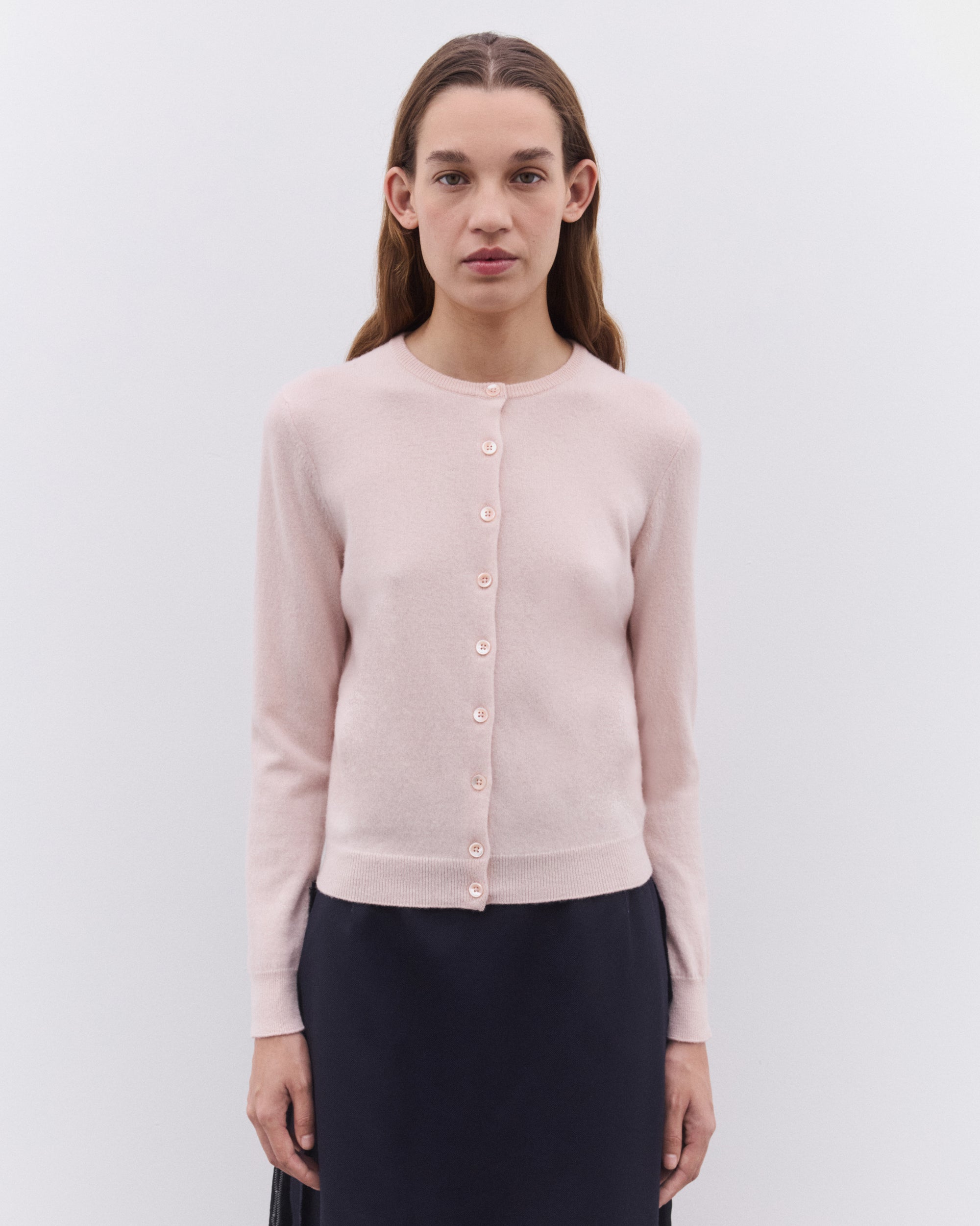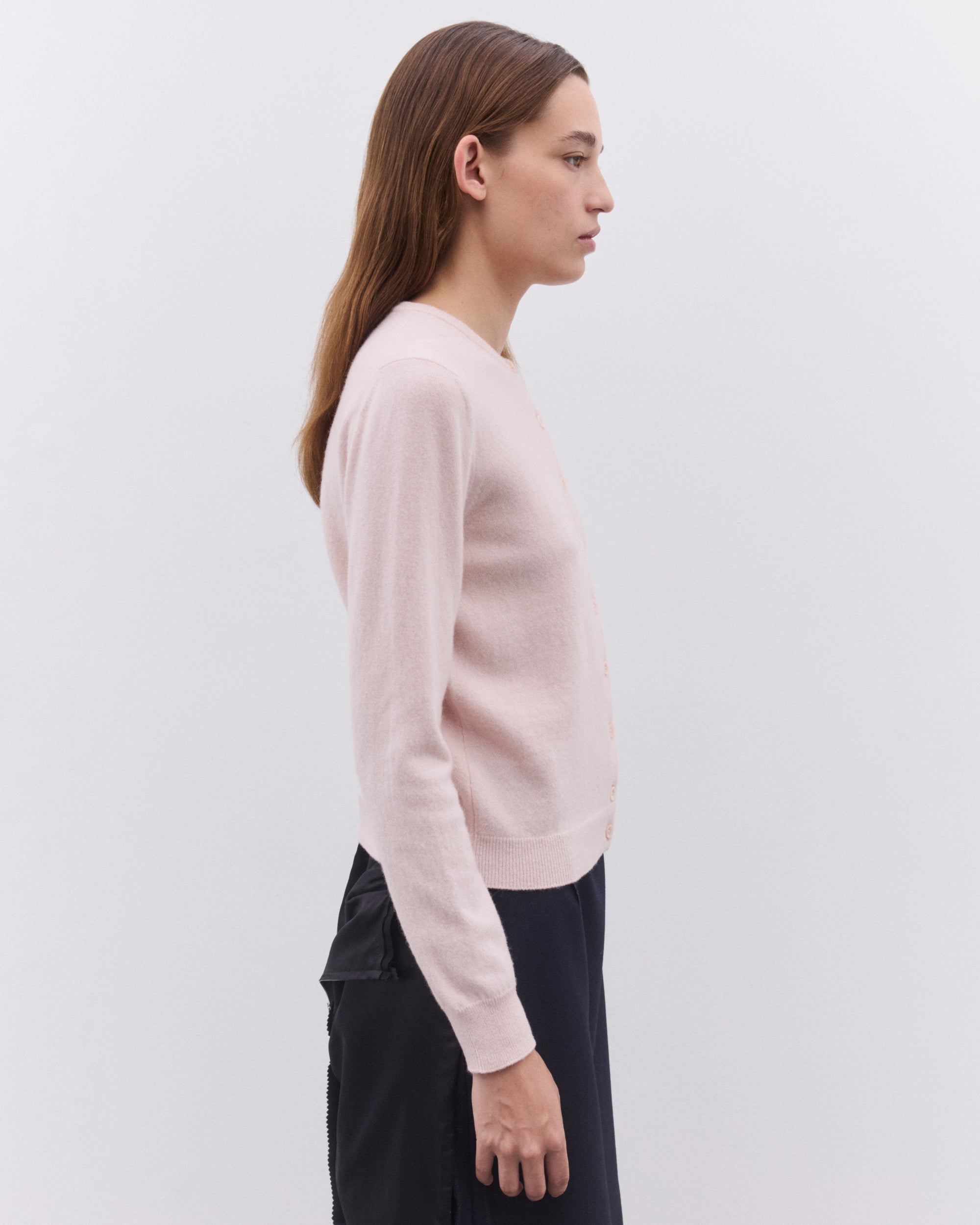 Round neckLong sleevesButton fasteningRib knit trimsFour stitches at the back