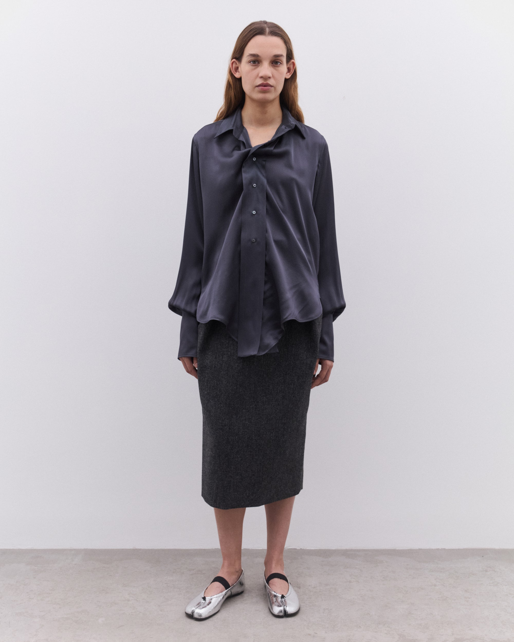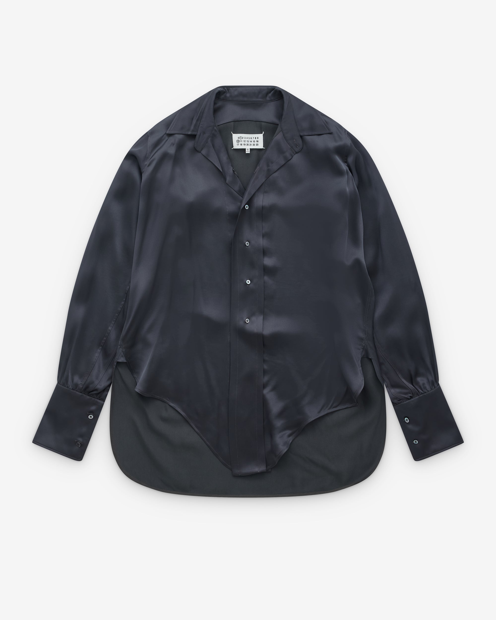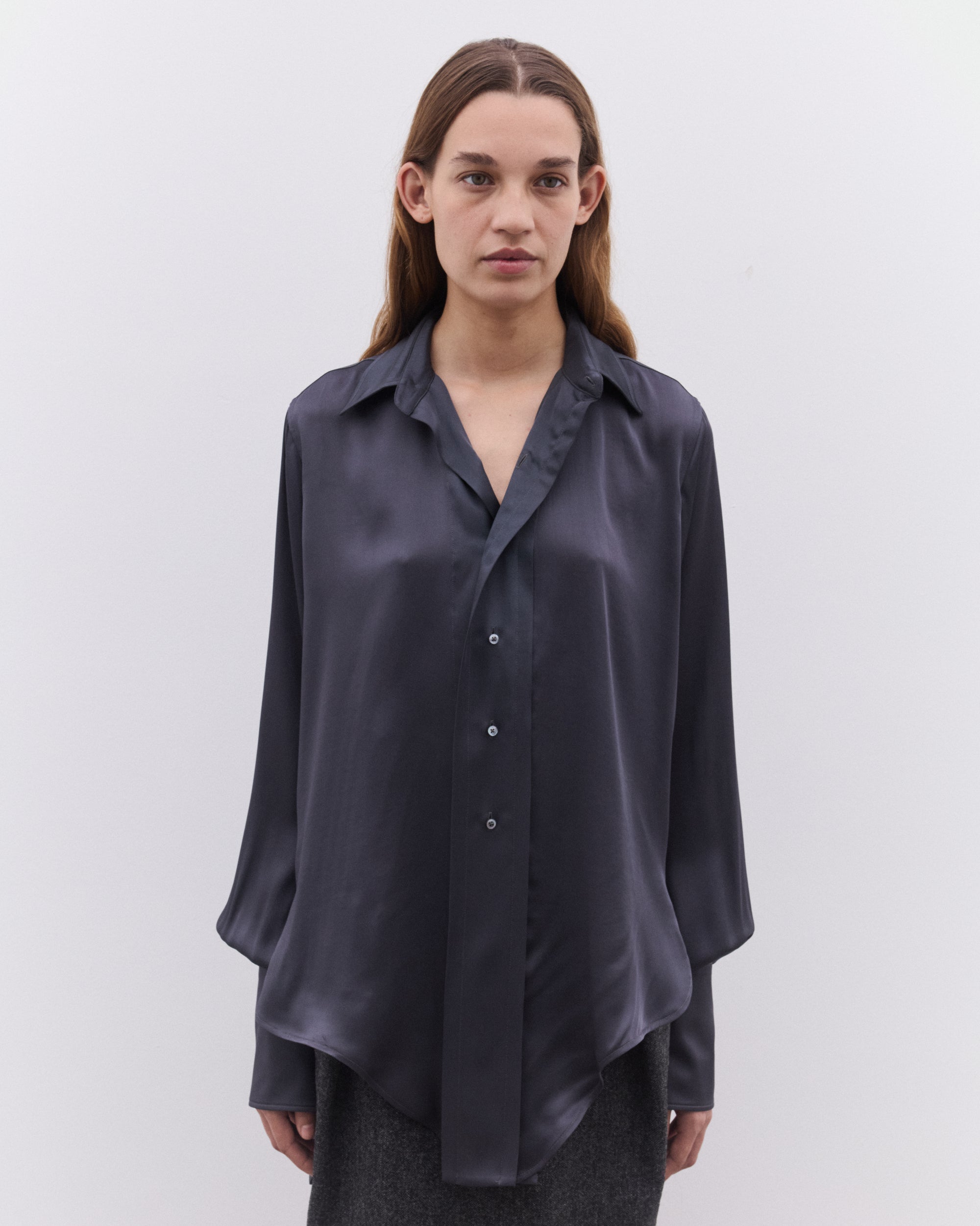 Viscose toile shirtPointed collarMother of pearl button closureButtoned cuffsCurved hemSide slitsDécortiqué detailsFour stitches at the back