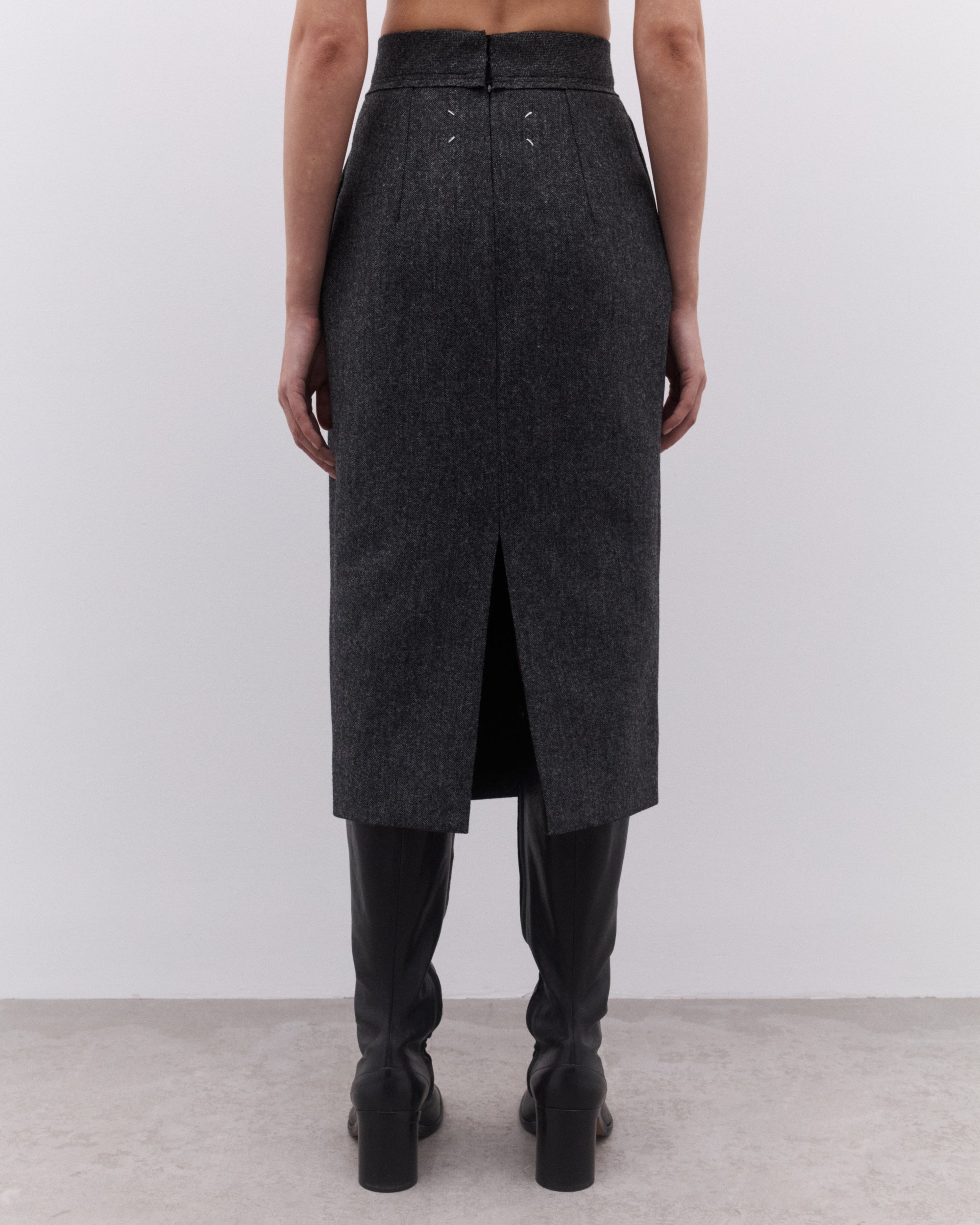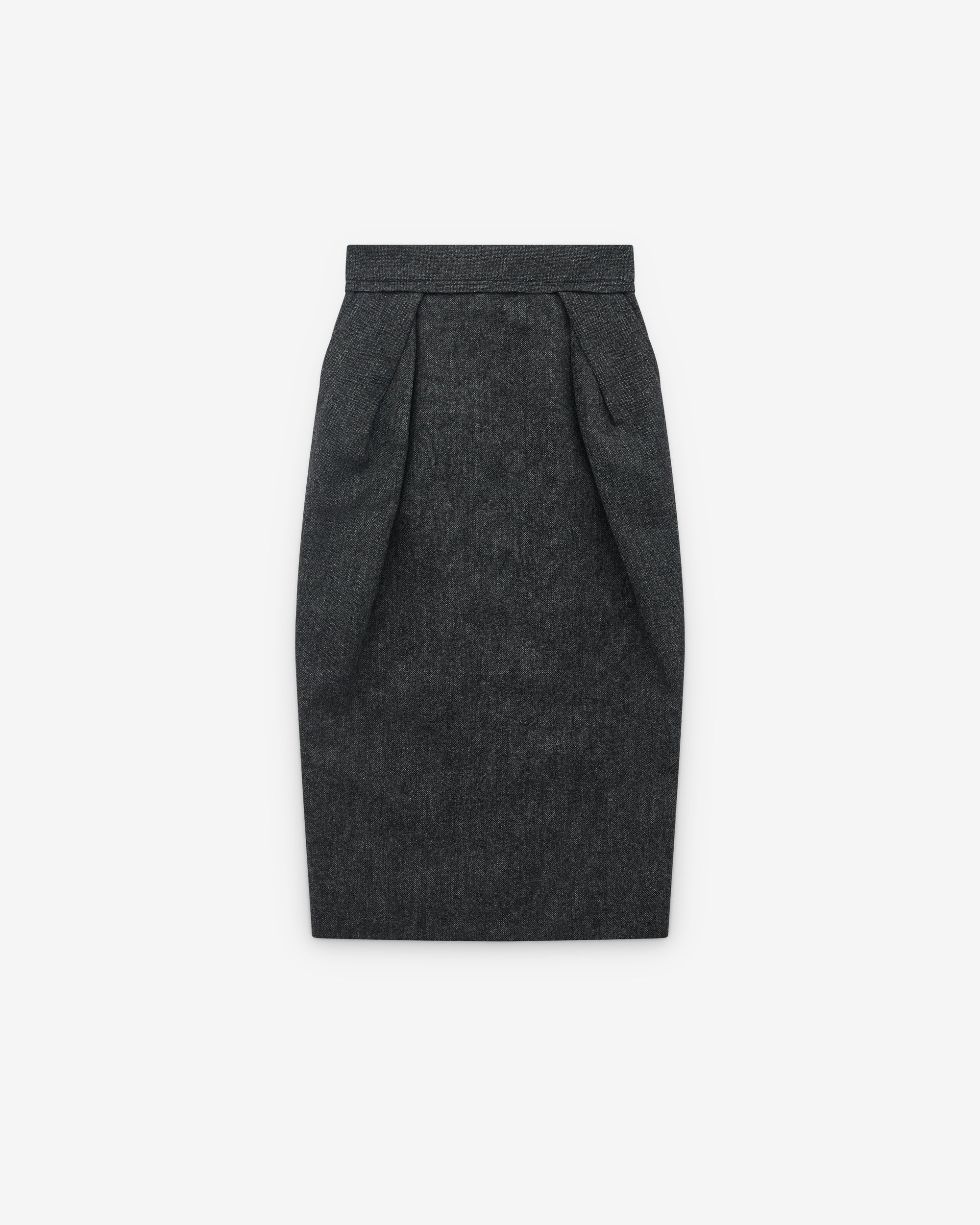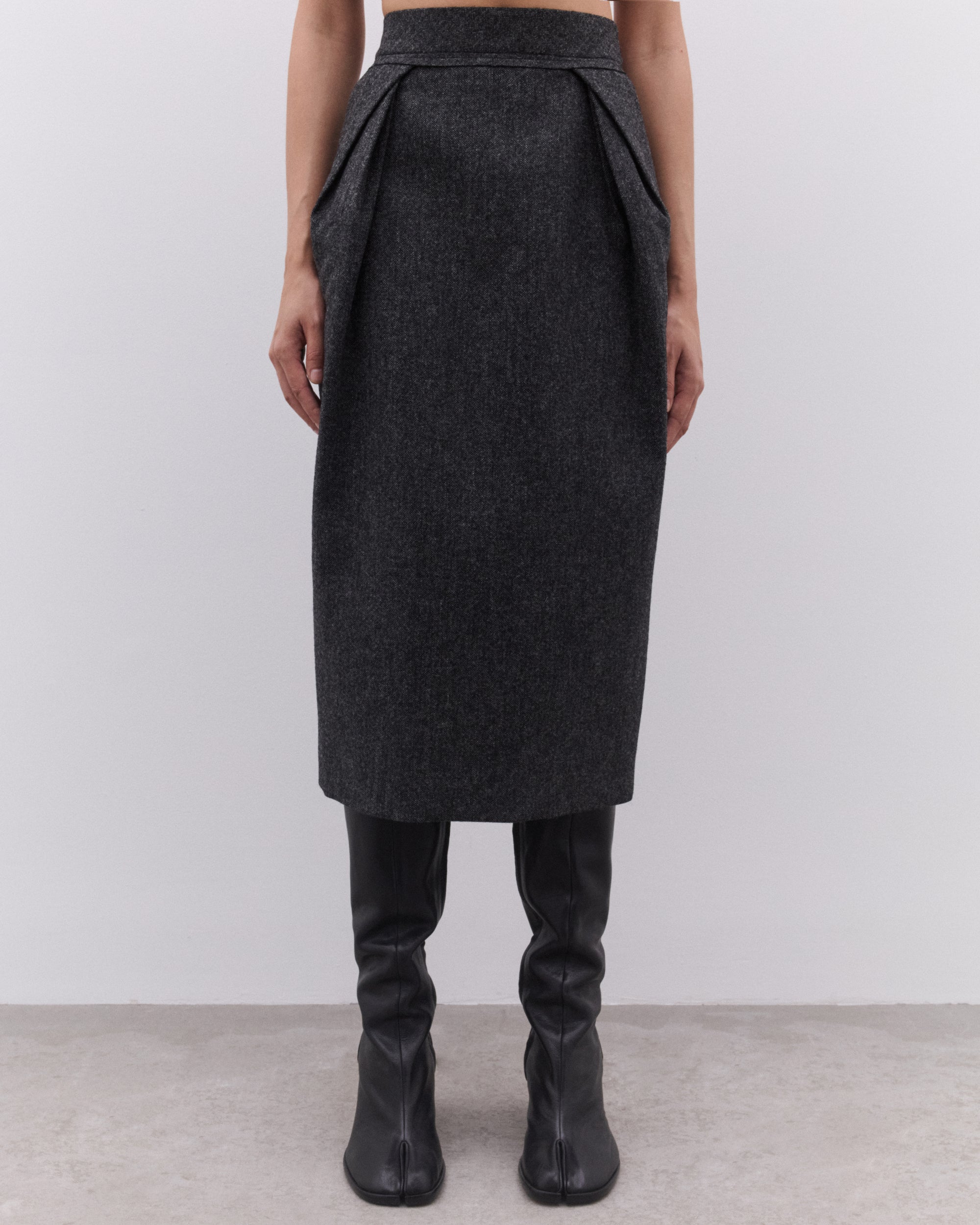 Front pleats with curved top seamsHook and eye fasteningFour stitches at the backRear central vent