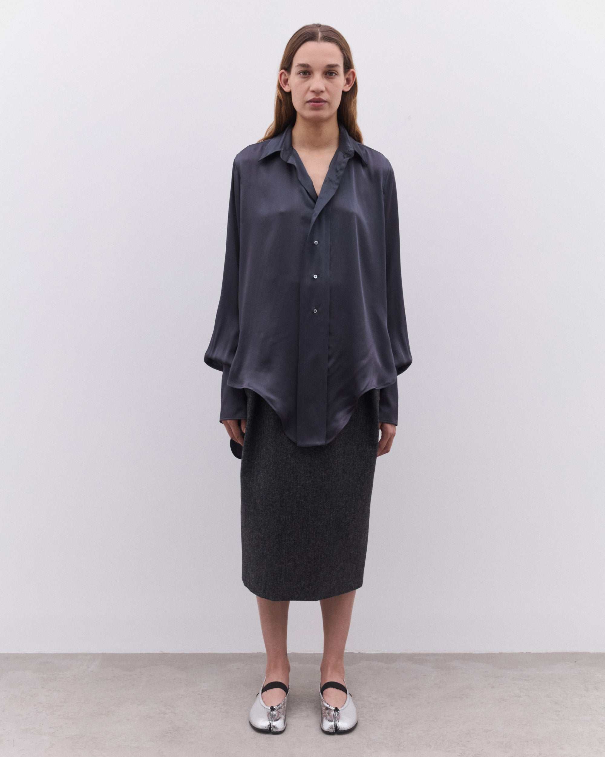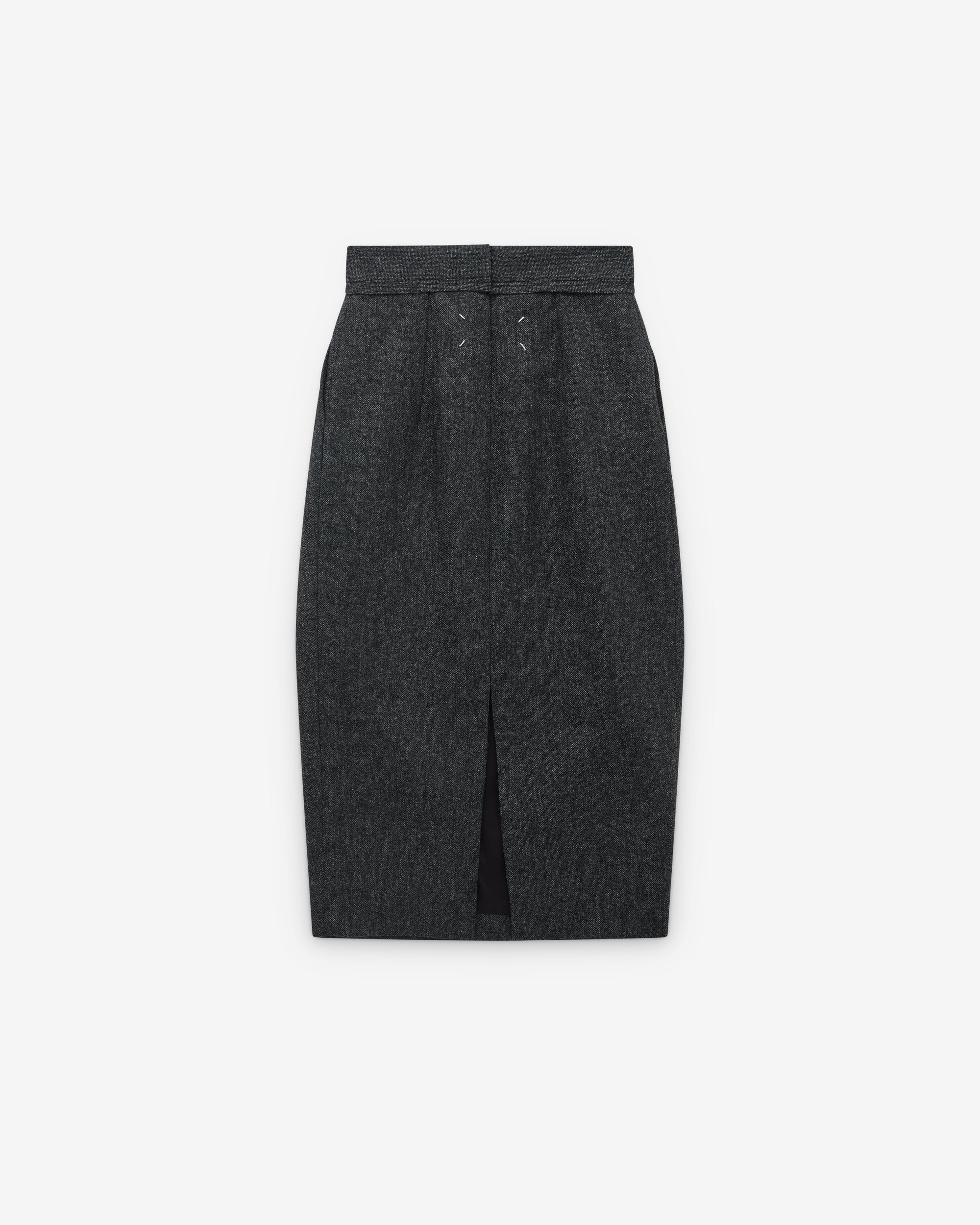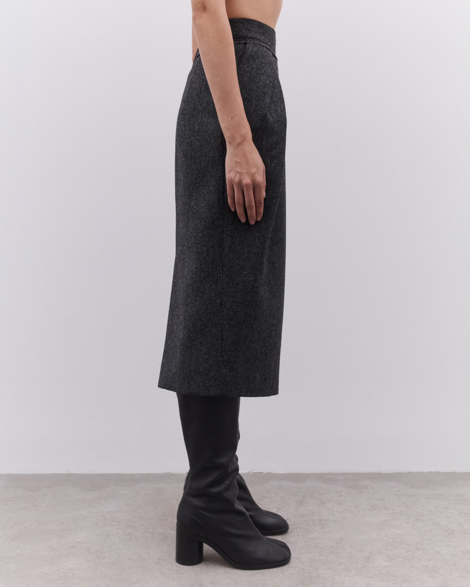 Front pleats with curved top seamsHook and eye fasteningFour stitches at the backRear central vent