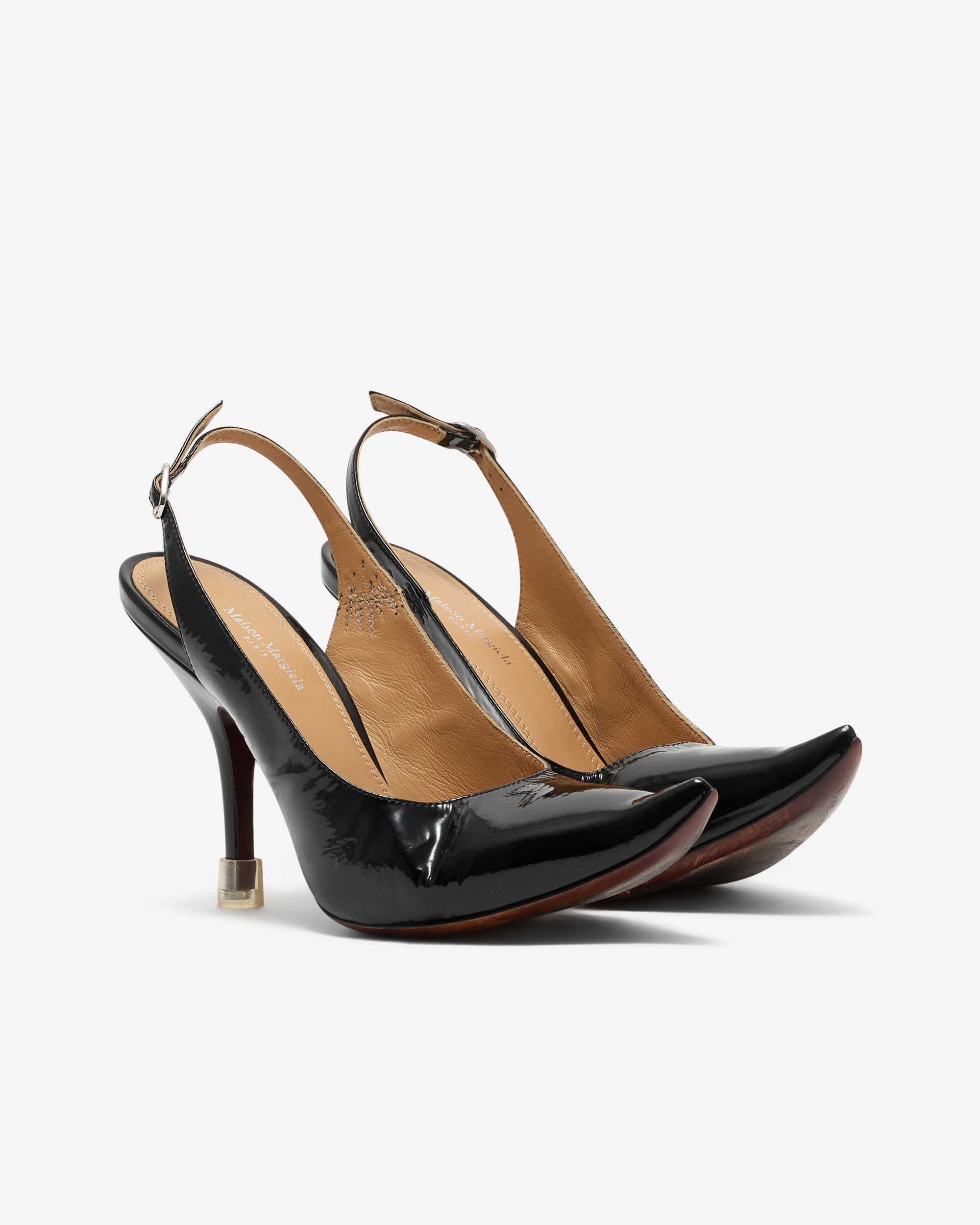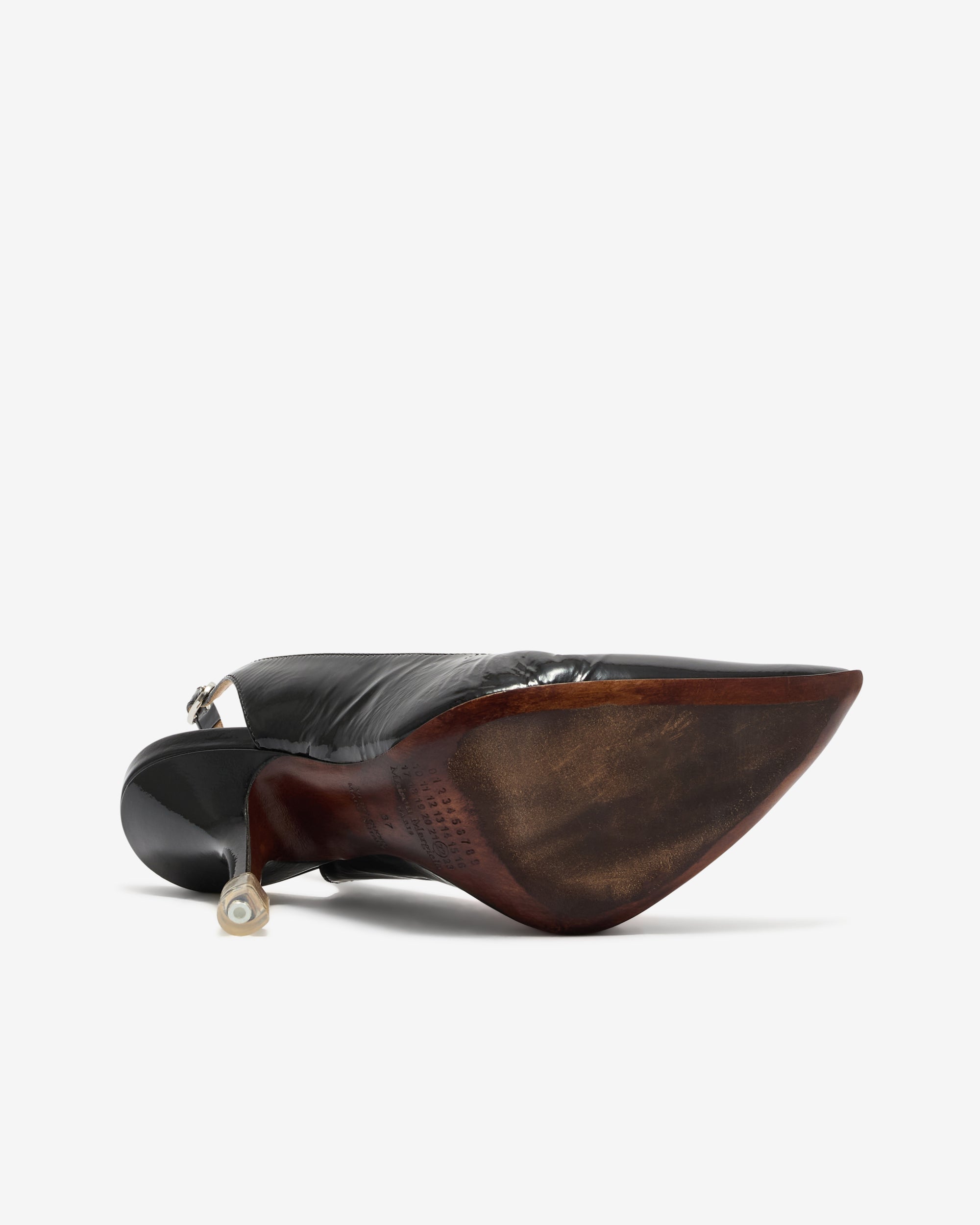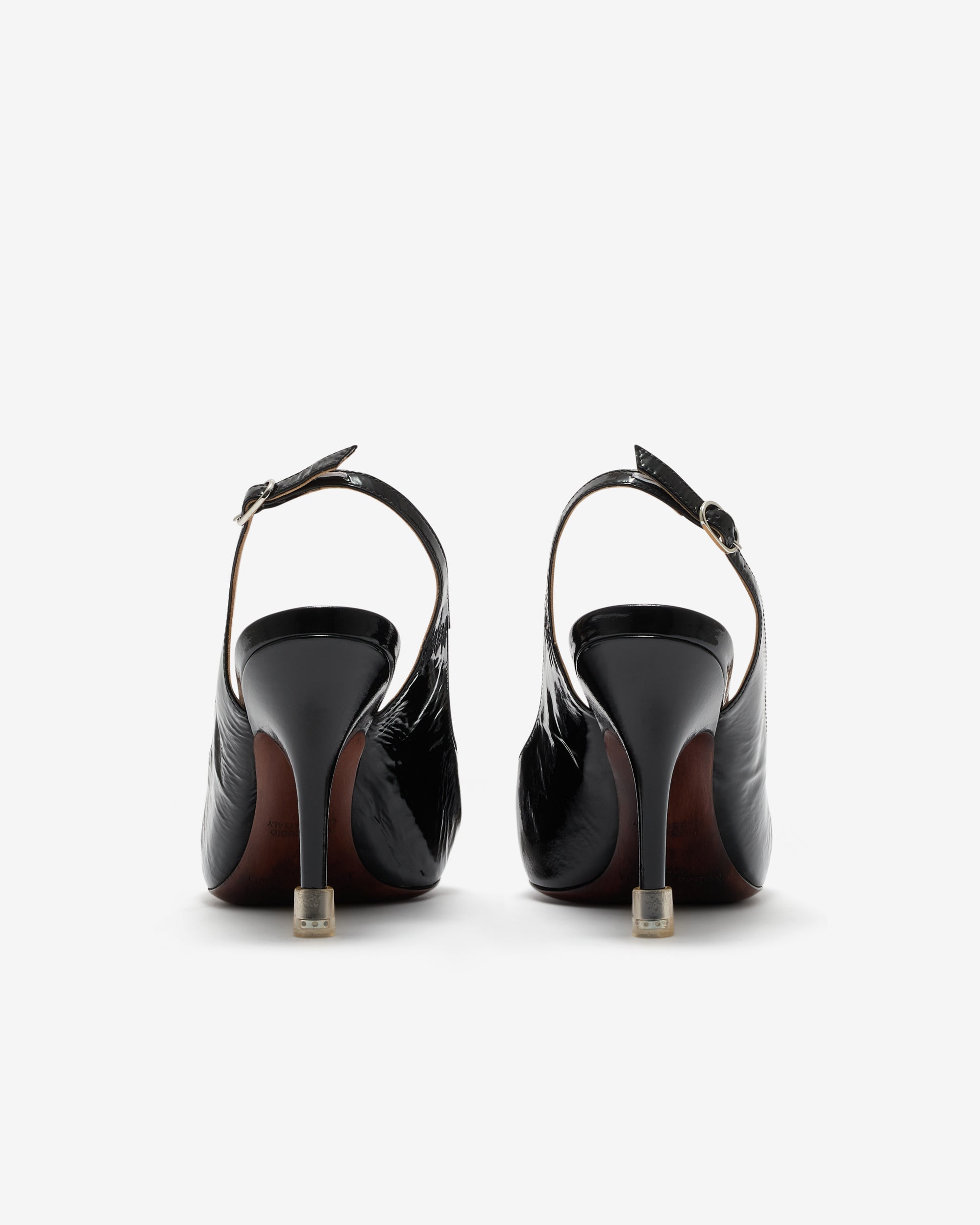 Pre aged designPointed toeKitten heelBack ankle strap closureLeather outsole
