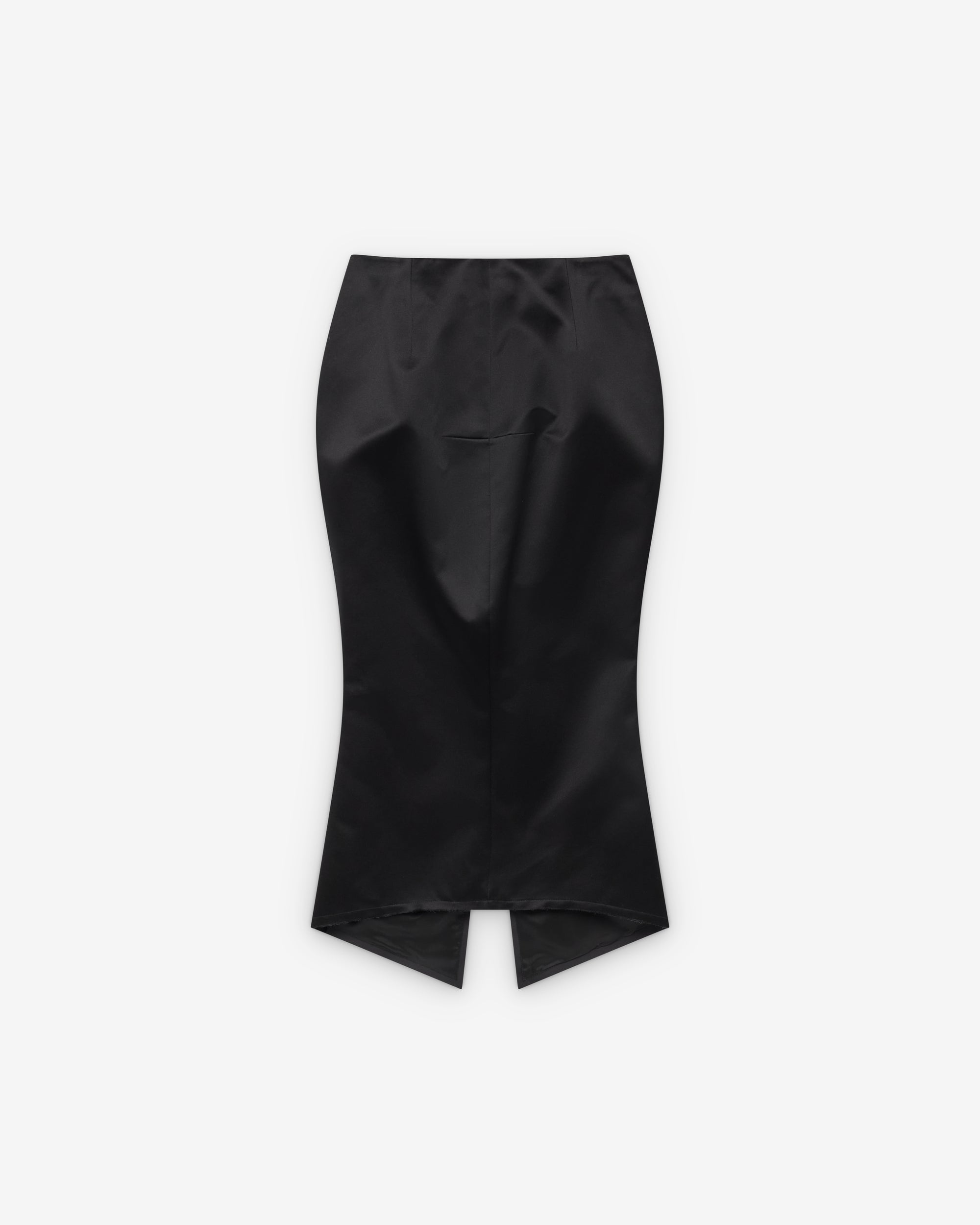 High waisted, fitted through hipsAsymmetric cut out hemMidi lengthBack zip closureRear darted fabric