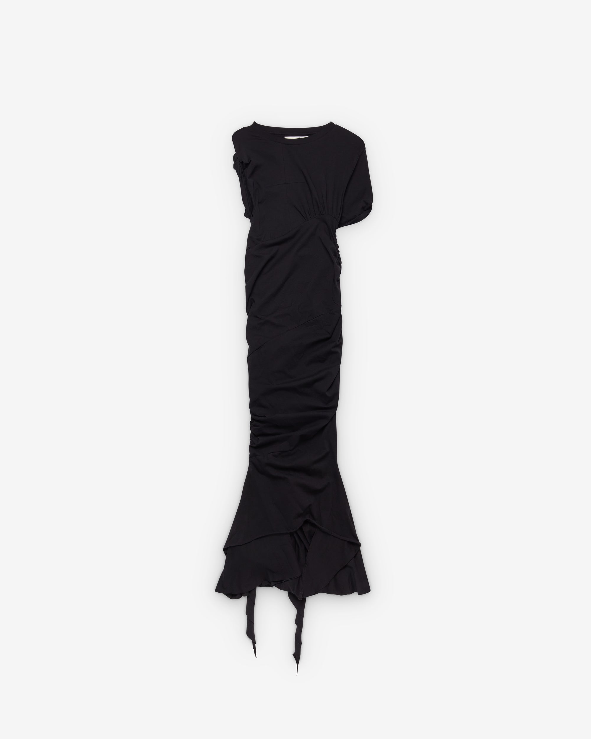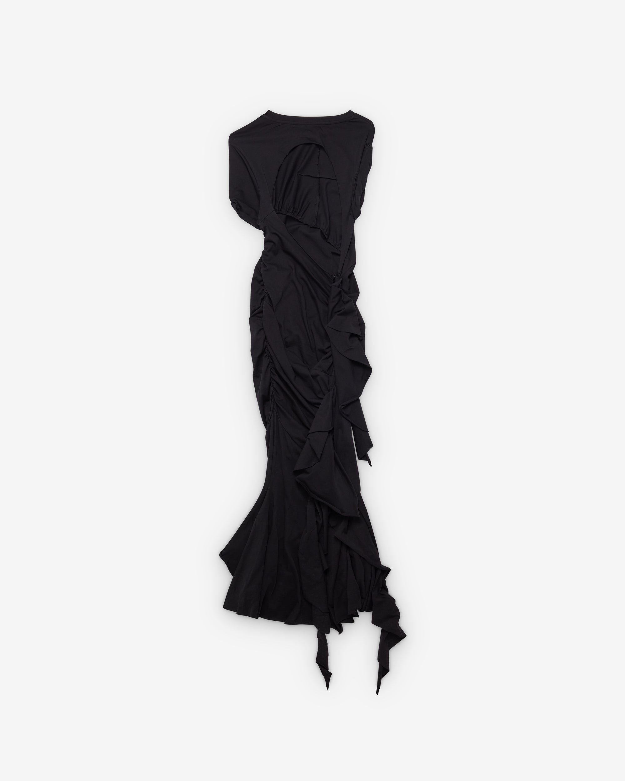 Floor lengthAsymmetric hemCutout at backRuffles throughout