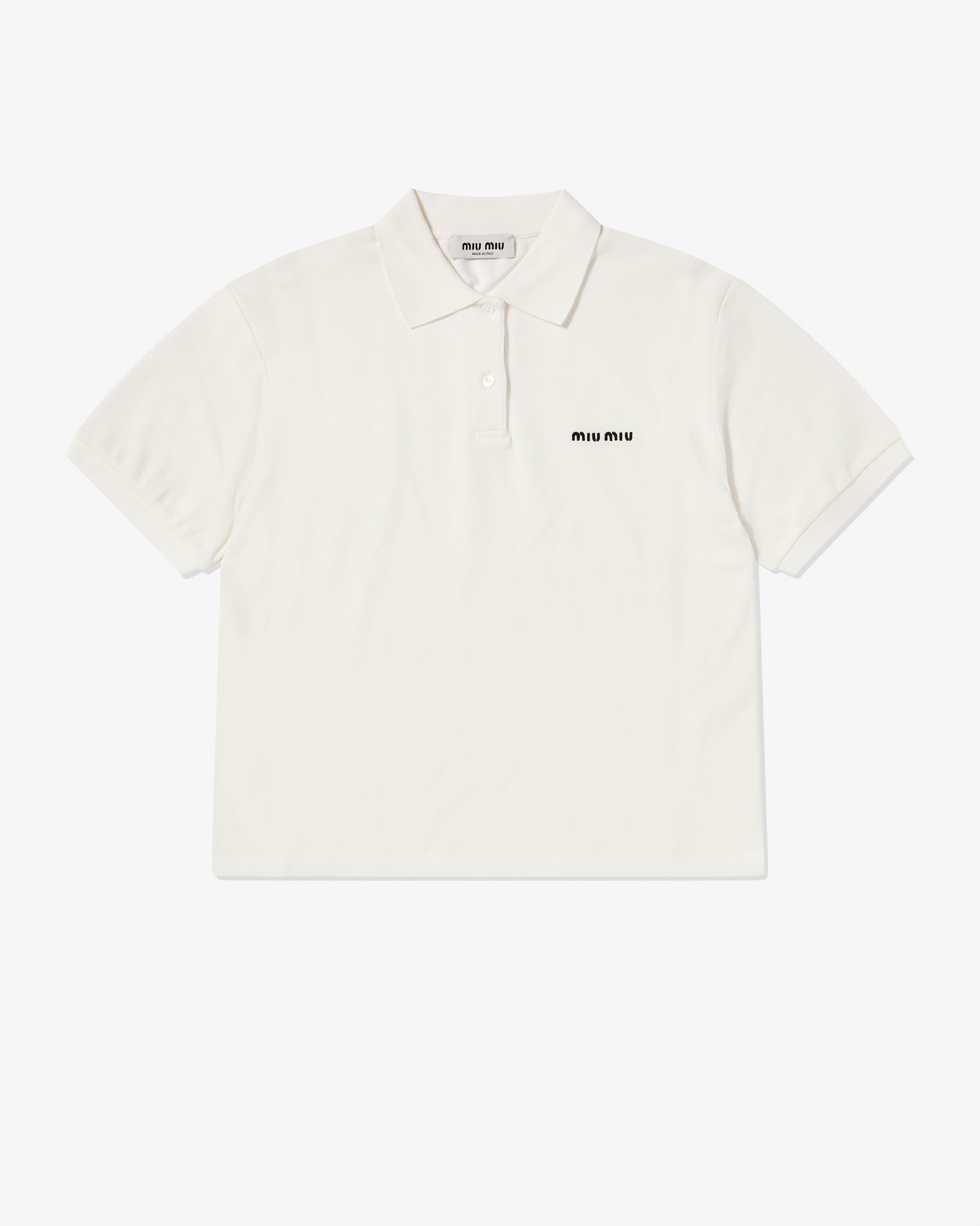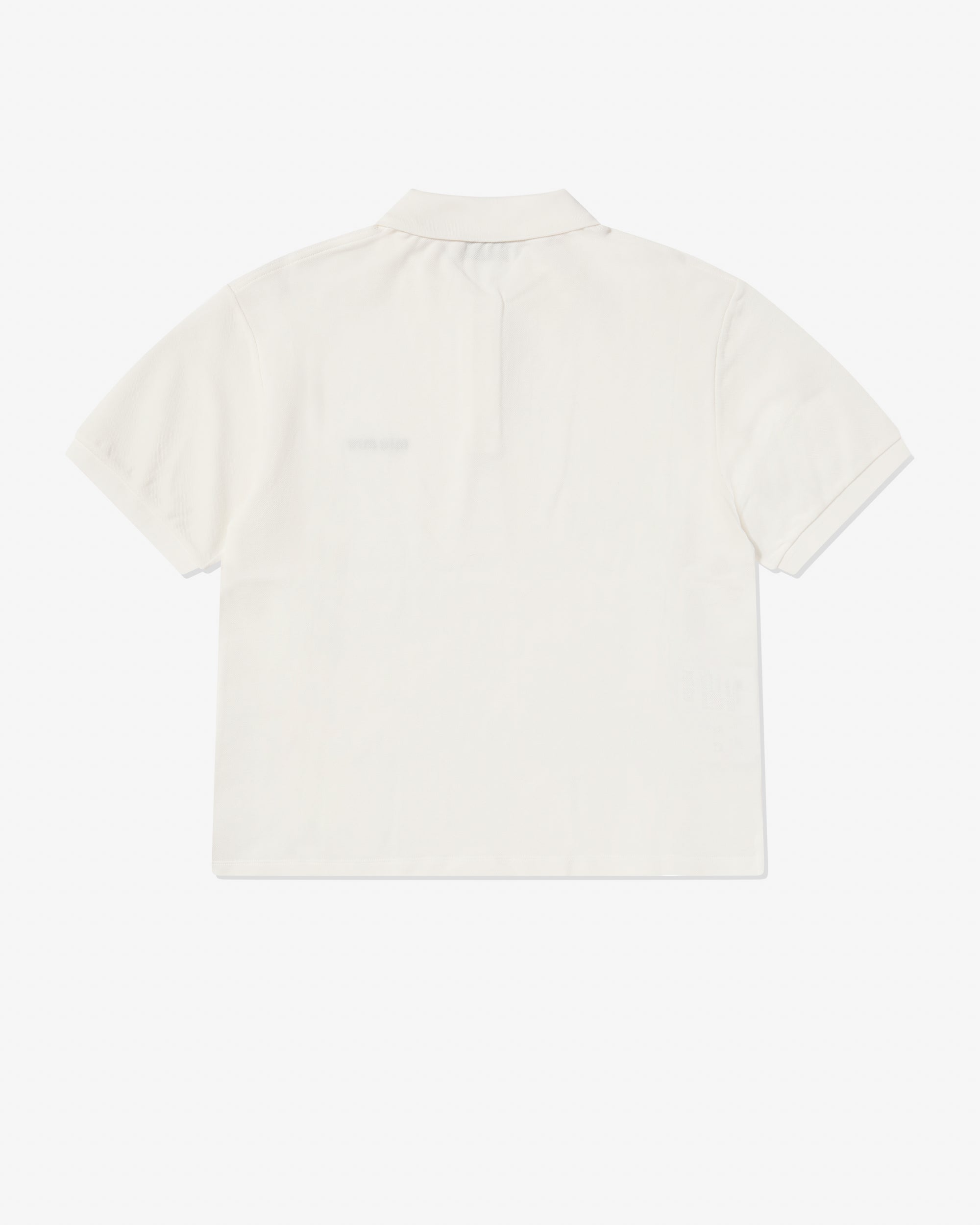 Boxy fit Polo-style collar Front button closure Short sleeves Embroidered logo Long slits on the sides Twin needle hem
