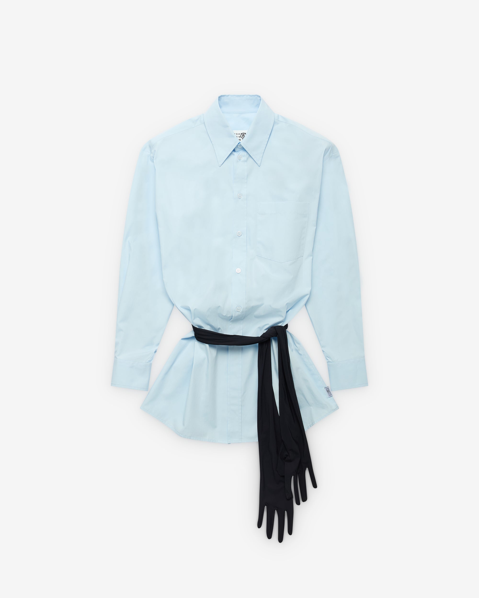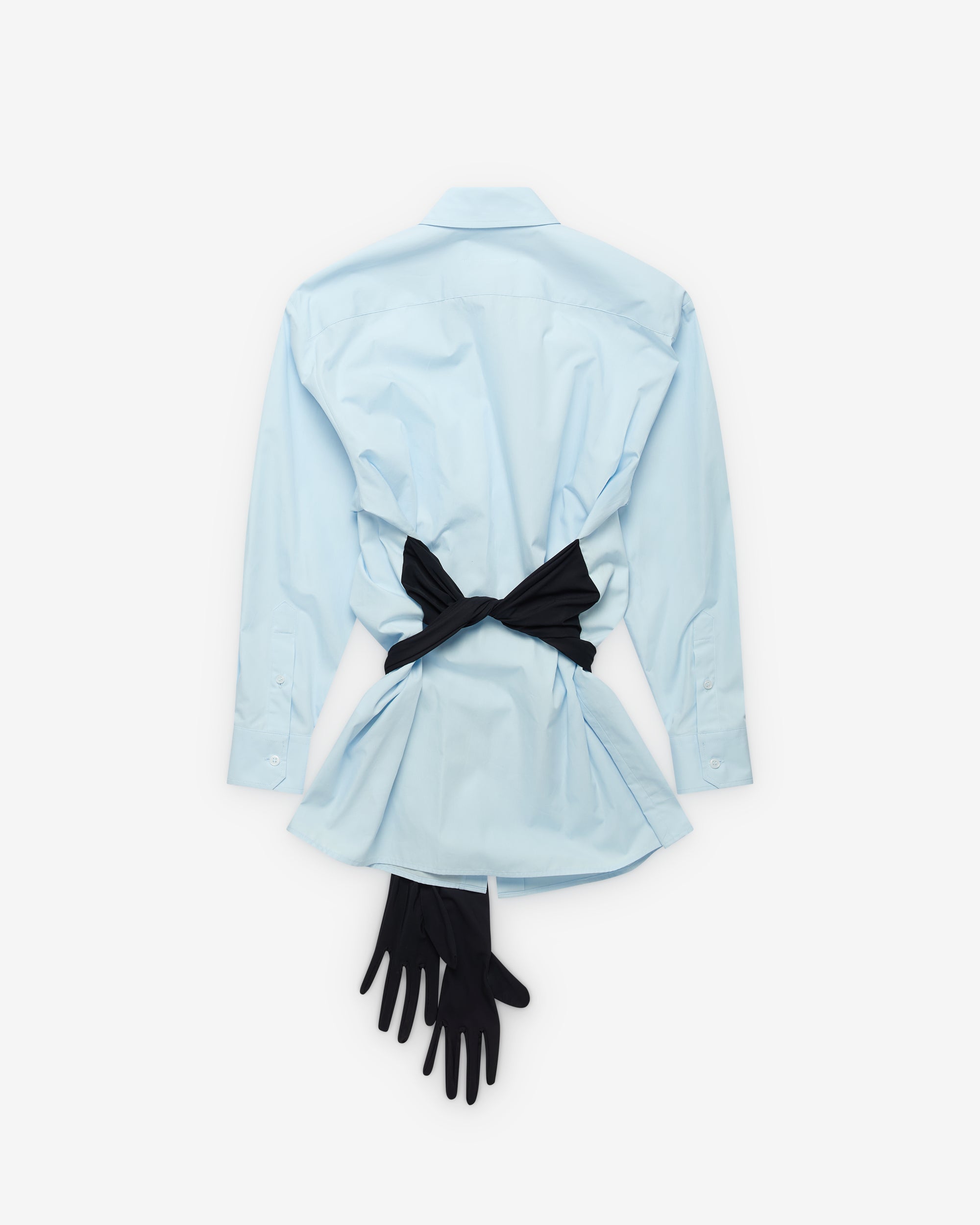 Glove tie at waistPoint collarButton fasteningLonglineCurved yoke at rearButton cuffs