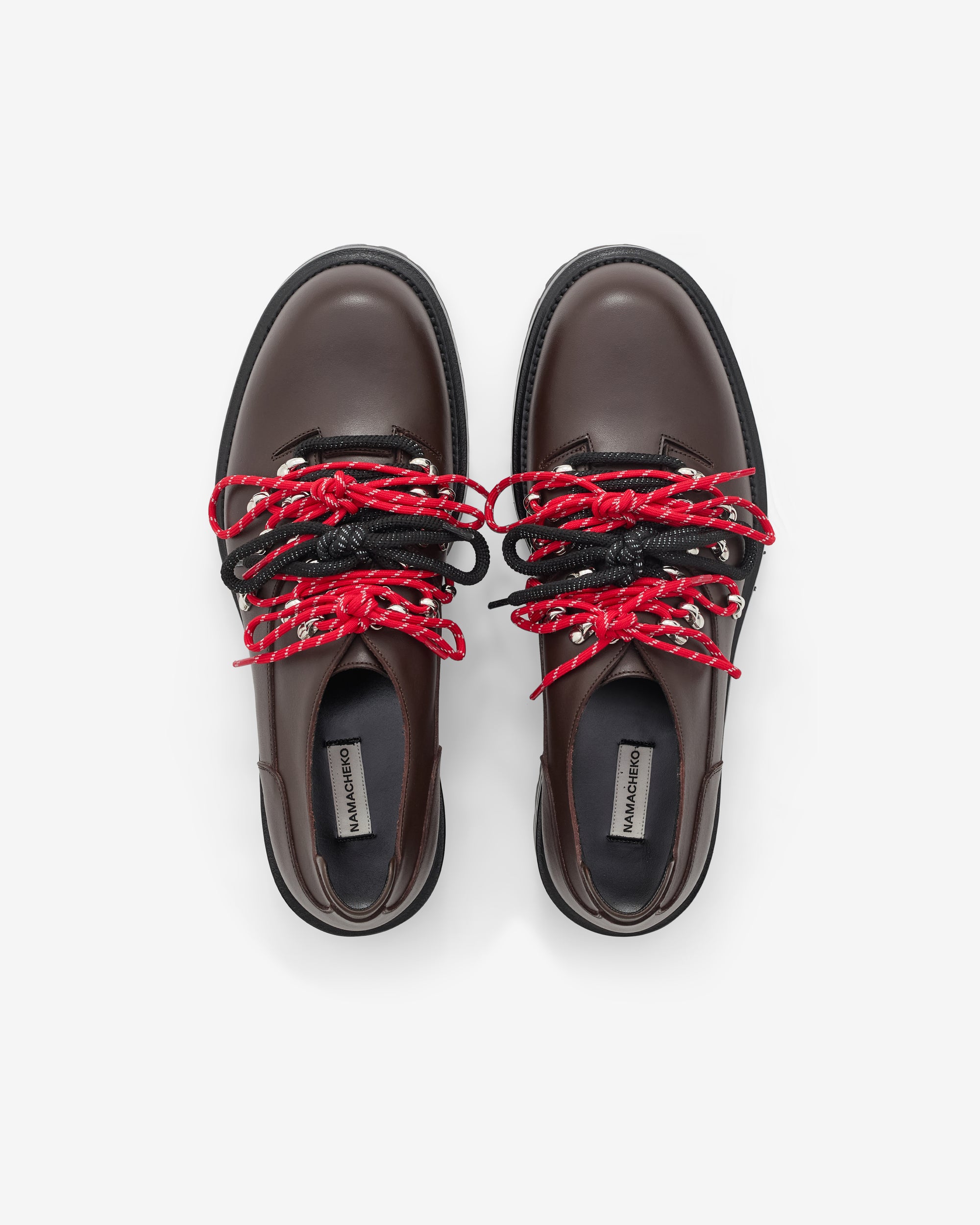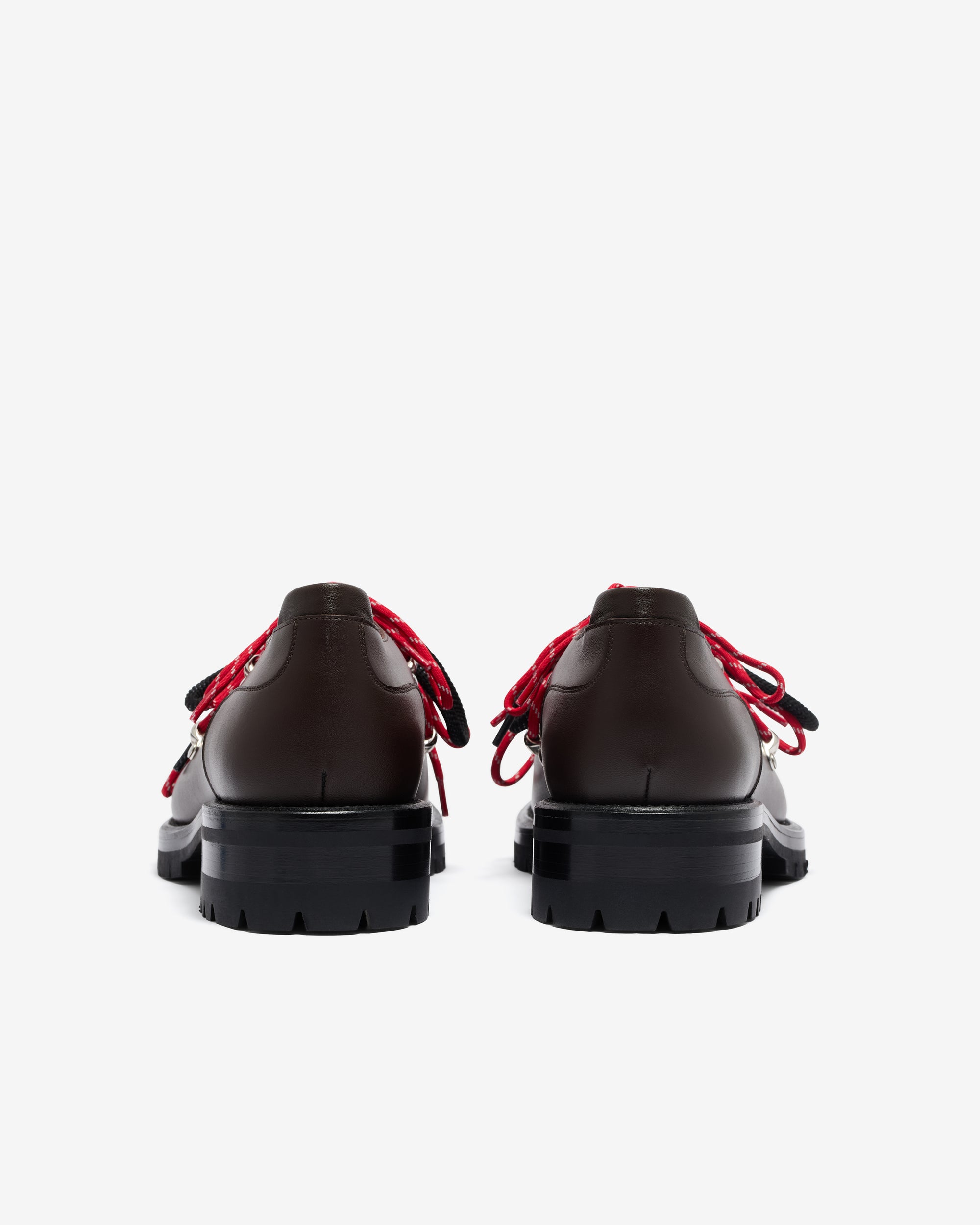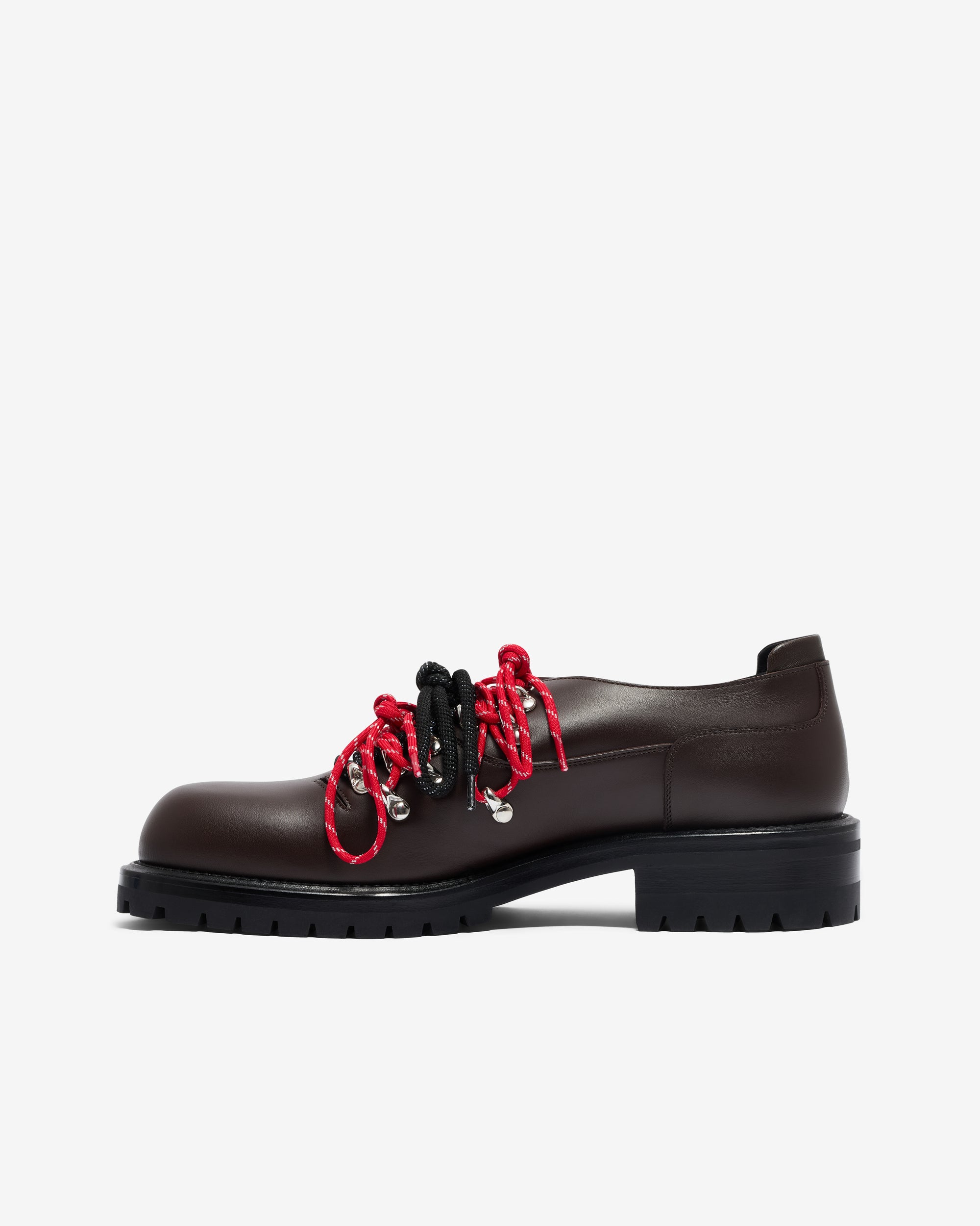 Rounded toe boxLugged rubber, heeled outsoleContrast double lacesMetal hiking boot lace tabsThree sets of lacesCalfskin upper