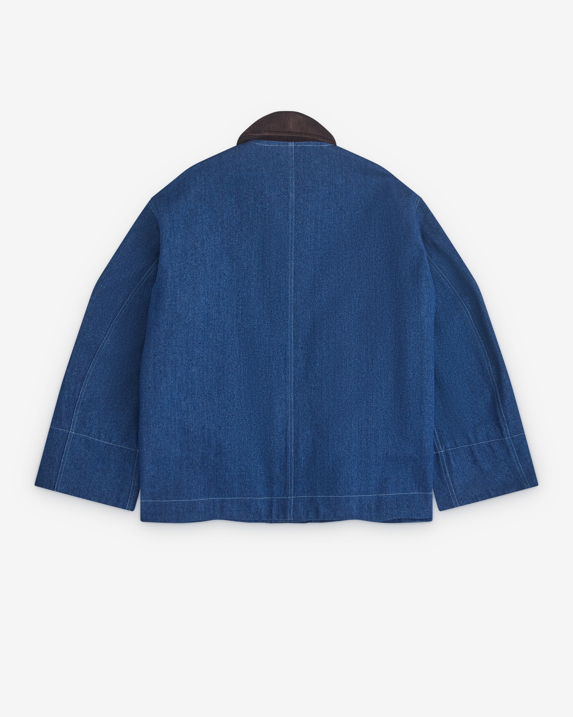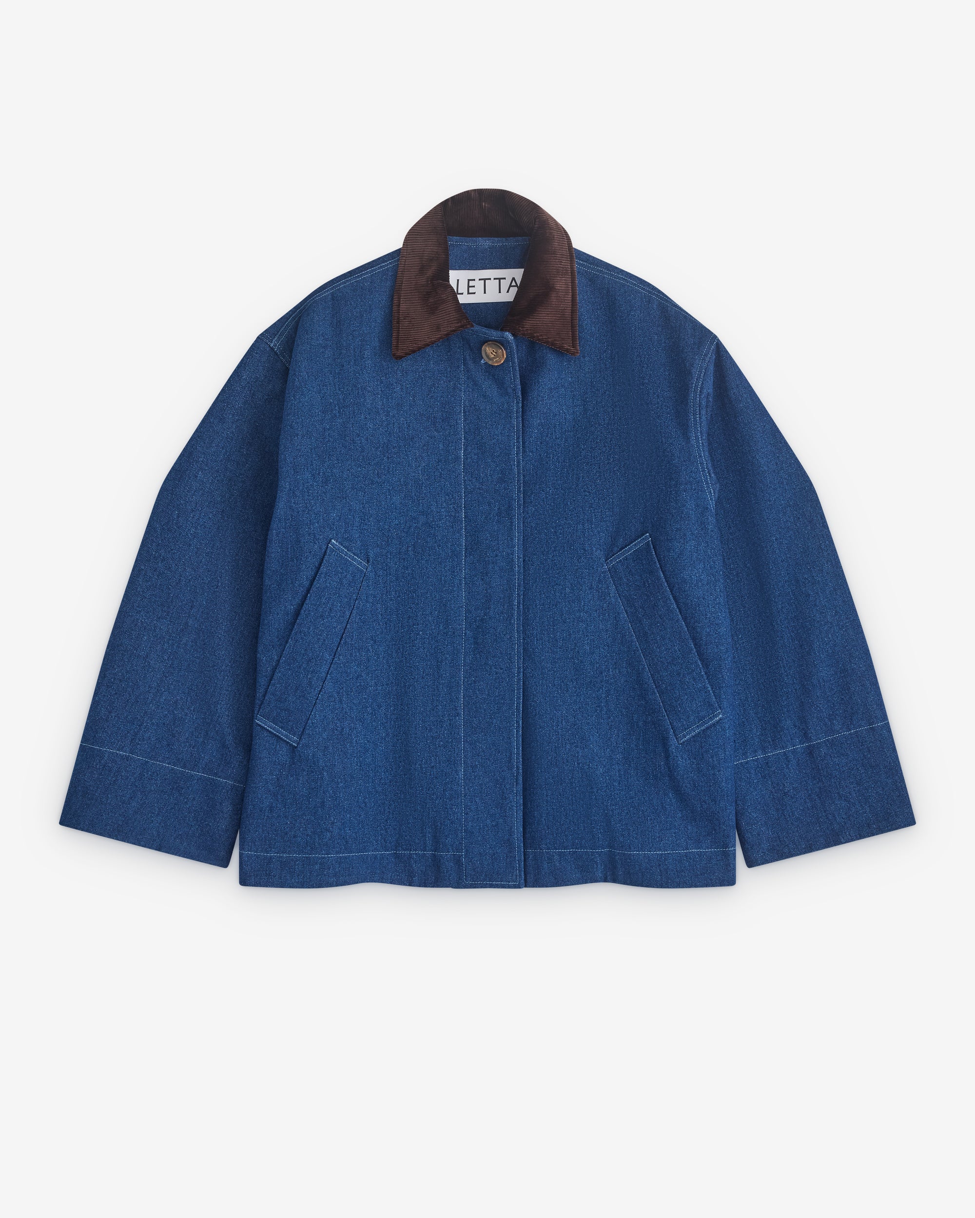 Classic corduroy collarConcealed button closureFront slip pocketsContrast stitchDenim fabric