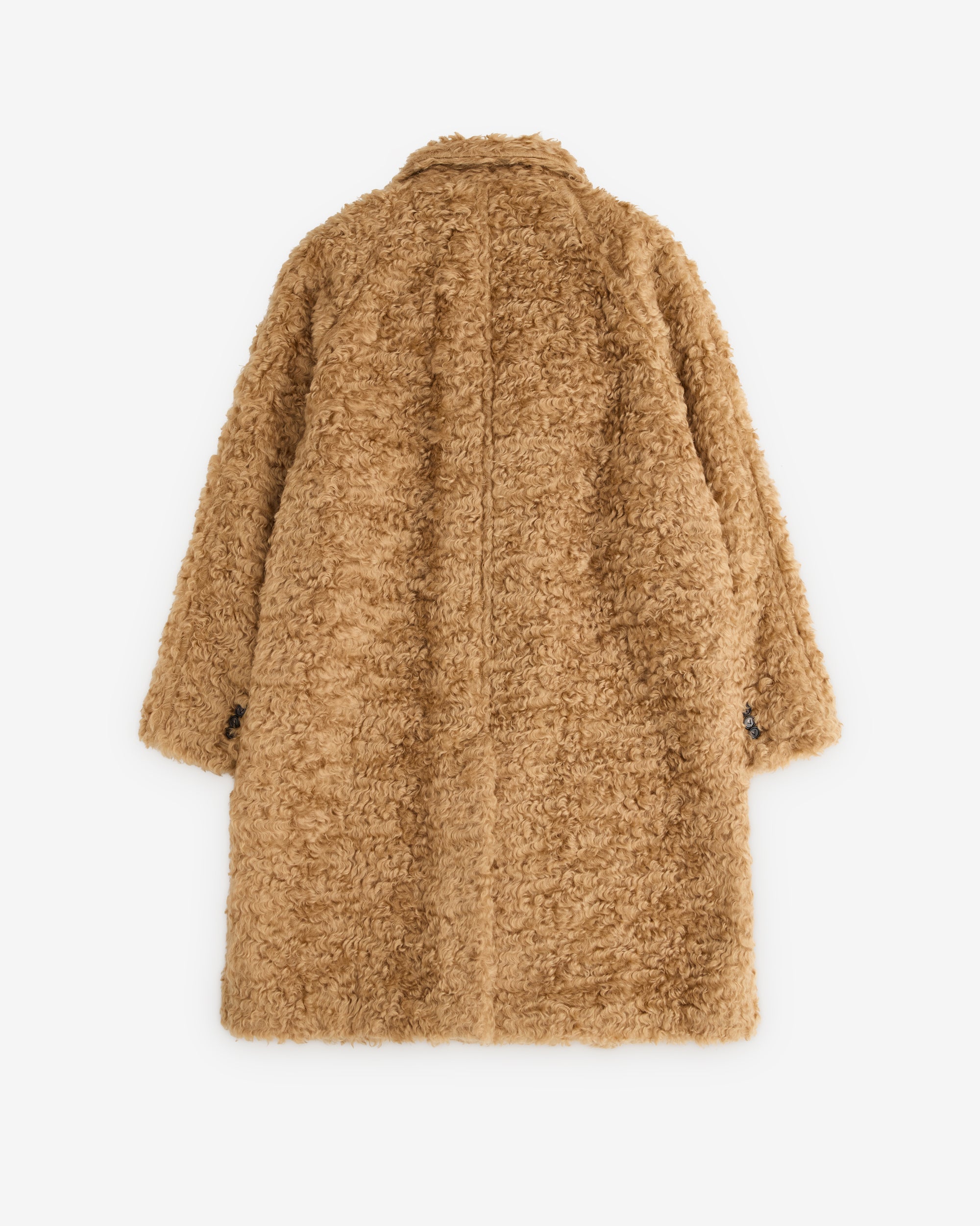 Curly mohair faux fur coatSingle breastedButton closureRed quilted liningRelaxed fit